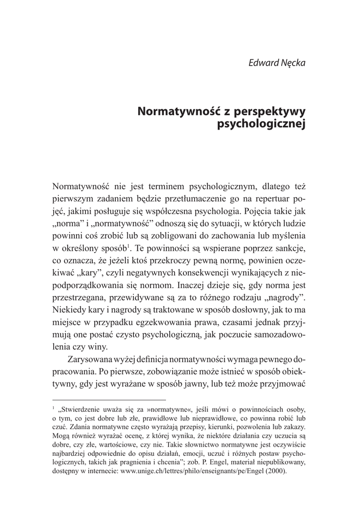 Edward Nęcka Normatywność z perspektywy psychologicznej Normatywność nie jest terminem psychologicznym, dlatego też pierwszym zadaniem będzie przetłumaczenie go na repertuar pojęć, jakimi posługuje się współczesna psychologia. Pojęcia takie jak „norma” i „normatywność” odnoszą się do sytuacji, w których ludzie powinni coś zrobić lub są zobligowani do zachowania lub myślenia w określony sposób1. Te powinności są wspierane poprzez sankcje, co oznacza, że jeżeli ktoś przekroczy pewną normę, powinien oczekiwać „kary”, czyli negatywnych konsekwencji wynikających z niepodporządkowania się normom. Inaczej dzieje się, gdy norma jest przestrzegana, przewidywane są za to różnego rodzaju „nagrody”. Niekiedy kary i nagrody są traktowane w sposób dosłowny, jak to ma miejsce w przypadku egzekwowania prawa, czasami jednak przyjmują one postać czysto psychologiczną, jak poczucie samozadowolenia czy winy. Zarysowana wyżej definicja normatywności wymaga pewnego dopracowania. Po pierwsze, zobowiązanie może istnieć w sposób obiektywny, gdy jest wyrażane w sposób jawny, lub też może przyjmować „Stwierdzenie uważa się za »normatywne«, jeśli mówi o powinnościach osoby, o tym, co jest dobre lub złe, prawidłowe lub nieprawidłowe, co powinna robić lub czuć. Zdania normatywne często wyrażają przepisy, kierunki, pozwolenia lub zakazy. Mogą również wyrażać ocenę, z której wynika, że niektóre działania czy uczucia są dobre, czy złe, wartościowe, czy nie. Takie słownictwo normatywne jest oczywiście najbardziej odpowiednie do opisu działań, emocji, uczuć i różnych postaw psychologicznych, takich jak pragnienia i chcenia”; zob. P. Engel, materiał niepublikowany, dostępny w internecie: www.unige.ch/lettres/philo/enseignants/pe/Engel (2000). 1 236 Edward Nęcka formę ukrytą, która wymaga procesów wnioskowania czy dedukcji. Z jednej strony człowiek powinien przestrzegać pewnych jasnych zasad, takich jak szacunek do osób starszych. Z drugiej jednak strony wciąż jesteśmy zmuszeni odkrywać niepisane zasady życia społecznego, takie jak na przykład wzajemne zapraszanie się na przyjęcia urodzinowe. Złożoność życia społecznego owocuje istnieniem ogromnej ilości niepisanych zasad zachowania lub milczących norm, które muszą być przyswojone podczas indywidualnego rozwoju oraz zastosowane do różnych sytuacji społecznych2. Według stanowiska ewolucyjnego ludzki mózg wyewoluował do bycia tak skomplikowanym organem, ponieważ musiał mierzyć się z coraz to bardziej złożonymi sytuacjami życia społecznego naszych przodków3. Życie społeczne zakłada, że zawsze mamy do czynienia z normami zarówno tymi wypowiedzianymi, jak i niewypowiedzianymi, pisanymi i niepisanymi. Po drugie, normy mogą istnieć w sposób obiektywny jako elementy struktury społecznej lub też mogą odzwierciedlać subiektywne przekonanie, które może mieć niewiele wspólnego z rzeczywistością. Przykładowo ktoś może być przekonany o konieczności bezwarunkowego posłuszeństwa wobec rodziców i starszych krewnych, bez względu na to w jaki sposób się zachowują, jakie są ich intencje i jaki jest kontekst sytuacji. Takie nastawienie może skutkować ogromnym poczuciem winy lub nieadekwatności, ponieważ nadmierne posłuszeństwo wobec starszych jest nie tylko nieosiągalne, ale także niepożądane. W rzeczywistości ludzie muszą sami nauczyć się, które normy, jeżeli w ogóle jakieś, są absolutne, a które mogą lub powinny być stosowane w sposób elastyczny, w zależności od kontekstu i sytuacji. Zbliżamy się do niewidzialnej granicy między mądrością a moralnym permisywizmem. Podczas gdy niektórzy ludzie często wykazują się sztywnymi postawami moralnymi, które wydają się im być koniecznymi warunkami moralnych zachowań, inni są w stanie przy R.J. Sternberg, R.K. Wagner, L. Okagaki, Practical Intelligence: The Nature and Role of Tacit Knowledge in Work and at School, [w:] Mechanisms of Everyday Cognition, red. J.M. Puckett, H.W. Reese, Erlbaum, New Jersey 1993, s. 205–227. 3 B. Wojciszke, Psychologia społeczna, Scholar, Warszawa 2011. 2 Normatywność z perspektywy psychologicznej 237 swajać bardziej adaptacyjne i elastyczne stanowiska wobec norm i zachowań moralnych. Po trzecie, normy odnoszą się zarówno do jawnych zachowań jak i do wewnętrznych stanów umysłu. W pierwszym przypadku normy regulują nasze rzeczywiste zachowania, w drugim natomiast to o czym myślimy i co odczuwamy. W obydwu przypadkach normy wpływają na nas zależnie od kontekstu i znaczenia. Jednakże sankcje związane z ich nieprzestrzeganiem zwykle są ostrzejsze i poważniejsze w przypadku jawnych zachowań, lżejsze natomiast w odniesieniu to stanów wewnętrznych. Innymi słowy, znacznie łatwiej jest przekroczyć normy odnoszące się do naszych przekonań, myśli i uczuć niż normy stosowane do naszego aktualnego, obserwowalnego dla innych zachowania. Społeczeństwo może bowiem tolerować „niewłaściwe” sposoby myślenia, nie tolerując jednocześnie związanych z nimi zachowań. Istnieje wiele uzasadnień dla tej różnicy. Po pierwsze, „niewłaściwe” myślenie może stanowić zagrożenie, ale także może być korzystne jako narzędzie wspierające kreatywność, postęp i zmiany społeczne. Niepokorni myśliciele mogą być irytujący, jednocześnie jednak istnieje zapotrzebowanie społeczne na tego rodzaju jednostki. Następnie, „niewłaściwe” myślenie jest po prostu mniej szkodliwe dla innych niż „niewłaściwe” zachowanie. Umysł jest narzędziem umożliwiającym symulację wielu wariantów, różniących się stopniem realności i zakresem, w jakim naruszone zostać mogą istotne normy. Dopóki takie alternatywne rozwiązania pozostają w ramach naszych wewnętrznych reprezentacji umysłowych, dopóty nie muszą doprowadzić do szkodliwych sankcji. Wreszcie, czło