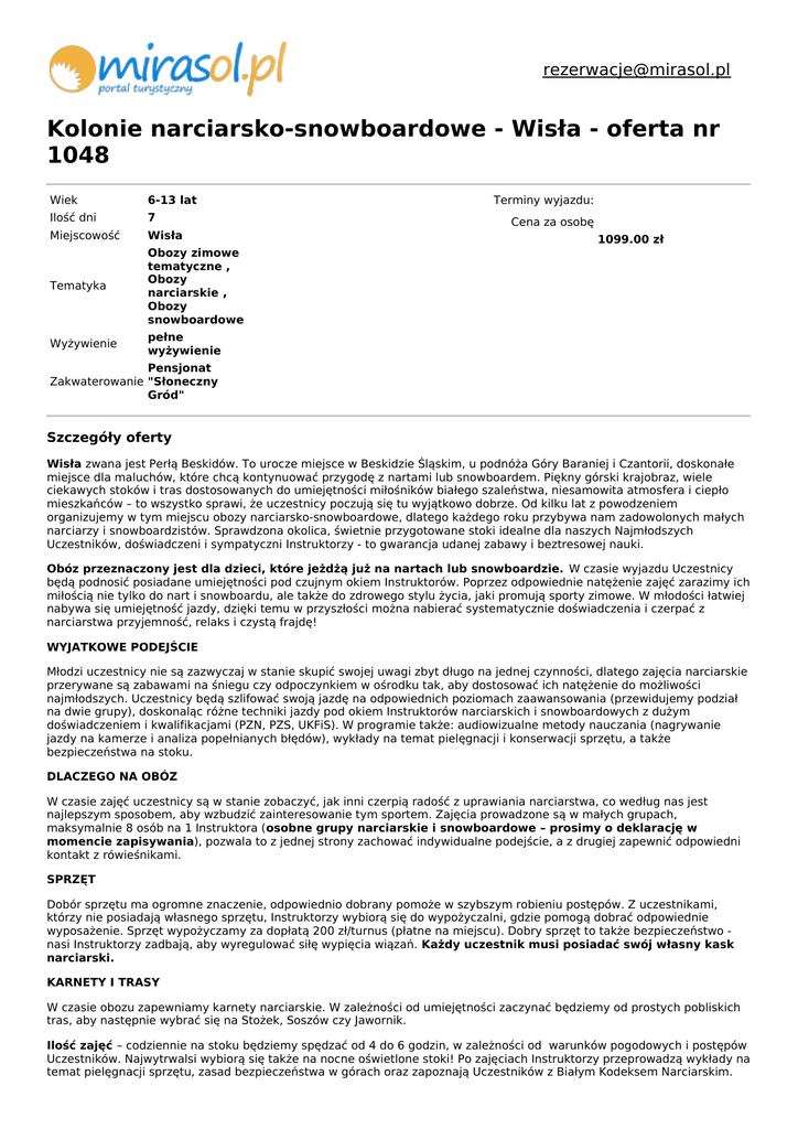[email protected] Kolonie narciarsko-snowboardowe - Wisła - oferta nr 1048 Wiek 6-13 lat Ilość dni 7 Miejscowość Wisła Tematyka Obozy zimowe tematyczne , Obozy narciarskie , Obozy snowboardowe Wyżywienie pełne wyżywienie Terminy wyjazdu: Cena za osobę 1099.00 zł Pensjonat Zakwaterowanie "Słoneczny Gród" Szczegóły oferty Wisła zwana jest Perłą Beskidów. To urocze miejsce w Beskidzie Śląskim, u podnóża Góry Baraniej i Czantorii, doskonałe miejsce dla maluchów, które chcą kontynuować przygodę z nartami lub snowboardem. Piękny górski krajobraz, wiele ciekawych stoków i tras dostosowanych do umiejętności miłośników białego szaleństwa, niesamowita atmosfera i ciepło mieszkańców – to wszystko sprawi, że uczestnicy poczują się tu wyjątkowo dobrze. Od kilku lat z powodzeniem organizujemy w tym miejscu obozy narciarsko-snowboardowe, dlatego każdego roku przybywa nam zadowolonych małych narciarzy i snowboardzistów. Sprawdzona okolica, świetnie przygotowane stoki idealne dla naszych Najmłodszych Uczestników, doświadczeni i sympatyczni Instruktorzy - to gwarancja udanej zabawy i beztresowej nauki. Obóz przeznaczony jest dla dzieci, które jeżdżą już na nartach lub snowboardzie. W czasie wyjazdu Uczestnicy będą podnosić posiadane umiejętności pod czujnym okiem Instruktorów. Poprzez odpowiednie natężenie zajęć zarazimy ich miłością nie tylko do nart i snowboardu, ale także do zdrowego stylu życia, jaki promują sporty zimowe. W młodości łatwiej nabywa się umiejętność jazdy, dzięki temu w przyszłości można nabierać systematycznie doświadczenia i czerpać z narciarstwa przyjemność, relaks i czystą frajdę! WYJATKOWE PODEJŚCIE Młodzi uczestnicy nie są zazwyczaj w stanie skupić swojej uwagi zbyt długo na jednej czynności, dlatego zajęcia narciarskie przerywane są zabawami na śniegu czy odpoczynkiem w ośrodku tak, aby dostosować ich natężenie do możliwości najmłodszych. Uczestnicy będą szlifować swoją jazdę na odpowiednich poziomach zaawansowania (przewidujemy podział na dwie grupy), doskonaląc różne techniki jazdy pod okiem Instruktorów narciarskich i snowboardowych z dużym doświadczeniem i kwalifikacjami (PZN, PZS, UKFiS). W programie także: audiowizualne metody nauczania (nagrywanie jazdy na kamerze i analiza popełnianych błędów), wykłady na temat pielęgnacji i konserwacji sprzętu, a także bezpieczeństwa na stoku. DLACZEGO NA OBÓZ W czasie zajęć uczestnicy są w stanie zobaczyć, jak inni czerpią radość z uprawiania narciarstwa, co według nas jest najlepszym sposobem, aby wzbudzić zainteresowanie tym sportem. Zajęcia prowadzone są w małych grupach, maksymalnie 8 osób na 1 Instruktora (osobne grupy narciarskie i snowboardowe – prosimy o deklarację w momencie zapisywania), pozwala to z jednej strony zachować indywidualne podejście, a z drugiej zapewnić odpowiedni kontakt z rówieśnikami. SPRZĘT Dobór sprzętu ma ogromne znaczenie, odpowiednio dobrany pomoże w szybszym robieniu postępów. Z uczestnikami, którzy nie posiadają własnego sprzętu, Instruktorzy wybiorą się do wypożyczalni, gdzie pomogą dobrać odpowiednie wyposażenie. Sprzęt wypożyczamy za dopłatą 200 zł/turnus (płatne na miejscu). Dobry sprzęt to także bezpieczeństwo nasi Instruktorzy zadbają, aby wyregulować siłę wypięcia wiązań. Każdy uczestnik musi posiadać swój własny kask narciarski. KARNETY I TRASY W czasie obozu zapewniamy karnety narciarskie. W zależności od umiejętności zaczynać będziemy od prostych pobliskich tras, aby następnie wybrać się na Stożek, Soszów czy Jawornik. Ilość zajęć – codziennie na stoku będziemy spędzać od 4 do 6 godzin, w zależności od warunków pogodowych i postępów Uczestników. Najwytrwalsi wybiorą się także na nocne oświetlone stoki! Po zajęciach Instruktorzy przeprowadzą wykłady na temat pielęgnacji sprzętu, zasad bezpieczeństwa w górach oraz zapoznają Uczestników z Białym Kodeksem Narciarskim. POZA STOKIEM: Zimowe Kino - wieczorami, w chwilach odpoczynku, w ciepłych kapciach, z kubkiem pysznego kakao, Uczestnicy zobaczą najfajniejsze bajki i filmy dla Dzieci. Zajęcia z pierwszej pomocy - Dzieci wezmą udział w krótkim kursie postępowania podczas wypadków. Nasz obozowy lekarz opowie im, jak zatamować krwotok, zabandażować rękę oraz jak postępować w przypadku omdlenia. Zajęcia plastyczne – po wyczerpujących zajęciach sportowych Uczestnicy będą mieli okazję puścić wodze fantazji i na specjalnych zajęciach plastycznych rozwinąć swoje artystyczne skrzydła. A ponadto w programie: Gry i zabawy integracyjne, wieczorna dyskoteka przebierana, ognisko, zawody w zjeżdżaniu na jabłuszkach oraz Olimpiada Zimowa i wiele, wiele innych atrakcji. ZAKWATEROWANIE Pensjonat Słoneczny Gród w Wiśle. Wygodne, komfortowe , 3-5 osobowe pokoje z łazienkami. Bezpieczny, ogrodzony teren przystosowany do wypoczynku dzieci i młodzieży. Na terenie ośrodka działają telefony wszystkich sieci. WYŻYWIENIE 4 posiłki dziennie: śniadanie, obiad, w czasie którego wydawany jest podwieczorek (np. batonik, owoc, jogurt), kolacja. Obóz zaczyna i kończy się obiadem. Ostatniego dnia Uczestnicy otrzymują także suchy prowiant na drogę powrotną. CENA ZAWIERA Zakwaterowanie, wyżywienie, program, karnet narciarski, opiekę wychowawców i instruktorów, ubezpieczenie NNW (10.000 zł), materiały programowe. CENA NIE ZAWIERA Dojazdu, opłaty za wypożyczenie sprzętu narciarskiego/snowboardowego na miejscu (200 zł za turnus). CO ZABRAĆ Kask narciarski, dwie czapki, szalik, rękawiczki zwykłe i narciarskie, kombinezon narciarski, odzież na różne temperatury oraz odpowiednie obuwie zimowe, opcjonalnie: narty/snowboard, buty narciarskie/snowboardowe. Przybory do mycia i ręcznik, mały plecak na wyjścia, krem na mróz z filtrem UV. Koniecznie także: legitymację szkolną, poprawnie wypełnio