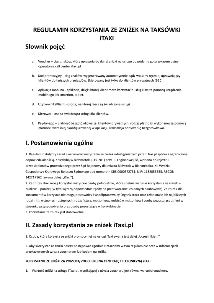 REGULAMIN KORZYSTANIA ZE ZNIŻEK NA TAKSÓWKI iTAXI Słownik pojęć a. Voucher – ciąg znaków, który uprawnia do danej zniżki na usługę po podaniu go przekazem ustnym operatorce call center iTaxi.pl b. Kod promocyjny - ciąg znaków, wygenerowany automatycznie bądź wpisany ręcznie, uprawniający klientów do tańszych przejazdów. Skierowany jest tylko do klientów prywatnych (B2C). c. Aplikacja mobilna - aplikacja, dzięki której klient może korzystać z usług iTaxi za pomocą urządzenia mobilnego jak smartfon, tablet. d. Użytkownik/Klient - osoba, na której rzecz są świadczone usługi. e. Kierowca - osoba świadcząca usługi dla klientów. f. Pay-by-app – płatność bezgotówkowa za klientów prywatnych, rodzaj płatności wykonanej za pomocą płatności wcześniej skonfigurowanej w aplikacji. Transakcja odbywa się bezgotówkowo. I. Postanowienia ogólne 1. Regulamin dotyczy zasad i warunków korzystania ze zniżek udostępnianych przez iTaxi.pl spółka z ograniczoną odpowiedzialnością, z siedzibą w Białymstoku (15-281) przy ul. Legionowej 28, wpisana do rejestru przedsiębiorców prowadzonego przez Sąd Rejonowy dla miasta Białystok w Białymstoku, XII Wydział Gospodarczy Krajowego Rejestru Sądowego pod numerem KRS 0000372761, NIP: 1182053355, REGON 142717162 (zwana dalej: „iTaxi”). 2. Ze zniżek iTaxi mogą korzystać wszystkie osoby pełnoletnie, które spełnią warunki korzystania ze zniżek w punkcie II poniżej (w tym wyrażą odpowiednie zgody na przetwarzanie ich danych osobowych). Ze zniżek dla konsumentów korzystać nie mogą pracownicy i współpracownicy Organizatora oraz członkowie ich najbliższych rodzin. tj.: wstępnych, zstępnych, rodzeństwa, małżonków, rodziców małżonków i osoby pozostające z nimi w stosunku przysposobienia oraz osoby pozostające w konkubinacie. 3. Korzystanie ze zniżek jest dobrowolne. II. Zasady korzystania ze zniżek iTaxi.pl 1. Osoba, która korzysta ze zniżki promocyjnej na usługi iTaxi zwana jest dalej „Uczestnikiem”. 2. Aby skorzystać ze zniżki należy postępować zgodnie z zasadami w tym regulaminie oraz w informacjach przekazywanych wraz z voucherem lub kodem na zniżkę. KORZYSTANIE ZE ZNIŻKI ZA POMOCĄ VOUCHERU NA CENTRALĘ TELEFONICZNĄ iTAXI 1. Wartość zniżki na usługę iTaxi.pl, wynikającej z użycia voucheru jest równa wartości voucheru. 2. Aby skorzystać z voucheru na centralę telefoniczną iTaxi, należy: - zadzwonić pod numer 737 737 737 w okresie obowiązywania zniżki na dany voucher, - podać nazwę voucheru ustnie i zamówić taksówkę ze wskazaniem adresu, pod który ma przyjechać. 3. Wartość zniżki zostanie odjęta od całkowitej wartości zamawianego przejazdu. 4. W przypadku kiedy pasażer wsiądzie do taksówki iTaxi bez zamówienia jej za pośrednictwem centrali telefonicznej, hasło promocyjne na centralę nie może zadziałać, a zniżka na kurs nie będzie naliczona. 5. Dni obowiązywania voucheru na centralę telefoniczną oraz jego nazwa są zgodne z informacjami przekazywanymi przez źródło, z którego uczestnik dowiedział się o promocji. KORZYSTANIE ZE ZNIŻKI ZA POMOCĄ KODU PROMOCYJNEGO DO APLIKACJI MOBILNEJ iTAXI 1. Wartość zniżki na usługę iTaxi.pl, wynikającej z użycia kodu promocyjnego jest równa wartości tego kodu. 2. Aby skorzystać z kodu promocyjnego do aplikacji mobilnej iTaxi, należy posiadać zainstalowaną aplikację iTaxi na telefonie lub tablecie z systemem iOS lub Android (kody promocyjne nie działają na telefonach z systemem Windows Phone) oraz aktywnym połączeniem z internetem i zarejestrować się w aplikacji. Aby kod promocyjny do aplikacji aktywował zniżkę podczas kursu, kurs musi być zamówiony z dodaną i ustawioną jako formę płatności za kurs płatnością przez aplikację, to jest kierującą do dodanej w aplikacji karty Visa, Master Card lub konta PayPal. Z kodu można skorzystać tylko na koncie prywatnym w aplikacji. 3. W przypadku kiedy pasażer wsiądzie do taksówki iTaxi bez zamówienia jej za pośrednictwem aplikacji mobilnej, kod promocyjny do aplikacji mobilnej nie może zadziałać, a zniżka na kurs nie będzie naliczona. 4. Kod należy wprowadzić w aplikacji, w pozycji Kody promocyjne. Aplikacja pokaże informację, czy Kod został wpisany poprawnie i czy jest aktywny. Aplikacja pokaże okres ważności kodu promocyjnego oraz jego wartość. 5. Jeśli kod jest poprawny i aktywny, zniżka zostanie naliczona przy najbliższym kursie zamówionym przez aplikację iTaxi, który spełni warunki korzystania ze zniżki, według charakterystyki kodu zniżkowego wskazanej w aplikacji oraz zasad powyżej, eśli zamówienie kursu będzie miało miejsce w okresie, w którym kod jest aktywny, przy czym liczy się moment akceptacji zapytania o kurs przez kierowcę. III. Przetwarzanie danych osobowych 1. Poprzez korzystanie ze zniżki na taksówki iTaxi Uczestnik oświadcza, że wyraża zgodę na gromadzenie, przetwarzanie oraz wykorzystywanie przez iTaxi podanych danych osobowych w zakresie niezbędnym do wykonania czynności iTaxi opisanych w §2, a także do celów marketingowych. Przetwarzanie danych osobowych Uczestnika odbywać się będzie w zakresie oraz na zasadach określonych w przepisach ustawy z dnia 18 lipca 2002 r. o świadczeniu usług drogą elektroniczną (Dz. U. z 2002 r. Nr 144, poz. 1204 z późn. zm.) (dalej: „Ustawa o Świadczeniu Usług Drogą Elektroniczną”) oraz w przepisach ustawy z dnia 29 sierpnia 1997 r. o ochronie danych osobowych (tekst jednolity: Dz. U. z 2002 r. Nr 101, poz. 926). Uczestnik ma prawo wglądu w swoje dane osobowe przekazane iTaxi. Po zakończeniu Promocji, iTaxi jest uprawniony do przetwarzania danych, o których mowa w art. 19 ust. 2 Ustawy o Świadczeniu Usług Drogą Elektroniczną. 2. Uczestnik może w każdym czasie wyrazić lub odwołać zgodę, o której mowa w niniejszym § 3 pkt. 1 i 3, poprzez wysłanie oświadczenia z wyrażen