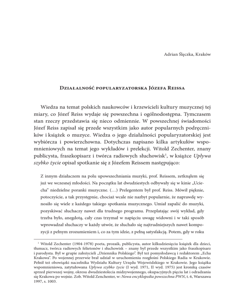 Adrian Ślęczka, Kraków D J R Wiedza na temat polskich naukowców i krzewicieli kultury muzycznej tej miary, co Józef Reiss wydaje się powszechna i ogólnodostępna. Tymczasem stan rzeczy przedstawia się nieco odmiennie. W powszechnej świadomości Józef Reiss zapisał się przede wszystkim jako autor popularnych podręczników i książek o muzyce. Wiedza o jego działalności popularyzatorskiej jest wybiórcza i powierzchowna. Dotychczas napisano kilka artykułów wspomnieniowych na temat jego wykładów i prelekcji. Witold Zechenter, znany publicysta, fraszkopisarz i twórca radiowych słuchowisk1, w książce Upływa szybko życie opisał spotkanie się z Józefem Reissem następująco: Z innym działaczem na polu upowszechniania muzyki, prof. Reissem, zetknąłem się już we wczesnej młodości. Na początku lat dwudziestych odbywały się w kinie „Uciecha” niedzielne poranki muzyczne. (…) Prelegentem był prof. Reiss. Mówił pięknie, potoczyście, a tak przystępnie, chociaż wcale nie nazbyt popularnie, że naprawdę wynosiło się wiele z każdego takiego spotkania muzycznego. Umiał zapalić do muzyki, pozyskiwać słuchaczy nawet dla trudnego programu. Przeplatając swój wykład, gdy trzeba było, anegdotą, cały czas trzymał w napięciu uwagę widowni i w taki sposób wprowadzał słuchaczy w każdy utwór, że słuchało się najtrudniejszych nawet kompozycji z pełnym zrozumieniem i, co za tym idzie, z pełną satysfakcją. Potem, gdy w roku 1 Witold Zechenter (1904-1978) poeta, prozaik, publicysta, autor kilkudziesięciu książek dla dzieci, tłumacz, twórca radiowych felietonów i słuchowisk – znany był przede wszystkim jako fraszkopisarz i parodysta. Był w grupie założycieli „Dziennika Polskiego”. Był też pomysłodawcą i redaktorem „Echa Krakowa”. Po wojennej przerwie brał udział w uruchomieniu rozgłośni Polskiego Radia w Krakowie. Pełnił też obowiązki naczelnika Wydziału Kultury Urzędu Wojewódzkiego w Krakowie. Jego książka wspomnieniowa, zatytułowana Upływa szybko życie (I wyd. 1971, II wyd. 1975) jest kroniką czasów sprzed pierwszej wojny, okresu dwudziestolecia midzywojennego, okupacyjnych pięciu lat i odradzania się Krakowa po wojnie. Zob. Witold Zenchenter, w: Nowa encyklopedia powszechna PWN PWN, t. 6, Warszawa 1997, s. 1003. 2 Adrian Ślęczka 1927 powstała w Krakowie rozgłośnia radiowa, znalazł się profesor w kręgu jej stałych prelegentów i znów – przed mikrofonem – prowadził swoje znakomite pogadanki muzyczne. Zakochany w muzyce polskiej, mówił o niej porywająco, a zarazem fachowo, pisał podręczniki, monografie, wykładał na uniwersytecie, działał we wszystkich placówkach, jakie zajmowały się szerzeniem kultury muzycznej. Był entuzjastą muzyki, jej prekursorskim propagatorem, sam robił to, co dziś czynią całe instytucje2. Inną charakterystykę osobowości Reissa zamieścił w swoich wspomnieniach Henryk Vogler3 – pisarz i krytyk oraz były uczeń Józefa Reissa w gimnazjum św. Jacka w Krakowie: (…) Mały, zawsze skulony w sobie i jakby nieco zziębnięty, z szyderczym i nerwowym skrzywieniem ust, profesor doktor Józef Reiss, muzykolog, autor Historii muzyki polskiej, docent Uniwersytetu Jagiellońskiego, był człowiekiem o bystrej, ruchliwej inteligencji i wszechstronnym wykształceniu. Miał specyficzny sposób mówienia: przez zaciśnięte wąskie wargi drwiącym półszeptem i z ironicznym uśmieszkiem. Należało to do elementów, składających się na osobowość trochę neurasteniczną, może nawet hipochondryczną, ale oryginalną i – właśnie wskutek tego – intrygującą oraz w jakiś sposób fascynującą uczniów, przyzwyczajonych do szkolnej „normalności”. Reiss był niezwykle uczulony na rozmaitego rodzaju dźwięki, niektóre, zwłaszcza nasilające się, doprowadzały go niemal do rozpaczy. Mówiono, że miał rozstrojony słuch i dlatego – mimo, że zajmował się naukowo problemami muzyki – nie chodził nigdy na koncerty. Pewnego dnia, kiedy po wejściu do naszej klasy, mieszczącej się wtedy na najwyższym piętrze, usłyszał stukot narzędzi robotników naprawiających dach budynku, syknął z bólu i bez namysłu polecił uczniom opuścić salę, a lekcję odbył na wolnym powietrzu4. W historii muzykologii polskiej postać Józefa Reissa jest interesująca ze względu na połączenie w jednej osobie muzykologa, nauczyciela, historyka, krytyka muzycznego, prelegenta i publicysty. Szerokie zainteresowania humaWitold Zechenter, Upływa szybko życie, Kraków 1971, s. 149. Henryk Vogler (1911-2005) pisarz i krytyk literacki, pierwszy redaktor naczelny Wydawnictwa Literackiego. Był autorem powieści psychologiczno-obyczajowych na temat m.in. martyrologii Żydów, utworów scenicznych, słuchowisk, szkiców literackich. Kierownik artystyczny teatru im. Słowackiego; redaktor „Życia Literackiego”, publikował m.in. w „Ziemi Kaliskiej” i „Południowej Wielkopolsce”. Zob. Henryk Vogler, w: Nowa encyklopedia powszechna PWN PWN, t. 6, Warszawa 1997, s. 622. 4 Zob. Witold Zechenter, Upływa szybko życie, op. cit., s. 149. 2 3 Działalność popularyzatorska Józefa Reissa 3 nistyczne wykazywał Reiss już jako student. W roku 1898 podjął w Krakowie studia medyczne, jednak po roku zmienił kierunek kształcenia przenosząc się na Wydział Filozoficzny Uniwersytetu Jagiellońskiego. W 1902 roku na seminarium filozoficznym napisał rozprawę o Schopenhauerze, poruszając w niej m.in. zagadnienia z dziedziny metafizyki i estetyki muzycznej. W roku 1907 złożył przed komisją egzaminacyjną dwie obszerne prace z zakresu historii i geografii. Wkrótce wystosował wniosek o dopuszczenie go do egzaminu nauczycielskiego, który zdał w Krakowie w 1908. Jak zauważył Franciszek German w artykule poświęconym związkom profesora Reissa ze Śląskiem5, drugi etap studiów uniwersyteckich Reissa nie mógł być systematyczny, poniewa