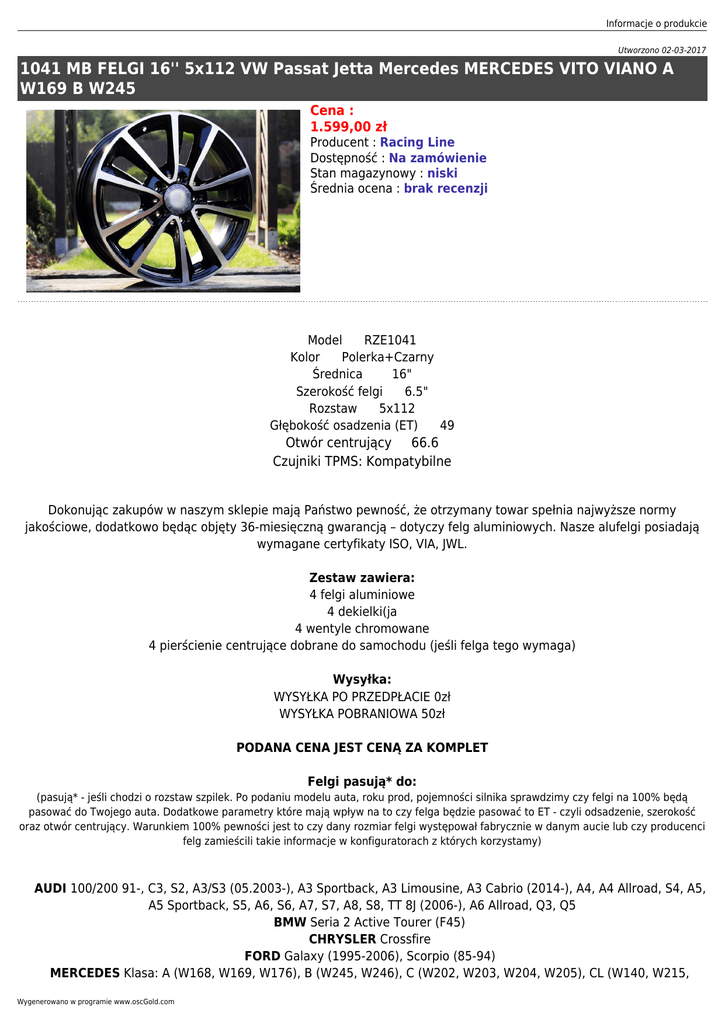 Informacje o produkcie Utworzono 02-03-2017 1041 MB FELGI 16'' 5x112 VW Passat Jetta Mercedes MERCEDES VITO VIANO A W169 B W245 Cena : 1.599,00 zł Producent : Racing Line Dostępność : Na zamówienie Stan magazynowy : niski Średnia ocena : brak recenzji Model RZE1041 Kolor Polerka+Czarny Średnica 16" Szerokość felgi 6.5" Rozstaw 5x112 Głębokość osadzenia (ET) 49 Otwór centrujący 66.6 Czujniki TPMS: Kompatybilne Dokonując zakupów w naszym sklepie mają Państwo pewność, że otrzymany towar spełnia najwyższe normy jakościowe, dodatkowo będąc objęty 36-miesięczną gwarancją – dotyczy felg aluminiowych. Nasze alufelgi posiadają wymagane certyfikaty ISO, VIA, JWL. Zestaw zawiera: 4 felgi aluminiowe 4 dekielki(ja 4 wentyle chromowane 4 pierścienie centrujące dobrane do samochodu (jeśli felga tego wymaga) Wysyłka: WYSYŁKA PO PRZEDPŁACIE 0zł WYSYŁKA POBRANIOWA 50zł PODANA CENA JEST CENĄ ZA KOMPLET Felgi pasują* do: (pasują* - jeśli chodzi o rozstaw szpilek. Po podaniu modelu auta, roku prod, pojemności silnika sprawdzimy czy felgi na 100% będą pasować do Twojego auta. Dodatkowe parametry które mają wpływ na to czy felga będzie pasować to ET - czyli odsadzenie, szerokość oraz otwór centrujący. Warunkiem 100% pewności jest to czy dany rozmiar felgi występował fabrycznie w danym aucie lub czy producenci felg zamieścili takie informacje w konfiguratorach z których korzystamy) AUDI 100/200 91-, C3, S2, A3/S3 (05.2003-), A3 Sportback, A3 Limousine, A3 Cabrio (2014-), A4, A4 Allroad, S4, A5, A5 Sportback, S5, A6, S6, A7, S7, A8, S8, TT 8J (2006-), A6 Allroad, Q3, Q5 BMW Seria 2 Active Tourer (F45) CHRYSLER Crossfire FORD Galaxy (1995-2006), Scorpio (85-94) MERCEDES Klasa: A (W168, W169, W176), B (W245, W246), C (W202, W203, W204, W205), CL (W140, W215, Wygenerowano w programie www.oscGold.com W216), CLA (C117), CLC, CLK (W208, W209), CLS (W219, W218), E (W207, W124, W210, W211, W212, W213), GLA (X156), GLC, GLE, GLK (X204), GL (X164, X166), M, ML (W163, W164, W166), R (W251), S (W140, W220, W221, W222), SL (W129, W230, W231), SLC, SLK (W170, W171, W172), SLR (W199), SLS AMG (W197), V, Vaneo (W414), Viano (W639), Vito (W638, W639), 190 (w201), 123, 124 coupe MINI Cooper (2014-), Cooper S (2014-), One (2014-) PORSCHE Macan SEAT Alhambra, Altea, Altea Freetrack, Altea XL, Exeo, Leon II III (1P, 5F od 2005-), Leon Cupra (2005-), Leon SC, Leon ST, Toledo III (2004-), Toledo IV SKODA Octavia II, Octavia III, Octavia Scout, Superb I, Superb II, Yeti VW Golf V, VI, VII, Golf Plus, Caddy, Caddy Maxi, Touran, Touran Cross, The Beetle (2011-), EOS, Jetta, Sharan, Passat (B5, B6, B7, B8), Passat CC, Passat W8, Phaeton, Scirocco (2008-), Tiguan, T2, T4 Caravelle Zgodnie z Kodeksem PWP art.156 ust 3, emblematy widoczne na felgach mają charakter wyłącznie informacyjny i nie należy się tym sugerować, że jest to produkt oryginalny danego producenta samochodu. Alufelgi dobieramy wg parametrów katalogowych producentów. W przypadku niektórych modeli aut lub felg zachodzi konieczność zastosowania dystansów, śrub/nakrętek ampułkowych. Ponieważ, zawsze może zajść taka sytuacja w której katalog/konfigurator wprowadzi w błąd sprzedawcę zaleca się przed montażem opon przyłożyć felgę na piastę i sprawdzić czy felga nigdzie nie będzie obcierać. Po założeniu opon zwrot felg będzie nie możliwy.