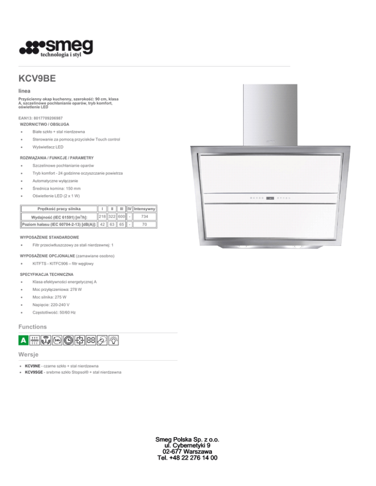 KCV9BE linea Przyścienny okap kuchenny, szerokość: 90 cm, klasa A, szczelinowe pochłanianie oparów, tryb komfort, oświetlenie LED EAN13: 8017709206987 WZORNICTWO / OBSŁUGA Białe szkło + stal nierdzewna Sterowanie za pomocą przycisków Touch control Wyświetlacz LED ROZWIĄZANIA / FUNKCJE / PARAMETRY Szczelinowe pochłanianie oparów Tryb komfort - 24 godzinne oczyszczanie powietrza Automatyczne wyłączanie Średnica komina: 150 mm Oświetlenie LED (2 x 1 W) Prędkość pracy silnika 3 Wydajność (IEC 61591) [m /h]: I II III 218 322 600 Poziom hałasu (IEC 60704-2-13) [dB(A)]: 42 63 65 IV Intensywny - 734 - 70 WYPOSAŻENIE STANDARDOWE Filtr przeciwtłuszczowy ze stali nierdzewnej: 1 WYPOSAŻENIE OPCJONALNE (zamawiane osobno) KITFTS - KITFC906 – filtr węglowy SPECYFIKACJA TECHNICZNA Klasa efektywności energetycznej A Moc przyłączeniowa: 278 W Moc silnika: 275 W Napięcie: 220-240 V Częstotliwość: 50/60 Hz Functions Wersje KCV9NE - czarne szkło + stal nierdzewna KCV9SGE - srebrne szkło Stopsol® + stal nierdzewna Smeg Polska Sp. z o.o. ul. Cybernetyki 9 02-677 Warszawa Tel. +48 22 276 14 00 KCV9BE linea przyścienne 90 cm białe szkło + stal nierdzewna Klasa A: Klasa A piekarnika zapewnia niskie zużycie energii. FILT PRZECIWTŁUSZCZOWY: Wielowarstwowe filtry, wykonane ze stali nierdzewnej lub aluminium, stanowią idealne rozwiązanie w oczyszczaniu tłustych oparów powstałych podczas gotowania. TRYB INTENSYWNY: Tryb intensywny pozwala na uruchomienie okapu z maksymalną wydajnością, tak aby w sposób istotny przyspieszyć niwelowanie najbardziej uporczywych zapachów powstałych podczas gotowania. TRYB KOMFORT: Tryb komfort tworzy ciągłą cyrkulację powietrza w pomieszczeniu tak, aby zachować je czyste przez 24 godziny non-stop. AUTOMATYCZNE WYŁĄCZENIE: Funkcja ta pozwala na automatyczne wyłączenie okapu po upływie zaprogramowanego czasu. Okap kontynuuje proces oczyszczania powietrza podczas ustawionego czasu, a następnie wyłącza się automatycznie. SZCZELINOWE ZASYSANIE: Powietrze jest zasysane szczelinowo, dzięki czemu wzrasta wydajność urządzenia, a maleje poziom hałasu wytwarzane przez urządzenie. WYŚWIETLACZ ELEKTRONICZNY: Niektóre modele sa wyposażone w wyświetlacz elektroniczny STEROWANIE DOTYKOWE: Niektóre modele piekarników, płyt grzewczych i okapy firmy SMEG posiadają panele dotykowe, co daje poczucie komfortu użytkowania i jest bardzo łatwe w utrzymaniu czystości. OŚWIETLENIE: Okapy zostały wyposażone w oświetlenie standardowe lub halogenowe, zależnie od modelu. Oświetlenie może być aktywowane podczas pracy wentylatora okapu lub niezależnie, dając możliwość oświetlenia blatu kuchennego podczas codziennych czynności. Smeg Polska Sp. z o.o. ul. Cybernetyki 9 02-677 Warszawa Tel. +48 22 276 14 00 KCV9BE linea przyścienne 90 cm białe szkło + stal nierdzewna Smeg Polska Sp. z o.o. ul. Cybernetyki 9 02-677 Warszawa Tel. +48 22 276 14 00