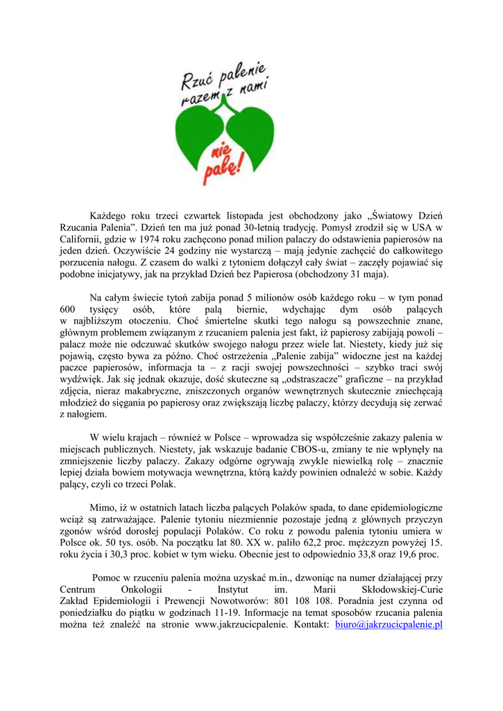 Każdego roku trzeci czwartek listopada jest obchodzony jako „Światowy Dzień Rzucania Palenia”. Dzień ten ma już ponad 30-letnią tradycję. Pomysł zrodził się w USA w Californii, gdzie w 1974 roku zachęcono ponad milion palaczy do odstawienia papierosów na jeden dzień. Oczywiście 24 godziny nie wystarczą – mają jedynie zachęcić do całkowitego porzucenia nałogu. Z czasem do walki z tytoniem dołączył cały świat – zaczęły pojawiać się podobne inicjatywy, jak na przykład Dzień bez Papierosa (obchodzony 31 maja). Na całym świecie tytoń zabija ponad 5 milionów osób każdego roku – w tym ponad 600 tysięcy osób, które palą biernie, wdychając dym osób palących w najbliższym otoczeniu. Choć śmiertelne skutki tego nałogu są powszechnie znane, głównym problemem związanym z rzucaniem palenia jest fakt, iż papierosy zabijają powoli – palacz może nie odczuwać skutków swojego nałogu przez wiele lat. Niestety, kiedy już się pojawią, często bywa za późno. Choć ostrzeżenia „Palenie zabija” widoczne jest na każdej paczce papierosów, informacja ta – z racji swojej powszechności – szybko traci swój wydźwięk. Jak się jednak okazuje, dość skuteczne są „odstraszacze” graficzne – na przykład zdjęcia, nieraz makabryczne, zniszczonych organów wewnętrznych skutecznie zniechęcają młodzież do sięgania po papierosy oraz zwiększają liczbę palaczy, którzy decydują się zerwać z nałogiem. W wielu krajach – również w Polsce – wprowadza się współcześnie zakazy palenia w miejscach publicznych. Niestety, jak wskazuje badanie CBOS-u, zmiany te nie wpłynęły na zmniejszenie liczby palaczy. Zakazy odgórne ogrywają zwykle niewielką rolę – znacznie lepiej działa bowiem motywacja wewnętrzna, którą każdy powinien odnaleźć w sobie. Każdy palący, czyli co trzeci Polak. Mimo, iż w ostatnich latach liczba palących Polaków spada, to dane epidemiologiczne wciąż są zatrważające. Palenie tytoniu niezmiennie pozostaje jedną z głównych przyczyn zgonów wśród dorosłej populacji Polaków. Co roku z powodu palenia tytoniu umiera w Polsce ok. 50 tys. osób. Na początku lat 80. XX w. paliło 62,2 proc. mężczyzn powyżej 15. roku życia i 30,3 proc. kobiet w tym wieku. Obecnie jest to odpowiednio 33,8 oraz 19,6 proc. Pomoc w rzuceniu palenia można uzyskać m.in., dzwoniąc na numer działającej przy Centrum Onkologii Instytut im. Marii Skłodowskiej-Curie Zakład Epidemiologii i Prewencji Nowotworów: 801 108 108. Poradnia jest czynna od poniedziałku do piątku w godzinach 11-19. Informacje na temat sposobów rzucania palenia można też znaleźć na stronie www.jakrzucicpalenie. Kontakt: [email protected] Jednocześnie informujemy, że nowelizacja ustawy „antytytoniowej” zawiera m.in. przepisy dotyczące: ustanowienia zakazu wprowadzania do obrotu papierosów posiadających charakterystyczny aromat (wyjątkiem są papierosy mentolowe, na które ustanowiono okres przejściowy do 2020 r.) wprowadzenia obowiązku umieszczania na opakowaniach wyrobów tytoniowych mieszanych ostrzeżeń zdrowotnych zajmujących 65% zewnętrznego obszaru opakowania, przepisy obligujące producentów lub importerów wyrobów tytoniowych do przekazywania wykazu wszystkich składników używanych do produkcji wyrobów tytoniowych. Ustawa przewiduje również zakaz sprzedaży papierosów elektronicznych osobom niepełnoletnim. Wszyscy palący e-papierosy muszą przestrzegać zakazów, do których muszą stosować się palacze zwykłych papierosów. Szacuje się, że około 3 proc. Polaków pali e-papierosy. Papierosy elektroniczne, podobnie jak tradycyjne, nie mogą być palone w miejscach publicznych. E-papierosy zostaną również objęte zakazem reklamy, tak jak obecnie wyroby tytoniowe. Ich producenci i importerzy, nie mogą sponsorować imprez sportowych, kulturalnych, oświatowych i zdrowotnych. Za palenie w miejscach publicznych trzeba będzie zapłacić mandat w wysokości 500 zł. Za złamanie zakazu reklamy kara wyniesie 200 tys. zł. Zakazane jest detaliczne sprzedawanie i kupowanie przez internet e-papierosów i płynów z nikotyną do nich, zarówno w kraju jak i za granicą. Zakazem sprzedaży zostały objęte również papierosy „smakowe” i tytoń do samodzielnego skręcania – z wyłączeniem tych z dodatkiem mentolu, którego zakaz stosowania będzie obowiązywał dopiero od 2020 r. Oznacza to, że papierosy mentolowe będzie można kupować jeszcze przez 5 lat. W przypadku wyrobów tytoniowych na opakowaniach jednostkowych i zbiorczych będzie obowiązek umieszczania mieszanych ostrzeżeń zdrowotnych, tj. graficznych (zdjęcia zmian chorobowych) i tekstowych. Obecnie na takich opakowaniach umieszczany jest wyłącznie tekst. Na opakowaniach papierosów elektronicznych zostanie zamieszczona informacja o wszystkich zawartych w nich składnikach i ich ilościach oraz pojawi się odpowiednie ostrzeżenie zdrowotne. Koszty leczenia związane z używaniem wyrobów tytoniowych wynoszą ok. 18 mld zł rocznie, natomiast koszty wynikające z mniejszej wydajności i nieobecności w pracy to ok. 15 mld zł rocznie. Z danych resortu zdrowia wynika, że liczba zgonów bezpośrednio wynikających z palenia tytoniu wynosi w Polsce od 67 tys. do 90 tys. przypadków rocznie. Szacuje się, że 38 proc. wszystkich zgonów mężczyzn w wieku 38-69 lat ma związek z paleniem tytoniu, z czego 55 proc. zgonów wynika bezpośrednio z nowotworu powstałego na skutek palenia tytoniu . Z powodu biernej ekspozycji na dym tytoniowy umiera rocznie blisko 2 tys. niepalących, głównie z powodu choroby niedokrwiennej serca, udaru mózgu, raka płuca i przewlekłych chorób układu oddechowego