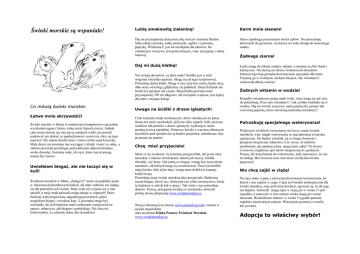 Świnki morskie są wspaniałe! Lubię smakowitą zieleninę! Karm mnie sianem! Daj mi przynajmniej dużą miseczkę warzyw dziennie Bardzo lubię sałatę rzymską, natkę pietruszki, ogórki i czerwoną paprykę. Witamina C jest mi niezbędna dla zdrowia. Im ciemniejsze warzywa, tym pożywniejsze, więc zrezygnuj z sałaty lodowej. Siano zapobiega przerastaniu moich zębów. Nie potrzebuję drewienek do gryzienia, wystarczy mi stały dostęp do smacznego sianka. Daj mi dużą klatkę! Łuski mogą mi utknąć między zębami, a nasiona są zbyt tłuste i kaloryczne. Nie dawaj mi zboża i kolorowych okruchów. Zamiast tego kup granulat przeznaczony specjalnie dla mnie. Trzymaj go w ciemnym, suchym miejscu, aby witamina C zachowała dłużej wartość. Nie cierpię akwariów, są takie małe! Ściółka jest w nich wilgotna i brzydko pachnie. Mogę się od tego rozchorować. Potrzebuję dużej klatki. Mogę w niej zażywać ruchu, kiedy chcę, albo uciec od kolegi, gdybyśmy się pokłócili. Dużych klatek nie trzeba też sprzątać tak często. Moja klatka powinna mieć przynajmniej 100 cm długości, ale im będzie większa, tym lepiej dla mnie i mojego kolegi. Co mówią świnki morskie: Łatwo mnie skrzywdzić! Świnki morskie w filmie to animowani komputerowo specjalnie wyszkoleni agenci, którzy robią wiele fajnych rzeczy. Jednak cała reszta świnek nie zna się na sztukach walki, nie potrafi nurkować ani skakać ze spadochronem i nawet nie chce się tego nauczyć! My mamy kruche kości i łatwo zrobić nam krzywdę. Małe dzieci nie powinny nas wyciągać z klatek i nosić ze sobą, a zabawa powinna przebiegać pod nadzorem odpowiedzialnej osoby dorosłej. Jesteśmy małe, ale ręce, które nas trzymają, muszą być mocne. Uwielbiam biegać, ale nie toczyć się w kuli! Świnkom morskim w filmie „Załoga G” może się podobać jazda w śmiesznych plastikowych kulach, ale takie zabawki nie nadają się dla prawdziwych świnek. Moje ciało nie wygina się w taki sposób, a moje małe paluszki mogą utknąć w szparach! Dużo bardziej wolę bezpieczną, odgrodzoną przestrzeń, gdzie mogłabym biegać i zwiedzać kąty. Z początku mogę być nieśmiała, ale jeśli będziesz mnie codziennie wypuszczał na spacer, zobaczysz, jak biegam i podskakuję. Nie chcę też kołowrotków, to zabawki dobre dla chomików! Uwaga na ściółki z drzew iglastych! Cedr wydziela olejki aromatyczne, które szkodzą mi na płuca. Sosna też może zaszkodzić, jeśli ma silny zapach. Jeśli używasz wiórków lub peletów z drzew iglastych, wybieraj te, które pachną żywicą najsłabiej. Polarowe kocyki z warstwą chłonnych ręczników pod spodem też są bardzo przytulne; zabrudzone rzuć po prostu do prania! Chcę mieć przyjaciela! Może ci się wydawać, że jesteśmy przyjaciółmi, ale ja nie chcę mieszkać z innymi zwierzętami, takimi jak myszy, króliki, chomiki, czy krety. Oni jedzą co innego i mogą być nosicielami zarazków, od których mogę się rozchorować. Poza tym króliki mają bardzo silne tylne łapy i mogą mnie dotkliwie kopnąć, kiedy kicają. Potrzebuję innej świnki morskiej jako przyjaciela. Będziemy razem biegać, bawić się i dotrzymywać sobie towarzystwa, kiedy ty będziesz w szkole lub w pracy. Tak wiele z nas potrzebuje domów. Proszę, przygarnij świnkę ze schroniska, odwiedź polską stronę adopcyjną www.swinkimorskie.eu Więcej informacji na stronie www.guinealynx.info (strona w języku angielskim) oraz na stronie Klubu Pomocy Świnkom Morskim www.swinkimorskie.eu Żadnego ziarna! Żadnych witamin w wodzie! Kropelki witaminowe psują smak wody, więc mogę nie pić tyle, ile potrzebuję. Poza tym witamina C i tak szybko rozkłada się w wodzie. Daj mi świeże warzywa: natkę pietruszki, jarmuż lub czerwoną paprykę, które zawierają naturalną witaminę C. Potrzebuję specjalnego weterynarza! Większość zwykłych weterynarzy nie leczy często świnek morskich, więc znajdź weterynarza ze specjalnością zwierzęta egzotyczne. On będzie wiedział, na co mogę chorować i przepisze bezpieczne lekarstwa. Czy wiesz, że niektóre antybiotyki, jak amoksycylina, mogą mnie zabić? Na forum Caviarnia znajdziesz spis leków bezpiecznych i groźnych. Proszę, idź natychmiast do weterynarza, jeśli zauważysz, że coś mi dolega. Bez leczenia nasz stan może się błyskawicznie pogorszyć. Nie chcę zajść w ciążę! Nie łącz mnie w parę z niewysterylizowanym towarzyszem, bo któreś z nas zajdzie w ciążę. Ciąża jest bardzo niebezpieczna dla świnki morskiej, więc jeśli mnie kochasz, upewnij się, że do tego nie dojdzie. Samiczki mogą zajść w ciążę już w wieku 3 i pół tygodnia, a samczyki w tym samym wieku mogą już zostać tatusiami. Rozdzielenie malców w wieku 3 tygodni pomoże zapobiec niechcianym ciążom. Weterynarz pomoże ci ustalić, kto jest kim. Adopcja to właściwy wybór!