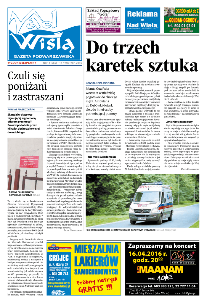 tygodnik BEZPŁATNy NR 14 (565) – 14 kwietnia 2016 Czuli się poniżani i zastraszani powiat piaseczyński Skandal w placówce zajmującej się pomocą ofiarom przemocy? Prawdopodobnie przez kilka lat dochodziło w niej do mobbingu. – Sprawa nas zaskoczyła – komentuje starostwo (fot. pc) To, co działo się w Powiatowym Ośrodku Interwencji Kryzysowej (niedawno przeprowadził się z Konstancina-Jeziorny do Góry Kalwarii), wyszło na jaw przypadkiem. Otóż jeden z podopiecznych instytucji 7 marca zawiadomił starostę, że kilka razy był świadkiem scen, które go zgorszyły. Jak oświadczył na piśmie, zaobserwował „niewłaściwe relacje” pomiędzy pracownikami POIK (miał widzieć m.in., jak niektórzy z nich byli poniżani). Reagując na to doniesienie, starosta Wojciech Ołdakowski powołał trzyosobowy zespół do sprawdzenia, czy w ośrodku doszło do naruszenia praw pracowniczych. Komisja najpierw poprosiła zatrudnionych w POIK o wypełnienie szczegółowej, anonimowej ankiety, a następnie z każdym przeprowadziła wywiad. Jak ustaliliśmy, większość przepytanych osób stwierdziła, że w instytucji panował mobbing. Jak udało się nam ustalić, pracownicy przyznali, że m.in. wyśmiewano się z nich, lekceważono ich kompetencje, obmawiano, oskarżano o niepopełnione błędy oraz ignorowano. Niektórzy czuli się zastraszeni. W poprzedni poniedziałek na biurko starosty trafił obszerny raport sporządzony przez komisję. Zespół wskazał „jako wysoce uprawdopodobnione”, że w ośrodku „doszło do zachowań [...] wyczerpujących definicję mobbingu”. – Sprawa bardzo nas zaskoczyła i traktujemy ją niezwykle poważnie – mówi wicestarosta Arkadiusz Strzyżewski, któremu POIK bezpośrednio podlega. Zastępca starosty informuje, że władze powiatu skupiły się obecnie na „przywróceniu prawidłowego zarządzania w POIK”. Starostwo zleciło również szczegółową kontrolę całej działalności ośrodka. Praca audytora jeszcze się nie zakończyła. Dlaczego zatrudnieni w ośrodku, zajmujący się m.in. pomocą psychologiczną ofiarom przemocy, tak długo skrywali, że w miejscu ich pracy dzieje się źle? Z naszych ustaleń wynika, że prawdopodobnie nie wierzyli, iż ich skargi odniosą jakikolwiek skutek. W 2010 r. napisali do ówczesnego starosty, że w instytucji dochodzi do nieprawidłowości. Ale wtedy władze powiatu zignorowały ich doniesienia. Czy cała sprawa zakończy się na raporcie komisji? – Pracownicy, którzy czują się ofiarami mobbingu, mogą domagać się przed sądem zadośćuczynienia od pracodawcy, bo to on ma obowiązek zapobiegania łamaniu praw zatrudnionych. Ten z kolei może pociągnąć do odpowiedzialności sprawcę mobbingu – komentuje mecenas Paweł Gugała z kancelarii prawnej SG Legal. Adwokat dodaje jednak, że postępowania sądowe związane z mobbingiem są bardzo trudne, gdyż pokrzywdzony musi udowodnić, że doznał rozstroju zdrowia. Piotr Chmielewski Do trzech karetek sztuka konstancin-jeziorna Jolanta Guzińska wezwała w niedzielę pogotowie do chorego męża. Ambulans do Dębówki dotarł, ale... do innej osoby potrzebującej pomocy. Kobieta jest zbulwersowana sytuacją, która się jej przytrafiła. – Kiedy karetka nie przyjeżdżała przez prawie dwie godziny, ponownie zadzwoniłam pod numer ratunkowy. Dyspozytorka przekonywała mnie z wielką pretensją w głosie, że przecież ratownicy u mnie byli i udzielili mężowi pomocy! Tylko dlatego, że nie dawałam za wygraną, wysłano do mnie drugą załogę – relacjonuje mieszkanka Dębówki. Nie mieli świadomości Było około godziny 13.30, kiedy 50-letniemu mężowi pani Jolanty, który cierpi na niedowład wszystkich kończyn, zaczęły sinieć usta. Dostał także bardzo wysokiej gorączki. Kobieta nie zwlekała z wezwaniem pomocy. Wojciech Jóźwiak, rzecznik prasowy spółki Falck Medycyna, której karetki obsługują powiat piaseczyński, tłumaczy, że po telefonie pani Jolanty „bezzwłocznie na miejsce wezwania skierowano najbliższy dostępny zespół ratownictwa medycznego”. – Chwilę później wpłynęło do nas drugie wezwanie z tej samej miejscowości, tym razem do 50-letniej kobiety – relacjonuje Jóźwiak. Rzecznik przekonuje, że już w Dębówce karetkę jadącą do męża pani Jolanty na drodze zatrzymali jacyś ludzie i zaprowadzili ratowników do domu, w którym na interwencję oczekiwała wspomniana 50-latka. – Pracownicy pogotowia nie mieli świadomości, że trafili pod zły adres – tłumaczy rzecznik Falck Medycyna. Jolantę Guzińską zastanawia, dlaczego ratowników nie zaniepokoiło to, że wzywano ich do mężczyzny, a udzielają pomocy kobiecie. – Jak można się pomylić w takiej sytuacji? – pyta mieszkanka Dębówki. Kiedy załoga udzielała pomocy 50-letniej kobiecie, na jej podwór- ko wjechał drugi ambulans (wysłany przez dyspozytora właśnie do niej). – Drugi zespół, po dotarciu pod ten sam adres, stwierdził, że wezwanie zostało już zrealizowane i odjechał do bazy – informuje Wojciech Jóźwiak. – Jak to możliwe, że jedna karetka odwołała drugą? Dlaczego nikomu nie przyszło do głowy, że skoro są dwa ambulanse, to jeden przyjechał do mojego męża? – zachodzi w głowę pani Jolanta. Zmienimy procedury Mąż kobiety na szczęście nie był w stanie zagrażającym jego życiu. Pomocy na miejscu udzieliła mu załoga trzeciej karetki, którą Jolanta Guzińska musiała jeszcze raz wzywać po upływie dwóch godzin. – Ten przykład jest dla nas wielce pouczający. Dokonamy analizy naszych procedur i wprowadzimy zmiany, które zapobiegną w przyszłości tego rodzaju nieporozumieniom. Dołożymy wszelkich starań, aby podobna sytuacja nigdy więcej nie miała miejsca – deklaruje Wojciech Jóźwiak. Piotr Chmielewski Pani Jolanta doczekała się ratowników po ponownym wezwaniu (fot. Falck Medycyna) Zapraszamy na koncert 16.04.2016 r. godz. 2000 oraz Rezerw