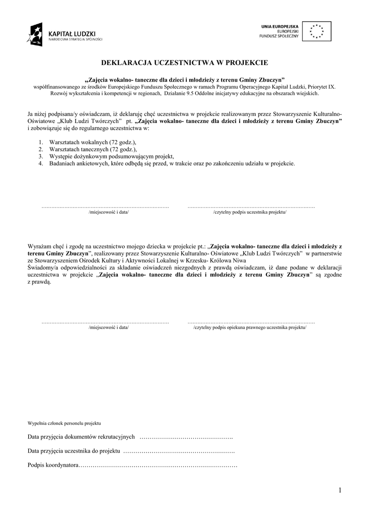 DEKLARACJA UCZESTNICTWA W PROJEKCIE „Zajęcia wokalno- taneczne dla dzieci i młodzieży z terenu Gminy Zbuczyn” współfinansowanego ze środków Europejskiego Funduszu Społecznego w ramach Programu Operacyjnego Kapitał Ludzki, Priorytet IX. Rozwój wykształcenia i kompetencji w regionach, Działanie 9.5 Oddolne inicjatywy edukacyjne na obszarach wiejskich. Ja niżej podpisana/y oświadczam, iż deklaruję chęć uczestnictwa w projekcie realizowanym przez Stowarzyszenie KulturalnoOświatowe „Klub Ludzi Twórczych” pt. „Zajęcia wokalno- taneczne dla dzieci i młodzieży z terenu Gminy Zbuczyn” i zobowiązuje się do regularnego uczestnictwa w: 1. 2. 3. 4. Warsztatach wokalnych (72 godz.), Warsztatach tanecznych (72 godz.), Występie dożynkowym podsumowującym projekt, Badaniach ankietowych, które odbędą się przed, w trakcie oraz po zakończeniu udziału w projekcie. …………………………………………………………………… /miejscowość i data/ …………………………………………………………………… /czytelny podpis uczestnika projektu/ Wyrażam chęć i zgodę na uczestnictwo mojego dziecka w projekcie pt.: „Zajęcia wokalno- taneczne dla dzieci i młodzieży z terenu Gminy Zbuczyn”, realizowany przez Stowarzyszenie Kulturalno- Oświatowe „Klub Ludzi Twórczych” w partnerstwie ze Stowarzyszeniem Ośrodek Kultury i Aktywności Lokalnej w Krzesku- Królowa Niwa Świadomy/a odpowiedzialności za składanie oświadczeń niezgodnych z prawdą oświadczam, iż dane podane w deklaracji uczestnictwa w projekcie „Zajęcia wokalno- taneczne dla dzieci i młodzieży z terenu Gminy Zbuczyn” są zgodne z prawdą. …………………………………………………………………… /miejscowość i data/ …………………………………………………………………… /czytelny podpis opiekuna prawnego uczestnika projektu/ Wypełnia członek personelu projektu Data przyjęcia dokumentów rekrutacyjnych ………………………………………. Data przyjęcia uczestnika do projektu ………………………………………………. Podpis koordynatora…………………………………………………………………… 1 DANE UCZESTNIKA PROJEKTU „Zajęcia wokalno- taneczne dla dzieci i młodzieży z terenu Gminy Zbuczyn” współfinansowanego ze środków Europejskiego Funduszu Społecznego w ramach Programu Operacyjnego Kapitał Ludzki, Priorytet IX. Rozwój wykształcenia i kompetencji w regionach, Działanie 9.5 Oddolne inicjatywy edukacyjne na obszarach wiejskich Lp. 1 2 3 Dane uczestnika Nazwisko Płeć: Wiek w chwili przystępowania do projektu 5 PESEL 7 8 9 10 11 12 Dane kontaktowe 13 14 15 16 17 18 2 Imię (imiona) 4 6 1 Nazwa Wykształcenie Kobieta Mężczyzna Brak Podstawowe Gimnazjalne Ponadgimnazjalne Pomaturalne Wyższe Ulica Nr domu Nr lokalu Obszar Wiejski1 Miejski2 Miejscowość Kod pocztowy Województwo Powiat Gmina Telefon stacjonarny Telefon komórkowy Adres poczty elektronicznej (e-mail) Obszar wiejski: gminy wiejskie, gminy wiejsko-miejskie i miasta do 25 tys. mieszkańców Obszar miejski: gminy miejskie i miasta powyżej 25 tyś. mieszkańców 2 BEZROBOTNY3, w tym: osoba długotrwale bezrobotna4 NIEAKTYWNY ZAWODOWO5 , w tym: osoba ucząca się lub kształcąca6 Dane dodatkowe 19 ZATRUDNIONY7 , w tym: Rolnik8 Status osoby na rynku pracy w chwili Samozatrudniony przystąpienia do projektu Zatrudniony w mikroprzedsiębiorstwie Zatrudniony w małym i (lub) średnim przedsiębiorstwie Zatrudniony w dużym przedsiębiorstwie Zatrudniony w administracji publicznej Zatrudniony w organizacji pozarządowej9 …………………………………………………………………… /miejscowość i data/ …………………………………………………………………… /czytelny podpis uczestnika projektu/ …………………………………………………………………… /czytelny podpis opiekuna prawnego uczestnika projektu/ 3 Oznacza osobę bezrobotną w rozumieniu Ustawy z dnia 20 kwietnia 2004 r. o promocji zatrudnienia i instytucjach rynku pracy (Dz. U. Nr 99 z 2004 r., poz. 1001, z poz. zm.), w szczególności osobę, która jednocześnie jest osobą: - niezatrudnioną i niewykonującą innej pracy zarobkowej, zdolną i gotową do podjęcia zatrudnienia, - nieuczącą się w szkole, z wyjątkiem szkół dla dorosłych lub szkół wyższych w systemie wieczorowym albo zaocznym, - zarejestrowaną we właściwym dla miejsca zameldowania stałego lub czasowego powiatowym urzędzie pracy, - ukończyła 18 lat i nie ukończyła 60 lat w przypadku kobiet lub 65 lat w przypadku mężczyzn. 4 Oznacza bezrobotnego pozostającego w rejestrze powiatowego urzędu pracy łącznie przez okres ponad 12 mc. w okresie ostatnich 2 lat. 5 Oznacza osobę pozostającą bez zatrudnienia, która jednocześnie nie zalicza się do kategorii bezrobotni 6 Oznacza osobę kształcącą się w ramach kształcenia formalnego i nieformalnego 7 Oznacza pracownika w rozumieniu Kodeksu pracy, tj. osobę zatrudnioną na podstawie umowy o pracę, powołania, wyboru, mianowania oraz spółdzielczej umowy o pracę, a także osobę wykonującą pracę na podstawie Kodeksu cywilnego, w szczególności w zakresie umów cywilno-prawnych (umowa zlecenia, umowa o dzieło). 8 Oznacza osobę będącą rolnikiem oraz domownikiem w rozumieniu Ustawy z dnia 20 grudnia 1990 r. o ubezpieczeniu społecznym rolników (Dz. U. z 1991 r. Nr 7, poz. 24, z późn. zm.), w szczególności, osobę, która jednocześnie: - jest pełnoletnia oraz zamieszkująca i prowadzącą na terytorium Rzeczypospolitej Polskiej, osobiście i na własny rachunek, działalność rolniczą w pozostającym w jej posiadaniu gospodarstwie rolnym, - jest ubezpieczona w Kasie Rolniczego Ubezpieczenia Społecznego, a także domownik, czyli w szczególności osoba, która: - ukończyła 16 lat, - pozostająca z rolni
