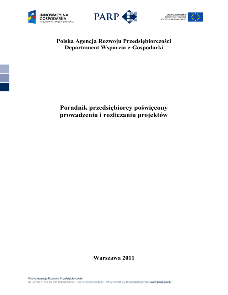 Polska Agencja Rozwoju Przedsiębiorczości Departament Wsparcia e-Gospodarki Poradnik przedsiębiorcy poświęcony prowadzeniu i rozliczaniu projektów Warszawa 2011 1z5 Szanowni Państwo, Prezentujemy siódmy odcinek Poradnika nt. prowadzenia i rozliczania projektów w działaniu 8.1 PO IG, który poświęcony został kwestii wydatków kwalifikujących się do objęcia wsparciem. W niniejszym odcinku przedstawiono przykładowy katalog wydatków uznawanych za niekwalifikujące się do objęcia wsparciem. 2z5 7. Kwalifikowalność wydatków System prawidłowej realizacji Projektu i rozliczenia wniosku o płatność w głównej mierze opiera się na zagadnieniu kwalifikowalności wydatków. Zgodnie z zapisami umowy o dofinansowanie, aby wydatek kwalifikował się do objęcia wsparciem muszą zostać spełnione łącznie następujące warunki: 1) jest niezbędny do prawidłowej realizacji Projektu; 2) został wskazany w harmonogramie rzeczowo-finansowym projektu; 3) został faktycznie poniesiony w okresie kwalifikowalności wydatków i nie wcześniej niż w dniu następującym po dniu złożenia wniosku o dofinansowanie; 4) został prawidłowo udokumentowany; 5) został zweryfikowany i zatwierdzony przez PARP. UWAGA! Wydatki poniesione po zakończeniu okresu kwalifikowalności wydatków nie będą uznane za kwalifikujące się do objęcia wsparciem. Dlatego ważne jest, aby Beneficjent przez cały okres trwania Projektu realizował go zgodnie z: harmonogramem rzeczowo-finansowym Projektu, a tym samym katalogiem wydatków kwalifikujących się do objęcia wsparciem zatwierdzonym przez Komisję Konkursową; opisem zawartym we wniosku o dofinansowanie Projektu . WAŻNE! Wydatek, który nie został uwzględniony w harmonogramie rzeczowofinansowym Projektu oraz wniosku o dofinansowanie Projektu nie może zostać uznany za kwalifikujący się do objęcia wsparciem (po zatwierdzeniu przez Komisję Konkursową wniosku o dofinansowanie nie ma możliwości wprowadzania nowych pozycji do harmonogramu rzeczowo-finansowego Projektu). 7.1 Przykłady wydatków nie kwalifikujących się do objęcia wsparciem Poniżej prezentujemy przykładowy katalog wydatków co do zasady uznawanych za niekwalifikujące się do objęcia wsparciem: zakup środków transportu; zakup dodatkowego wyposażenia komputerów stacjonarnych, jak np. słuchawki; UWAGA! Za zestaw komputerowy uznaje się wyłącznie: monitor, stację roboczą, myszkę i klawiaturę. 3z5 zakup urządzeń peryferyjnych, tj. myszka czy klawiatura, w przypadku zakupu laptopów; zakup lodówki, dywanu, kuchenki mikrofalowej, itd. w ramach wyposażenia biura czy zakupu materiałów biurowych i eksploatacyjnych; UWAGA! Za element wyposażenia biura uznaje się jedynie biurka, krzesła, regały, kontenerki, itp. zakup biurka, krzesła w ramach kategorii wydatków „zakup materiałów biurowych i eksploatacyjnych”; UWAGA! Co do zasady materiały biurowe i eksploatacyjne są to przedmioty i towary podlegające zużyciu. zakup materiałów o charakterze środków czystości (chyba, że są to środki do czyszczenia komputerów, zakupionych w ramach Projektu), art. spożywczych, ręczników papierowych itp. (wyjątkiem są te wymienione z nazwy we wniosku o dofinansowanie projektu) w ramach kategorii wydatków „zakup materiałów biurowych i eksploatacyjnych”; koszty najmu własnej powierzchni biurowej/lokalu będącego własnością jednego ze wspólników spółki, zwłaszcza jeśli lokal był już wcześniej wykorzystywany przez spółkę, natomiast umowa najmu została zawarta dopiero od chwili rozpoczęcia okresu kwalifikowalności wydatków; wydatki związane z bieżącą działalnością Beneficjenta (np. najem, hosting, usługi księgowe) wykraczające poza okres kwalifikowalności wydatków; UWAGA! Wydatki kwalifikujące się do objęcia wsparciem związane z bieżącą działalnością Beneficjenta powinny zostać zatwierdzone wyłącznie w zakresie, w jakim dotyczą okresu kwalifikowalności wydatków. 7.2 W przypadku wydatków związanych z wynagrodzeniami oraz pozapłacowymi kosztami pracy nie można uznać za kwalifikujące się do objęcia wsparciem następujących składników: zasiłek opiekuńczy; koszty badań okresowych i wstępnych; dopłaty do okularów; dodatku zadaniowego; 4z5 wynagrodzenia za pracę w godzinach nadliczbowych; składki na PFRON i ZFRON; nagrody jubileuszowe; odprawy emerytalno-rentowe; ekwiwalent za niewykorzystany urlop; świadczenie za czas niezdolności do pracy, gdy dotyczy nieobecności dłuższej niż 33 dni; premia uznaniowa; UWAGA! Premia uznaniowa nie stanowi wydatku kwalifikującego się do objęcia wsparciem, ponieważ ma charakter nagrody i jest zależna od decyzji pracodawcy, jej wysokość nie ma odzwierciedlenia w umowie zawartej pomiędzy pracownikiem a pracodawcą oraz w przypadku nie otrzymania premii uznaniowej brak jest uregulowań prawnych, wobec których pracownik mógłby wystąpić z roszczeniem. zasiłki finansowane z budżetu państwa (zasiłek pielęgnacyjny, zasiłek rodzinny); bony żywieniowe dla pracowników; dodatki za znajomość języków, za niepalenie, za projekty, inne dodatki tego typu ustalone przez pracodawcę; odszkodowanie za klauzulę zakazu konkurencyjności, inne odszkodowania, do których wypłacenia zobowiązany jest pracodawca 7.3 Podsumowanie Podsumowując, należy podkreślić, że przedstawiony przez Beneficjenta na etapie rozliczania projektu koszt może zostać uznany za kwalifikujący się do objęcia wsparciem, o ile został zatwierdzony przez Komisję Konkursową i ma odzwierciedlenie w zawartej Umowie o dofinansowanie, w szczególności w jej załącznikach - harmonogramie rzeczowo-finansowym Projektu oraz wniosku o dofinansowanie Projektu. 5z5