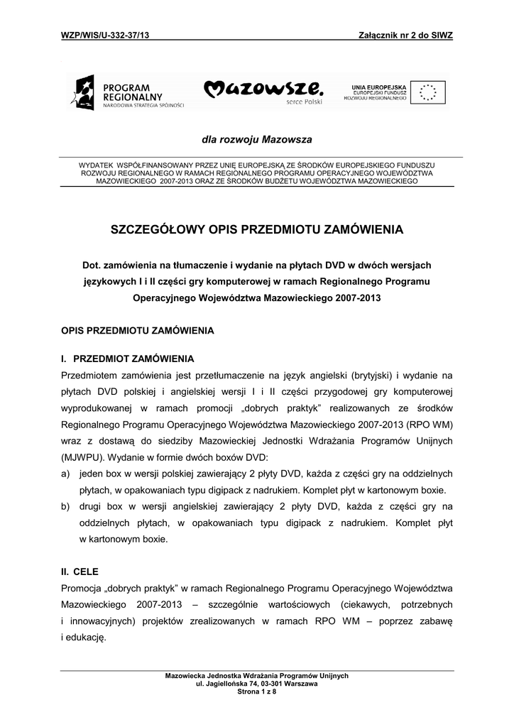 WZP/WIS/U-332-37/13 Załącznik nr 2 do SIWZ z dla rozwoju Mazowsza WYDATEK WSPÓŁFINANSOWANY PRZEZ UNIĘ EUROPEJSKĄ ZE ŚRODKÓW EUROPEJSKIEGO FUNDUSZU ROZWOJU REGIONALNEGO W RAMACH REGIONALNEGO PROGRAMU OPERACYJNEGO WOJEWÓDZTWA MAZOWIECKIEGO 2007-2013 ORAZ ZE ŚRODKÓW BUDśETU WOJEWÓDZTWA MAZOWIECKIEGO SZCZEGÓŁOWY OPIS PRZEDMIOTU ZAMÓWIENIA Dot. zamówienia na tłumaczenie i wydanie na płytach DVD w dwóch wersjach językowych I i II części gry komputerowej w ramach Regionalnego Programu Operacyjnego Województwa Mazowieckiego 2007-2013 OPIS PRZEDMIOTU ZAMÓWIENIA I. PRZEDMIOT ZAMÓWIENIA Przedmiotem zamówienia jest przetłumaczenie na język angielski (brytyjski) i wydanie na płytach DVD polskiej i angielskiej wersji I i II części przygodowej gry komputerowej wyprodukowanej w ramach promocji „dobrych praktyk” realizowanych ze środków Regionalnego Programu Operacyjnego Województwa Mazowieckiego 2007-2013 (RPO WM) wraz z dostawą do siedziby Mazowieckiej Jednostki WdraŜania Programów Unijnych (MJWPU). Wydanie w formie dwóch boxów DVD: a) jeden box w wersji polskiej zawierający 2 płyty DVD, kaŜda z części gry na oddzielnych płytach, w opakowaniach typu digipack z nadrukiem. Komplet płyt w kartonowym boxie. b) drugi box w wersji angielskiej zawierający 2 płyty DVD, kaŜda z części gry na oddzielnych płytach, w opakowaniach typu digipack z nadrukiem. Komplet płyt w kartonowym boxie. II. CELE Promocja „dobrych praktyk” w ramach Regionalnego Programu Operacyjnego Województwa Mazowieckiego 2007-2013 – szczególnie wartościowych (ciekawych, potrzebnych i innowacyjnych) projektów zrealizowanych w ramach RPO WM – poprzez zabawę i edukację. Mazowiecka Jednostka WdraŜania Programów Unijnych ul. Jagiellońska 74, 03-301 Warszawa Strona 1 z 8 WZP/WIS/U-332-37/13 Załącznik nr 2 do SIWZ III. ZAKRES RZECZOWY 1. Przetłumaczenie gier 1.1 I część gry pt. „Mazowsze. Pogoń w czasie”: I część gry została wydana na płycie w wersji polskiej w 2011 r. Łączna objętość tekstów do przetłumaczenia – około 50 000 znaków ze spacjami. Do zadań Wykonawcy naleŜy przetłumaczenie tekstów z gry (m.in. dialogi, opisy, instrukcje, regulamin) i zawartości opakowania płyty na język angielski (brytyjski) oraz wgranie angielskich napisów (i głosu lektora) na płytę w ramach poszczególnych materiałów: a) Interfejs, który zawiera m.in.: • zmianę profilu, • ustawienia, • informację na temat twórców. b) Części składowe gry: • regulamin (End-User Licence Agreement), który uŜytkownik musi zaakceptować przed instalacją gry na komputerze, • wprowadzenie do gry w postaci filmu złoŜonego z kilku plansz z opisami, • dialogi bohaterów wyświetlane w okienkach dialogowych, • info – opisy projektów współfinansowanych ze środków RPO WM, które są prezentowane w grze – Uwaga: ta część musi zawierać tłumaczenie z napisami i lektorem. Przed rozpoczęciem nagrań Wykonawca musi przekazać Zamawiającemu co najmniej 3 propozycje głosu lektora do wyboru, oraz innych materiałów zawartych na płycie. c) Trailer gry – wersja z napisami. Uwaga: w ramach I części gry rezygnujemy z zamieszczenia na płycie odnośnika do strony www.pogonwczasie.eu i tłumaczenia jej zawartości. 1.2 II część gry pt. „Mazowsze. Miejsce ponad czasem” II część gry została wyprodukowana w 2012 r., nie była jeszcze wydawana na płytach i róŜni się od pierwszej tym, Ŝe oprócz napisów, wszystkie dialogi mówione są przez lektorów (głosy 21 postaci). Łączna objętość tekstów do przetłumaczenia – około 80 000 znaków ze spacjami. Do zadań Wykonawcy naleŜy: 1.2.1 Przetłumaczenie gry na język angielski (brytyjski) i wgranie angielskich napisów oraz głosów lektorów na płytę w ramach poszczególnych materiałów: Mazowiecka Jednostka WdraŜania Programów Unijnych ul. Jagiellońska 74, 03-301 Warszawa Strona 2 z 8 WZP/WIS/U-332-37/13 a) Załącznik nr 2 do SIWZ Wersja instalacyjna gry, która zawiera m.in.: • interfejs, który składa się m.in. z następujących funkcjonalności: - wybierz profil, - ustawienia, - regulamin (End-User Licence Agreement), - pomoc, - informację na temat twórców. • wprowadzenie do gry w postaci filmu złoŜonego z kilku plansz z opisami i lektorem, • dialogi bohaterów wyświetlane w okienkach dialogowych – Uwaga: wersja tłumaczenia z napisami i dubbingiem, • info – opisy projektów współfinansowanych ze środków RPO WM, które są prezentowane w grze – Uwaga: wersja tłumaczenia z napisami i lektorem. b) Trailer gry. 1.2.2 Nagranie pełnego dubbingu wszystkich linii dialogowych w języku angielskim – nagrania z udziałem aktorów, posługujących się biegle j. angielskim w profesjonalnym studiu nagraniowym z reŜyserem dźwięku i montaŜystą. Przed rozpoczęciem nagrań Wykonawca musi przekazać Zamawiającemu co najmniej 3 propozycje głosów do wyboru wszystkich bohaterów gry i lektora czytającego opisy projektów. 1.3 I i II część gry 1.3.1 Wszystkie napisy, które znajdują się w obydwu częściach gry i napisy z okładki płyty I części gry podlegają tłumaczeniu i zastąpieniu ich napisami w wersji anglojęzycznej, co będzie wymagało przygotowania plików graficznych z tekstami w nowej wersji językowej gier. 1.3.2 Wszystkie teksty lektorskie: info o projektach RPO WM z I i II części gry oraz dubbing z II części gry podlegają tłumaczeniu i zastąpieniu ich nagraniami w wersji anglojęzycznej. 1.3.3 I i II część gry zostały stworzone w języku programowania C++. Wydanie gier w angielskiej wersji językowej nie wymaga wprowadzania zmian w kodzie źródłowym, a jedynie wymianę plików graficznych z napisami i plików głosowych z wersją polską na pliki z wersją angielską. 1.3.4 Tłumaczenie wszystkich elementów obydwu części gry i zawartości okładki i płyty I części gry musi zostać poddane przez Wykonawcę wie