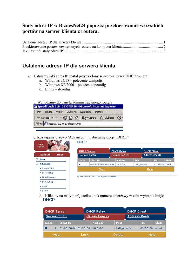 Stały adres IP w BiznesNet24 poprzez przekierowanie wszystkich portów na serwer klienta z routera. Ustalenie adresu IP dla serwera klienta...................................................................................... 1 Przekierowanie portów zewnętrznych routera na komputer klienta .......................................... 2 Jaki jest mój stały adres IP? ....................................................................................................... 3 Ustalenie adresu IP dla serwera klienta. a. Ustalamy jaki adres IP został przydzielony serwerowi przez DHCP routera: a. Windows 95/98 – polecenie winipcfg b. Windows XP/2000 – polecenie ipconfig c. Linux – ifconfig b. Wchodzimy do panelu administracyjnego routera c. Rozwijamy drzewo ‘Advanced’ i wybieramy opcję „DHCP’ d. Klikamy na małym trójkąciku obok numeru dzierżawy w celu wybrania linijki e. Po zaznaczeniu linijki pojawia się opcja ‘Lock’ – klikamy na nią – TTL dzierżawy zmienił się na nieskończony (infinite) Przekierowanie portów zewnętrznych routera na komputer klienta a. Przechodzimy do opcji „NAPT’ routera: b. Wybieramy opcję ‘Default Server’. Podajemy adres serwera (w naszym wypadku 10.0.0.1) i naciskamy ‘Apply’: c. Zapisujemy konfigurację routera wybierając opcję ‘Save All’ Jaki jest mój stały adres IP? Wybieramy opcję „System Information” z menu „Basic”: pole ‘IP addresses/Netmasks’ zawiera publiczny i stały adres IP. (Uwaga: stały adres IP będzie przyznany tylko po połączeniu się używając przyznanej nazwy użytkownika i hasła; podczas połączenia na nazwę użytkownika biznesnet24 adres IP będzie losowy).