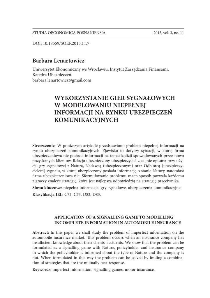 STUDIA OECONOMICA POSNANIENSIA 2015, vol. 3, no. 11 DOI: 10.18559/SOEP.2015.11.7 Barbara Lenartowicz Uniwersytet Ekonomiczny we Wrocławiu, Instytut Zarządzania Finansami, Katedra Ubezpieczeń [email protected] WYKORZYSTANIE GIER SYGNAŁOWYCH W MODELOWANIU NIEPEŁNEJ INFORMACJI NA RYNKU UBEZPIECZEŃ KOMUNIKACYJNYCH Streszczenie: W poniższym artykule przedstawiono problem niepełnej informacji na rynku ubezpieczeń komunikacyjnych. Zjawisko to dotyczy sytuacji, w której firma ubezpieczeniowa nie posiada informacji na temat kolizji spowodowanych przez nowo pozyskanych klientów. Relacja ubezpieczony-ubezpieczyciel zostanie opisana przy użyciu gry sygnałowej z Naturą, Nadawcą (ubezpieczonym) oraz Odbiorcą (ubezpieczycielem) sygnału, w której ubezpieczony posiada informację o stanie Natury, natomiast firma ubezpieczeniowa nie. Sformułowanie problemu w ten sposób pozwala każdemu z graczy znaleźć strategię, która jest najlepszą odpowiedzią na strategię przeciwnika. Słowa kluczowe: niepełna informacja, gry sygnałowe, ubezpieczenia komunikacyjne. Klasyfikacja JEL: C72, C73, D82, D83. APPLICATION OF A SIGNALLING GAME TO MODELLING INCOMPLETE INFORMATION IN AUTOMOBILE INSURANCE Abstract: In this paper we shall study the problem of imperfect information on the automobile insurance market. This problem occurs when an insurance company has insufficient knowledge about their clients’ accidents. We show that the problem can be formulated as a signalling game with Nature, policyholder and insurance company in which the policyholder is informed about the type of Nature and the company is not. When formulated in this way the problem can be solved by finding a combination of strategies that are the mutually best response. Keywords: imperfect information, signalling games, motor insurance. 98 Barbara Lenartowicz Wstęp Problem niekompletnej informacji, czasem nazywany problemem asymetrii informacji, dotyczy sytuacji, w której jedna ze stron transakcji posiada więcej informacji niż druga strona. Zjawisko to jest zatem obecne m.in. w ekonomii, psychologii, naukach społecznych, biologii a także w informatyce. We wszystkich tych dziedzinach można zaobserwować rozwój teorii gier, która coraz częściej odgrywa rolę narzędzia do podejmowania optymalnych decyzji w sytuacjach z udziałem co najmniej dwóch zainteresowanych stron, zwanych graczami. W sytuacjach tych poszczególni gracze często nie są pewni reakcji współgracza, stąd w literaturze rozpatrywane modele nazywa się grami z niepełną informacją lub grami z asymetryczną informacją. Jednym z przykładów tego typu gier są gry sygnałowe1, zaliczane do klasy gier dwuosobowych. Brak kompletnej informacji skutkuje tym, że gracze swoje wybory (decyzje) opierają na przekonaniach dotyczących zachowań współgracza. Początek, a zarazem rozkwit teorii gier przypada na lata 60. i 70. XX w. Wtedy też powstało wiele modeli opartych na założeniach gier sygnałowych. Jednym z pierwszych był model opracowany przez filozofa Davida Lewisa (1969). Model ten zakładał, że istnieje tylko jedna prawidłowa odpowiedź na zagranie przeciwnika, a za dokonanie słusznego wyboru gracze otrzymują jednakowe wynagrodzenie. Kluczowym modelem w teorii gier sygnałowych był zastosowany w ekonomii model Spence’a (1973), tzw. job market signaling. Gracze w tym modelu to Natura, osoba starająca się o posadę (Gracz I) oraz pracodawca (Gracz II). Rolą Natury jest określenie umiejętności Gracza I, który wysyła sygnały do pracodawcy. Za sygnały mogą posłużyć dyplomy, referencje, certyfikaty potwierdzające kompetencje osoby zatrudnianej. Pracodawca, opierając się na tych informacjach oraz dodatkowych sygnałach wysyłanych przez osobę rekrutowaną, podejmował decyzję o jej zatrudnieniu. Pozyskanie nowych sygnałów wiąże się z dodatkowym kosztem ponoszonym przez pracodawcę. W przypadku gdy koszt ten jest zbyt wysoki, gracze będą rezygnować z pozyskania nowej informacji, a decyzję będą podejmować jedynie zgodnie ze swoimi przekonaniami. W niniejszym artykule uwaga zostanie skupiona na problemie niekompletnej informacji w relacji ubezpieczyciel-ubezpieczony. O zjawisku W literaturze często nazywane grami sygnalizacyjnymi lub bayesowskimi. 1 Wykorzystanie gier sygnałowych w modelowaniu niepełnej informacji na rynku99 niepełnej informacji na rynku ubezpieczeń możemy mówić m.in. wtedy, gdy zakład ubezpieczeń posiada jedynie częściowe informacje o ubezpieczanym ryzyku, np. gdy klient zataja informację w istotny sposób wpływającą na prawdopodobieństwo zaistnienia szkody. Sytuacja ta zostanie zobrazowana na przykładzie ubezpieczenia komunikacyjnego, w którym ubezpieczony należy do jednej z grup: kierowców niepowodujących szkód oraz kierowców z historią szkodową w zakresie ubezpieczeń komunikacyjnych. W oferowanym ubezpieczeniu kierowcy charakteryzujący się niższym ryzykiem spowodowania wypadku płacą niższą składkę. Zatem ubezpieczeni w tej grze będą dążyli do zapłacenia jak najniższej składki, natomiast rolą ubezpieczyciela będzie pozyskanie jak najwięcej uczciwych klientów. 1. Gry sygnałowe 1.1. Opis gry Gra sygnałowa to gra z niepełną informacją, w której uczestniczą Natura i co najmniej dwóch graczy, Nadawca sygnału (Gracz I) oraz Odbiorca sygnału (Gracz II). Pierwszym etapem gry sygnałowej jest wybór z pewnym niezerowym prawdopodobieństwem stanu Natury, innymi słowy Natura określa typ Gracza I. Stan ten znany jest tylko Nadawcy, który na jego podstawie wysyła sygnał do Odbiorcy. Odbiorca, znając jedynie otrzymany sygnał, podejmuje jedną z możliwych decyzji, na podstawie której gracze otrzymują wypłaty. Wysokość wynagrodzenia graczy jest zatem uzależniona od sygnału wysłanego przez Nadawcę oraz reakcji Odbiorcy. Obaj gracze dążą do maksymalizacji swoich wypłat. Elementy gry: –– Natura N, –– gracze: Nadawca, Odbiorca, 
