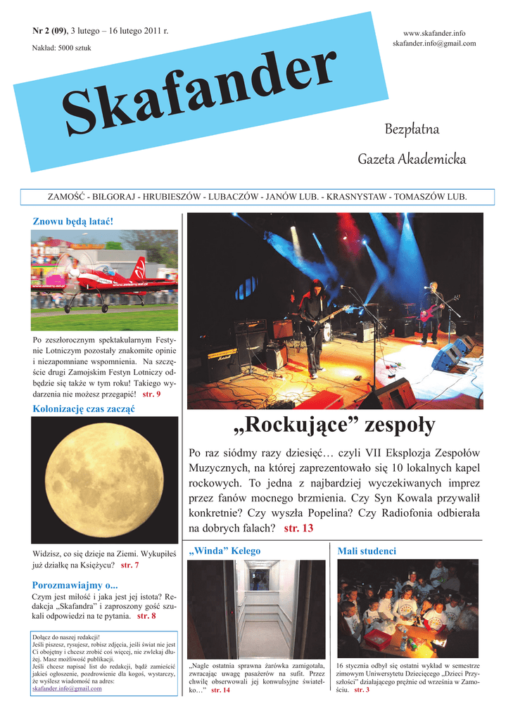 Nr 2 (09), 3 lutego – 16 lutego 2011 r. r e d n a f a k S Nakład: 5000 sztuk www.skafander.info [email protected] Bezpłatna Gazeta Akademicka ZAMOŚĆ - BIŁGORAJ - HRUBIESZÓW - LUBACZÓW - JANÓW LUB. - KRASNYSTAW - TOMASZÓW LUB. Znowu będą latać! Po zeszłorocznym spektakularnym Festynie Lotniczym pozostały znakomite opinie i niezapomniane wspomnienia. Na szczęście drugi Zamojskim Festyn Lotniczy odbędzie się także w tym roku! Takiego wydarzenia nie możesz przegapić! str. 9 Kolonizację czas zacząć „Rockujące” zespoły Po raz siódmy razy dziesięć… czyli VII Eksplozja Zespołów Muzycznych, na której zaprezentowało się 10 lokalnych kapel rockowych. To jedna z najbardziej wyczekiwanych imprez przez fanów mocnego brzmienia. Czy Syn Kowala przywalił konkretnie? Czy wyszła Popelina? Czy Radiofonia odbierała na dobrych falach? str. 13 Widzisz, co się dzieje na Ziemi. Wykupiłeś już działkę na Księżycu? str. 7 „Winda” Kelego Mali studenci „Nagle ostatnia sprawna żarówka zamigotała, zwracając uwagę pasażerów na sufit. Przez chwilę obserwowali jej konwulsyjne światełko…” str. 14 16 stycznia odbył się ostatni wykład w semestrze zimowym Uniwersytetu Dziecięcego „Dzieci Przyszłości” działającego prężnie od września w Zamościu. str. 3 Porozmawiajmy o... Czym jest miłość i jaka jest jej istota? Redakcja „Skafandra” i zaproszony gość szukali odpowiedzi na te pytania. str. 8 Dołącz do naszej redakcji! Jeśli piszesz, rysujesz, robisz zdjęcia, jeśli świat nie jest Ci obojętny i chcesz zrobić coś więcej, nie zwlekaj dłużej. Masz możliwość publikacji. Jeśli chcesz napisać list do redakcji, bądź zamieścić jakieś ogłoszenie, pozdrowienie dla kogoś, wystarczy, że wyślesz wiadomość na adres: [email protected] 2 www.skafander.info Listy do redakcji Zamość Perłą Rocka? (cz. 2) Panowie, jestem po lekturze Skafandra nr 1 (08). Wasza bezpłatna gazeta akademicka jest coraz ciekawsza. Ten numer ma już „wyrobiony” charakter. Poza tym zataczacie coraz szersze kręgi. Życzę powodzenia i wysokich lotów. I jeszcze tego, byście mogli być zawsze bezpłatną gazetą akademicką. Grażyna Kawala Szanowna Pani Grażyno! To, że gazeta „Skafander” cieszy się uznaniem osoby tworzącej kulturę Zamościa od lat, jest dla nas nobilitacją, za co serdecznie dziękujemy. Podtytuł „gazeta akademicka”, który obraliśmy, zobowiązuje nas do dobrej zawartości. Staramy się opisywać sprawy ważne, ciekawe, warte uwagi i przemyślenia. Chcemy, by „Skafander” był m.in. miejscem dyskusji o lokalnej kulturze, czego przykładem może być sąsiedni artykuł, pt. „Zamość – Perłą Rocka?”. Dlatego wszystkich, którym sprawy kultury nie są obojętne, zachęcamy do publikacji na naszych łamach. Obiecujemy nie zniżać lotów i zawsze mierzyć wysoko. Mamy nadzieję, że „Skafander” non decipiet spe. Pozdrawiamy! Redakcja Co nowego na stronie Trailer Skafander Rec, czyli zapowiedź najnowszego filmu zrealizowanego przez ekipę „Skafandra”. Cały film będzie do obejrzenia już niebawem. Trwa sonda zainicjowana artykułem „Zamość – Perłą Rocka?”, w której można zagłosować za bądź przeciw koncertowi zespołu metalowego CETI w Zamościu. Audycja radiowa zatytułowana Porozmawiajmy o miłości, której gościem jest dr hab. Wacław Pyczek. Galerie zdjęć uzdolnionych młodych fotografów: Michaliny Brach, Dominiki Dacyny i Pauliny Hałasy. Zapis audio rozmowy z zamojskim składem hiphopowym Rezon. Chłopaki z Rezonu wydali niedawno swoją pierwszą płytę zatytułowaną „Energia”, którą „Skafander” objął patronatem medialnym. Na stronie znajdują się również kawałki do odsłuchu z tego „energetycznego” krążka. Nowa zakładka Niezbędnik, w której będzie można sprawdzić nocne dyżury aptek w miastach naszego regionu, poradnik dotyczący pracy, telefony zaufania i inne niezbędne rzeczy, które czasami szybko trzeba odszukać. Informacje o akcjach, w których warto wziąć udział, o bieżących konkursach, wystawach oraz nadchodzących wydarzeniach. Twórz wraz z nami lokalną scenę! Masz swój zespół rockowy? Grasz w garażu i chciałbyś trafić do większego grona? Robisz rap? Chcesz pokazać, co potrafisz i udowodnić, że to Ty jesteś MC z naprawdę dobrym flow i przekazem? Jesteś dobrym didżejem, ludzie lubią bawić się przy Twojej muzyce? Wyślij swoje utwory na nasz e-mail: [email protected] i twórz wraz z nami lokalną scenę muzyczną. Najlepsi z Was znajdą swoje stałe miejsce w zakładkach muzycznych na naszej stronie internetowej oraz otrzymają promocję w gazecie. 5000 egzemplarzy na cały region! W zakładce hip-hop jest już Rap Opsesja i Rezon, a w muzyce klubowej Slayback, Baby Directs, Disco Reason, Baccano, Ne!tan. Dołącz do nich! Koncerty rockowe a twierdza Zamość? Zagadnienie to istotnie żąda kilkanaście słów w naszej gazecie. W pierwszej części mojego artykułu podjąłem kilka ważnych problemów dotyczących rocka w Zamościu (pierwszą cześć można znaleźć na naszej stronie skafander.info). Teraz poruszę następne kwestie. Czy Zamość może wytworzyć tradycję związaną z koncertami rockowymi? Oczywiście, że tak! Nasza twierdza posiada predyspozycje historyczne o wiele większe niż inne miasta. Wystarczy cofnąć się do 13 grudnia 1981 roku (wtedy został wprowadzony stan wojenny). I może mało kto pamięta, że w ten dzień odbył się jedyny w Polsce koncert rockowy. A odbył się on właśnie u nas w Zamościu. Tego pamiętnego dnia zespół TSA zagrał w naszym bastionie. Czemu władze pozwoliły w tym czasie zagrać TSA? Otóż, władze im nie pozwoliły, władze ich zmusiły by koncert się odbył! Komendant milicji w Zamościu bał się, że ma niewystarczające siły na opanowanie protestów, jakie mogły się pojawić na wiadomość o odwołanym koncercie. TSA odwiedziło na
