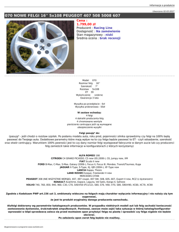 Informacje o produkcie Utworzono 02-03-2017 070 NOWE FELGI 16'' 5x108 PEUGEOT 407 508 5008 607 Cena : 1.799,00 zł Producent : Racing Line Dostępność : Na zamówienie Stan magazynowy : niski Średnia ocena : brak recenzji Model 070 Rozmiar felg 16'' Szerokość 7'' Rozstaw 5x108 ET 39 Wykończenie srebrne Gwarancja 3 lata Wysyłka po przedpłacie - 0zł Wysyłka probraniowa - 50zł W zestaw wchodzą: 4 felgi 4 dekielki producenta felg 4 chromowane wentyle pierścienie centrujące jeśli są wymagane ubezpieczenie wysyłki Felgi pasują* do: (pasują* - jeśli chodzi o rozstaw szpilek. Po podaniu modelu auta, roku prod, pojemności silnika sprawdzimy czy felgi na 100% będą pasować do Twojego auta. Dodatkowe parametry które mają wpływ na to czy felga będzie pasować to ET - czyli odsadzenie, szerokość oraz otwór centrujący. Warunkiem 100% pewności jest to czy dany rozmiar felgi występował fabrycznie w danym aucie lub czy producenci felg zamieścili takie informacje w konfiguratorach z których korzystamy) ALFA ROMEO 166 CITROEN C4 GRAND PICASSO, C5 new (05.2008-), C6, Jumpy new, XM FIAT Scudo II new FORD B-Max, C-Max, S-Max, Galaxy (2006-), Focus II, Focus III, Mondeo, Transit/Tourneo, Kuga JAGUAR X-Type, S-Type, XJ, XJR (2004-), XF-Type new LANCIA Kappa, Thesis LAND ROVER Evoque, Freelander II new MERCEDES CITAN PEUGEOT 308 (NIE WSZYSTKIE WERSJE), 407, 407 coupe, 407 SW, 508, 605, 607, Expert II new, RCZ (z dystansem) RENAULT Avantime, Espace, Laguna, Vel Satis, Kango II, Safrane VOLVO 740, 760, 850, 940, 960, C30, C70, S40/V50 (P11/12), S60, S70, V60, V70, S80, S90/V90, XC60, XC70, XC90 Zgodnie z Kodeksem PWP art.156 ust 3, emblematy widoczne na felgach mają charakter wyłącznie informacyjny i nie należy się tym sugerować, że jest to produkt oryginalny danego producenta samochodu. Alufelgi dobieramy wg parametrów katalogowych producentów. W przypadku niektórych modeli aut lub felg zachodzi konieczność zastosowania dystansów, śrub/nakrętek ampułkowych. Ponieważ, zawsze może zajść taka sytuacja w której katalog/konfigurator wprowadzi w błąd sprzedawcę zaleca się przed montażem opon przyłożyć felgę na piastę i sprawdzić czy felga nigdzie nie będzie obcierać. Po założeniu opon zwrot felg będzie nie możliwy. Wygenerowano w programie www.oscGold.com
