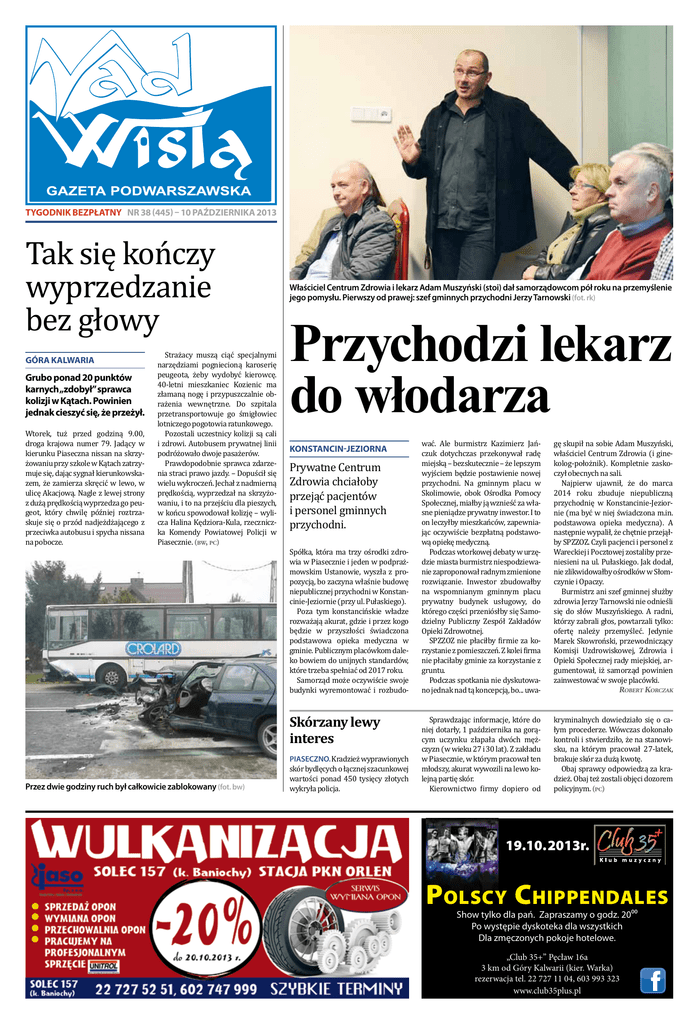 tygodnik BEZPŁATNy NR 38 (445) – 10 października 2013 Tak się kończy wyprzedzanie bez głowy góra kalwaria Grubo ponad 20 punktów karnych „zdobył” sprawca kolizji w Kątach. Powinien jednak cieszyć się, że przeżył. Wtorek, tuż przed godziną 9.00, droga krajowa numer 79. Jadący w kierunku Piaseczna nissan na skrzyżowaniu przy szkole w Kątach zatrzymuje się, dając sygnał kierunkowskazem, że zamierza skręcić w lewo, w ulicę Akacjową. Nagle z lewej strony z dużą prędkością wyprzedza go peugeot, który chwilę później roztrzaskuje się o przód nadjeżdżającego z przeciwka autobusu i spycha nissana na pobocze. Strażacy muszą ciąć specjalnymi narzędziami pogniecioną karoserię peugeota, żeby wydobyć kierowcę. 40-letni mieszkaniec Kozienic ma złamaną nogę i przypuszczalnie obrażenia wewnętrzne. Do szpitala przetransportowuje go śmigłowiec lotniczego pogotowia ratunkowego. Pozostali uczestnicy kolizji są cali i zdrowi. Autobusem prywatnej linii podróżowało dwoje pasażerów. Prawdopodobnie sprawca zdarzenia straci prawo jazdy. – Dopuścił się wielu wykroczeń. Jechał z nadmierną prędkością, wyprzedzał na skrzyżowaniu, i to na przejściu dla pieszych, w końcu spowodował kolizję – wylicza Halina Kędziora-Kula, rzeczniczka Komendy Powiatowej Policji w Piasecznie. (bw, pc) Właściciel Centrum Zdrowia i lekarz Adam Muszyński (stoi) dał samorządowcom pół roku na przemyślenie jego pomysłu. Pierwszy od prawej: szef gminnych przychodni Jerzy Tarnowski (fot. rk) Przychodzi lekarz do włodarza konstancin-jeziorna Prywatne Centrum Zdrowia chciałoby przejąć pacjentów i personel gminnych przychodni. Spółka, która ma trzy ośrodki zdrowia w Piasecznie i jeden w podprażmowskim Ustanowie, wyszła z propozycją, bo zaczyna właśnie budowę niepublicznej przychodni w Konstancinie-Jeziornie (przy ul. Pułaskiego). Poza tym konstancińskie władze rozważają akurat, gdzie i przez kogo będzie w przyszłości świadczona podstawowa opieka medyczna w gminie. Publicznym placówkom daleko bowiem do unijnych standardów, które trzeba spełniać od 2017 roku. Samorząd może oczywiście swoje budynki wyremontować i rozbudo- Skórzany lewy interes Przez dwie godziny ruch był całkowicie zablokowany (fot. bw) Piaseczno. Kradzież wyprawionych skór bydlęcych o łącznej szacunkowej wartości ponad 450 tysięcy złotych wykryła policja. wać. Ale burmistrz Kazimierz Jańczuk dotychczas przekonywał radę miejską – bezskutecznie – że lepszym wyjściem będzie postawienie nowej przychodni. Na gminnym placu w Skolimowie, obok Ośrodka Pomocy Społecznej, miałby ją wznieść za własne pieniądze prywatny inwestor. I to on leczyłby mieszkańców, zapewniając oczywiście bezpłatną podstawową opiekę medyczną. Podczas wtorkowej debaty w urzędzie miasta burmistrz niespodziewanie zaproponował radnym zmienione rozwiązanie. Inwestor zbudowałby na wspomnianym gminnym placu prywatny budynek usługowy, do którego części przeniósłby się Samodzielny Publiczny Zespół Zakładów Opieki Zdrowotnej. SPZZOZ nie płaciłby firmie za korzystanie z pomieszczeń. Z kolei firma nie płaciłaby gminie za korzystanie z gruntu. Podczas spotkania nie dyskutowano jednak nad tą koncepcją, bo... uwa- gę skupił na sobie Adam Muszyński, właściciel Centrum Zdrowia (i ginekolog-położnik). Kompletnie zaskoczył obecnych na sali. Najpierw ujawnił, że do marca 2014 roku zbuduje niepubliczną przychodnię w Konstancinie-Jeziornie (ma być w niej świadczona m.in. podstawowa opieka medyczna). A następnie wypalił, że chętnie przejąłby SPZZOZ. Czyli pacjenci i personel z Wareckiej i Pocztowej zostaliby przeniesieni na ul. Pułaskiego. Jak dodał, nie zlikwidowałby ośrodków w Słomczynie i Opaczy. Burmistrz ani szef gminnej służby zdrowia Jerzy Tarnowski nie odnieśli się do słów Muszyńskiego. A radni, którzy zabrali głos, powtarzali tylko: ofertę należy przemyśleć. Jedynie Marek Skowroński, przewodniczący Komisji Uzdrowiskowej, Zdrowia i Opieki Społecznej rady miejskiej, argumentował, iż samorząd powinien zainwestować w swoje placówki. Robert Korczak Sprawdzając informacje, które do niej dotarły, 1 października na gorącym uczynku złapała dwóch mężczyzn (w wieku 27 i 30 lat). Z zakładu w Piasecznie, w którym pracował ten młodszy, akurat wywozili na lewo kolejną partię skór. Kierownictwo firmy dopiero od kryminalnych dowiedziało się o całym procederze. Wówczas dokonało kontroli i stwierdziło, że na stanowisku, na którym pracował 27-latek, brakuje skór za dużą kwotę. Obaj sprawcy odpowiedzą za kradzież. Obaj też zostali objęci dozorem policyjnym. (pc) 19.10.2013r. POLSCY CHIPPENDALES Show tylko dla pań. Zapraszamy o godz. 2000 Po występie dyskoteka dla wszystkich Dla zmęczonych pokoje hotelowe. „Club 35+” Pęcław 16a 3 km od Góry Kalwarii (kier. Warka) rezerwacja tel. 22 727 11 04, 603 993 323 www.club35plus.pl 2 Przemyśl to jeszcze raz, premierze! piaseczno, lesznowola, prażmów Piaseczno, Lesznowola i Prażmów oprotestowują decyzję premiera o wstrzymaniu budowy trasy S7 na odcinku Grójec – Warszawa. W piątek wspólne pismo w tej sprawie złożyli u ministra transportu Sławomira Nowaka burmistrz Piaseczna oraz wójtowie Lesznowoli i Prażmowa. Włodarze przypominają w nim, że budowa południowej wylotówki ze stolicy od lat jest uwzględniana w miejscowych planach zagospodarowania przestrzennego, a gminy angażują się – również finansowo – w przygotowanie węzłów drogowych łączących się z planowaną trasą. „Wystąpienie Pana Premiera wprowadziło nas w konsternację, dlatego prosimy o szczegółowe wyjaśnienia, które pozwolą nam wierzyć, że zależy Państwu na rzeczywistym rozwiązaniu problemów komunikacyjnych południowej części aglomeracji warszawskiej” – czytamy w piśmie. Piaseczno podjęło już uchwałę protestacyjn