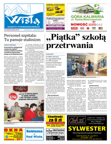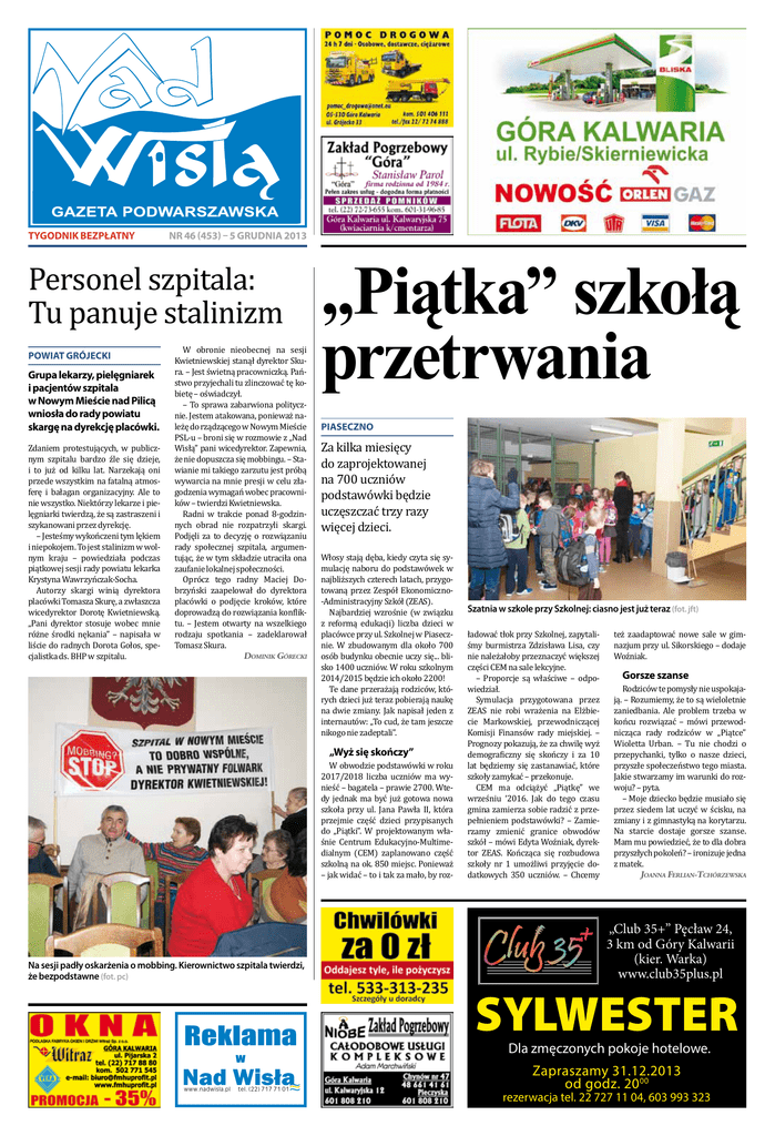 tygodnik BEZPŁATNy NR 46 (453) – 5 grudnia 2013 Personel szpitala: Tu panuje stalinizm powiat grójecki Grupa lekarzy, pielęgniarek i pacjentów szpitala w Nowym Mieście nad Pilicą wniosła do rady powiatu skargę na dyrekcję placówki. Zdaniem protestujących, w publicznym szpitalu bardzo źle się dzieje, i to już od kilku lat. Narzekają oni przede wszystkim na fatalną atmosferę i bałagan organizacyjny. Ale to nie wszystko. Niektórzy lekarze i pielęgniarki twierdzą, że są zastraszeni i szykanowani przez dyrekcję. – Jesteśmy wykończeni tym lękiem i niepokojem. To jest stalinizm w wolnym kraju – powiedziała podczas piątkowej sesji rady powiatu lekarka Krystyna Wawrzyńczak-Socha. Autorzy skargi winią dyrektora placówki Tomasza Skurę, a zwłaszcza wicedyrektor Dorotę Kwietniewską. „Pani dyrektor stosuje wobec mnie różne środki nękania” – napisała w liście do radnych Dorota Gołos, specjalistka ds. BHP w szpitalu. W obronie nieobecnej na sesji Kwietniewskiej stanął dyrektor Skura. – Jest świetną pracowniczką. Państwo przyjechali tu zlinczować tę kobietę – oświadczył. – To sprawa zabarwiona politycznie. Jestem atakowana, ponieważ należę do rządzącego w Nowym Mieście PSL-u – broni się w rozmowie z „Nad Wisłą” pani wicedyrektor. Zapewnia, że nie dopuszcza się mobbingu. – Stawianie mi takiego zarzutu jest próbą wywarcia na mnie presji w celu złagodzenia wymagań wobec pracowników – twierdzi Kwietniewska. Radni w trakcie ponad 8-godzinnych obrad nie rozpatrzyli skargi. Podjęli za to decyzję o rozwiązaniu rady społecznej szpitala, argumentując, że w tym składzie utraciła ona zaufanie lokalnej społeczności. Oprócz tego radny Maciej Dobrzyński zaapelował do dyrektora placówki o podjęcie kroków, które doprowadzą do rozwiązania konfliktu. – Jestem otwarty na wszelkiego rodzaju spotkania – zadeklarował Tomasz Skura. Dominik Górecki „Piątka” szkołą przetrwania piaseczno Za kilka miesięcy do zaprojektowanej na 700 uczniów podstawówki będzie uczęszczać trzy razy więcej dzieci. Włosy stają dęba, kiedy czyta się symulację naboru do podstawówek w najbliższych czterech latach, przygotowaną przez Zespół Ekonomiczno-Administracyjny Szkół (ZEAS). Najbardziej wzrośnie (w związku z reformą edukacji) liczba dzieci w placówce przy ul. Szkolnej w Piasecznie. W zbudowanym dla około 700 osób budynku obecnie uczy się... blisko 1400 uczniów. W roku szkolnym 2014/2015 będzie ich około 2200! Te dane przerażają rodziców, których dzieci już teraz pobierają naukę na dwie zmiany. Jak napisał jeden z internautów: „To cud, że tam jeszcze nikogo nie zadeptali”. „Wyż się skończy” W obwodzie podstawówki w roku 2017/2018 liczba uczniów ma wynieść – bagatela – prawie 2700. Wtedy jednak ma być już gotowa nowa szkoła przy ul. Jana Pawła II, która przejmie część dzieci przypisanych do „Piątki”. W projektowanym właśnie Centrum Edukacyjno-Multimedialnym (CEM) zaplanowano część szkolną na ok. 850 miejsc. Ponieważ – jak widać – to i tak za mało, by roz- Na sesji padły oskarżenia o mobbing. Kierownictwo szpitala twierdzi, że bezpodstawne (fot. pc) Reklama w www.nadwisla.pl tel. (22) 717 71 01 Szatnia w szkole przy Szkolnej: ciasno jest już teraz (fot. jft) ładować tłok przy Szkolnej, zapytaliśmy burmistrza Zdzisława Lisa, czy nie należałoby przeznaczyć większej części CEM na sale lekcyjne. – Proporcje są właściwe – odpowiedział. Symulacja przygotowana przez ZEAS nie robi wrażenia na Elżbiecie Markowskiej, przewodniczącej Komisji Finansów rady miejskiej. – Prognozy pokazują, że za chwilę wyż demograficzny się skończy i za 10 lat będziemy się zastanawiać, które szkoły zamykać – przekonuje. CEM ma odciążyć „Piątkę” we wrześniu ‘2016. Jak do tego czasu gmina zamierza sobie radzić z przepełnieniem podstawówki? – Zamierzamy zmienić granice obwodów szkół – mówi Edyta Woźniak, dyrektor ZEAS. Kończąca się rozbudowa szkoły nr 1 umożliwi przyjęcie dodatkowych 350 uczniów. – Chcemy też zaadaptować nowe sale w gimnazjum przy ul. Sikorskiego – dodaje Woźniak. Gorsze szanse Rodziców te pomysły nie uspokajają. – Rozumiemy, że to są wieloletnie zaniedbania. Ale problem trzeba w końcu rozwiązać – mówi przewodnicząca rady rodziców w „Piątce” Wioletta Urban. – Tu nie chodzi o przepychanki, tylko o nasze dzieci, przyszłe społeczeństwo tego miasta. Jakie stwarzamy im warunki do rozwoju? – pyta. – Moje dziecko będzie musiało się przez siedem lat uczyć w ścisku, na zmiany i z gimnastyką na korytarzu. Na starcie dostaje gorsze szanse. Mam mu powiedzieć, że to dla dobra przyszłych pokoleń? – ironizuje jedna z matek. Joanna Ferlian-Tchórzewska „Club 35+” Pęcław 24, 3 km od Góry Kalwarii (kier. Warka) www.club35plus.pl SYLWESTER Dla zmęczonych pokoje hotelowe. Zapraszamy 31.12.2013 od godz. 20 00 rezerwacja tel. 22 727 11 04, 603 993 323 2 ~ NadWisłą ~ wydarzenia nr 46/2013 3 reklama Dla inwalidów miejsca nie ma warka Znalezienie w centrum Warki miejsca parkingowego przeznaczonego dla niepełnosprawnych to prawdziwy sukces. Elektrownia o mocy 55 kilowatów miałaby zająć część jazu (fot. rk) Rzeczne atrakcje w centrum miasta? konstancin-jeziorna Mała elektrownia wodna i mały port – być może powstaną na Jeziorce koło Starej Papierni. Pierwszy obiekt miałby zostać zbudowany na jazie, drugi – przy figurze św. Jana Nepomucena. Co ciekawe, elektrownia miałaby być jedną z najefektowniejszych budowli w mieście. Jej główną częścią byłaby widoczna w całej okazałości turbina Archimedesa długa na kilkanaście metrów. – Produkcja zielonej energii byłaby wyrazem uzdrowiskowego charakteru naszej gminy – podkreśla Jacek Rowiński, prezes spółki Marina Konstancin, która chce wyłożyć pieniądze na rzeczne at