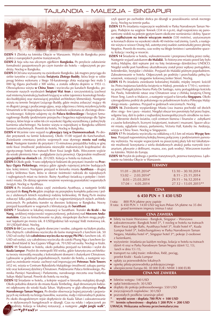 TAJLANDIA – MALEZJA – SINGAPUR DZIEŃ 1 Zbiórka na lotnisku Okęcie w Warszawie. Wylot do Bangkoku przez jeden z europejskich portów tranzytowych. DZIEŃ 2 Azja wita nas ulicznym zgiełkiem Bangkoku. Po przylocie załatwienie formalności paszportowych po czym transfer do hotelu – odpoczynek po podróży. Nocleg w Bangkoku. DZIEŃ 3 Od rana wyruszamy na zwiedzanie Bangkoku. Jak magnes przyciąga do siebie turystów z całego świata Świątynia Złotego Buddy, która kryje w sobie posąg bóstwa wykonany z litego 18-karatowego złota ważącego bez mała 5 000 kg (figura pochodzi z XIII wieku, a została odkryta dopiero w 1955 r.). Obowiązkowa wizyta w China Town i wycieczka po kanałach Bangkoku, porównanie naszych wyobrażeń Świątyni Wat Arun z rzeczywistością (zachwyt nad misterną konstrukcją budowli kryjącej w sobie tajemnice kosmologii hindusko-buddyjskiej oraz stanowiącej przykład architektury khmerskiej). Następnie wizyta na terenie Świątyni Leżącego Buddy, gdzie można zobaczyć mający 46 m długości posąg z pozłacanego gipsu, sesja zdjęciowa z letnią rezydencją króla Vimanmek w tle (największa na świecie budowla wykonana ze złocistego drewna tekowego). Kolejnie udajemy się do Pałacu Królewskiego i Świątyni Szmaragdowego Buddy (podziwianie przepychu i bogactwa najświętszego dla Tajów miejsca, które kryje w sobie 66 cm wysokości figurkę wyrzeźbioną z jednej bryły kamienia szlachetnego). Na koniec wizyta w największej w Bangkoku szlifierni kamieni szlachetnych. Powrót do hotelu. Nocleg w Bangkoku. DZIEŃ 4 Wcześnie rano wyjazd na pływający targ w Damnoensaduak. Po drodze przystanek na farmie kokosowej. Około 11:00 wyjazd do Kanchanaburi. Zwiedzanie cmentarza jeńców wojennych oraz słynnego mostu nad rzeką Kwai. Następnie transfer do przystani i 15-minutowa przejażdżka łodzią w górę rzeki Kwai (możliwość podziwiania niezwykle malowniczych krajobrazów) do egzotycznego hotelu na tratwach River Kwai Jungle Rafts. Wieczorem wyjście do wioski plemienia Mon - podglądanie życia prowincji. Opcjonalnie możliwość przejażdżki na słoniach (ok. 20 USD). Kolacja w hotelu na tratwach. DZIEŃ 5 Około godz. 9 rano odpłynięcie łodziami do przystani i transfer na Przełęcz Ognia Piekielnego, miejsca gdzie zginęło najwięcej jeńców budujących tzw. kolej śmierci. Następnie przejazd w kierunku miasta Ayutthaya – drugiej stolicy królestwa Siam, która w okresie świetności należała do największych i najbogatszych miast na świecie. Ruiny Ayutthayi świadczą o potędze i świetności miasta. Do dzisiaj ogromne wrażenie wywierają pozostałości wspaniałych świątyń. Nocleg w Ayutthaya. DZIEŃ 6 Po śniadaniu dalsza część zwiedzania Ayutthaya, a następnie krótki przejazd do Bang Pa-In gdzie znajduje się przepiękny kompleks pałacowy i jedna z ulubionych letnich rezydencji rodziny królewskiej. W Bang Pa-In można zobaczyć kilka pałaców, zbudowanych w najprzeróżniejszych stylach architektonicznych. Po południu transfer na dworzec kolejowy w Bangkoku. Nocny przejazd kuszetkami w wagonach z klimatyzacją do Suratthani. DZIEŃ 7 Śniadanie w lokalnej restauracji w Suratthani. Transfer do Krabi – Ao Nang, urokliwej miejscowości wypoczynkowej, położonej nad Morzem Andamańskim. Czas na leniuchowanie na plaży, niespokojni duchem mogą popływać kajakami po morzu (ok. 8 USD/godzina) lub wynająć łódź motorową (ok. 30 USD/pół dnia). Nocleg. DZIEŃ 8-10 Czas wolny. Kąpiele słoneczne i wodne, zaleganie na białym piasku. Dla chętnych: całodniowa wycieczka do lasów mangrowych z lunchem (ok. 50 USD od osoby) lub całodniowa wycieczka na wyspę Phi Phi z lunchem (ok. 45 USD od osoby), czy całodniowa wycieczka do zatoki Phang Nga z lunchem (James Bond Island & Sea Gypsies Village) ok. 70 USD od osoby. Noclegi w Krabi. DZIEŃ 11 Śniadanie w hotelu, około południa przejazd na lotnisko i wylot do Kuala Lumpur. Przylot do metropolii XXI wieku, gdzie futurystyczna architektura tworzy niezwykłą mozaikę z kolonialnymi domami i chatynkami Chinatown. Lądowanie w godzinach popołudniowych, transfer do hotelu, a następnie wyjazd na zwiedzanie miasta: zachwyt nad imponującymi Petronas Twin Towers (452 m), wizyta w Centrum Rękodzieła Malajskiego (możliwość zakupu pamiątek) oraz kolorowej dzielnicy Chinatown. Podziwianie Pałacu Królewskiego, Pomnika Pamięci Narodowej i Parlamentu, narodowego meczetu oraz budynku Sultan Abdul Samad. Powrót do hotelu na nocleg. DZIEŃ 12 Śniadanie w hotelu, a kolejnie wyjazd w kierunku malajskiej dżungli. Około południa dotarcie do miasta Kuala Tembeling, skąd drewnianymi łodziami odpływamy do wioski Kuala Tahan. Wpływamy w głąb olbrzymiego Parku Narodowego Taman Negara. Po drodze obserwacja bujnej przyrody i pojawiających się niekiedy na brzegu bawołów, waranów, małp i różnorodnych ptaków. Po około dwugodzinnym rejsie dopłyniecie do Kuala Tahan i zakwaterowanie w stylizowanych bungalowach w dżungli. Czas na relaks i odpoczynek po podróży. Kolacja w lokalnej restauracji, a następnie „night jungle walk”, 116 czyli spacer po zachodzie słońca po dżungli w poszukiwaniu oznak nocnego życia. Nocleg na terenie parku. DZIEŃ 13 Po śniadaniu rozpoczęcie wędrówki w Parku Narodowym Taman Negara. Podejście na wzgórze Teresek (334 m n.p.m), skąd rozpościera się panoramiczny widok na pokryte gęstym lasem okoliczne wzniesienia i doliny. Spacer po najdłuższym na świecie wiszącym moście (530 metrów), usytuowanym w koronach drzew na wysokości około 40 metrów nad ziemią. Lunch, a następnie wizyta w wiosce Orang Asli, autentycznej osadzie zamieszkałej przez plemię Negritos. Powrót do resortu, czas wolny na błogie lenistwo i samodzielne spacery. Kolacja i nocleg w resorcie. DZIEŃ 14 Śniadanie w hotelu, wykwaterowanie i przeprawa łodzią przez rzekę. Następnie wyjazd autokarem do Malakki. To historyczne miasto p
