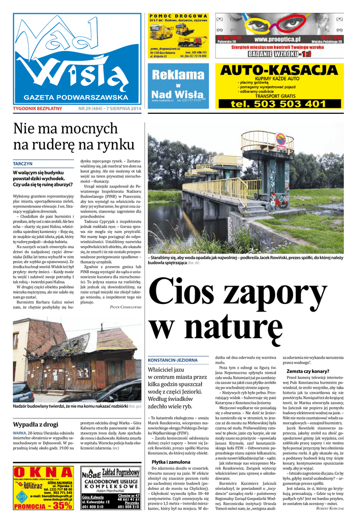 tygodnik BEZPŁATNy NR 29 (484) – 7 sierpnia 2014 Nie ma mocnych na ruderę na rynku tarczyn W walącym się budynku powstał dziki wychodek. Czy uda się tę ruinę zburzyć? Wyłożony granitem reprezentacyjny plac miasta, uporządkowana zieleń, wyremontowane elewacje. I on. Straszący wyglądem drewniak. – Chodziłam do pani burmistrz i prosiłam, żeby coś z nim zrobili. Ale bez echa – skarży się pani Halina, właścicielka sąsiedniej kamienicy. – Boję się, że znajdzie się jakiś idiota, pijak, który tę ruderę podpali – dodaje kobieta. Na naszych oczach otworzyła ona drzwi do nadpalonej części drewniaka (kilka lat temu wybuchł w nim pożar, ale szybko go opanowano). Ze środka buchnął smród. Widok też był przykry: sterty śmieci. – Każdy może tu wejść i załatwić swoje potrzeby. I tak robią – twierdzi pani Halina. W drugiej części obiektu podobno mieszka mężczyzna, ale nie udało się nam go zastać. Burmistrz Barbara Galicz mówi nam, że chętnie pozbyłaby się bu- dynku szpecącego rynek. – Zastanawialiśmy się, jak rozebrać ten dom na koszt gminy. Ale nie możemy ot tak wejść na teren prywatnej nieruchomości – tłumaczy. Urząd miejski zaapelował do Powiatowego Inspektoratu Nadzoru Budowlanego (PINB) w Piasecznie, aby ten wymógł na właścicielu rudery jej wyburzenie, bo grozi ona zawaleniem, stanowiąc zagrożenie dla przechodniów. Tadeusz Cypryjak z inspektoratu jednak rozkłada ręce. – Gorsza sprawa nie mogła się nam przytrafić. Nie mamy kogo pociągnąć do odpowiedzialności. Ustaliliśmy nazwiska współwłaścicieli obiektu, ale okazało się, że zmarli i że nie zostało przeprowadzone postępowanie spadkowe – tłumaczy urzędnik. Zgodnie z prawem gmina lub PINB mogą wystąpić do sądu o ustanowienie kuratora dla nieruchomości. To jedyna szansa na rozbiórkę. Jak jednak się dowiedzieliśmy, na razie urząd miejski nie złożył takiego wniosku, a inspektorat tego nie planuje. Piotr Chmielewski – Staraliśmy się, aby woda opadała jak najwolniej – podkreśla Jacek Rowiński, prezes spółki, do której należy budowla spiętrzająca (fot. rk) Cios zapory w naturę konstancin-jeziorna Nadzór budowlany twierdzi, że nie ma komu nakazać rozbiórki (fot. pc) Wypadła z drogi Warka. 28-letnia Ukrainka odniosła śmiertelne obrażenia w wypadku samochodowym w Dębnowoli. W poprzednią środę około godz. 19.00 na prostym odcinku drogi Warka – Góra Kalwaria straciła panowanie nad dostawczym iveco daily. Auto zjechało do rowu i dachowało. Kobieta zmarła w szpitalu. Warecka policja bada okoliczności zdarzenia. (pc) Właściciel jazu w centrum miasta przez kilka godzin spuszczał wodę z części Jeziorki. Według świadków zdechło wiele ryb. – To katastrofa ekologiczna – uważa Marek Roszkiewicz, wiceprezes mazowieckiego okręgu Polskiego Związku Wędkarskiego (PZW). – Zaszła konieczność odsłonięcia dolnej części zapory – broni się Jacek Rowiński, prezes spółki Marina Konstancin, do której należy obiekt. Płytka i zamulona Do zdarzenia doszło w czwartek. Otwarto zasuwy na jazie. W efekcie obniżył się znacznie poziom rzeki po zachodniej stronie budowli (podobno aż do mostu na Chylickiej). – Głębokość wynosiła tylko 30–40 centymetrów. Czyli zmniejszyła się prawie o 1,5 metra – twierdzi mieszkaniec, który był na miejscu. W do- datku od dna oderwała się warstwa mułu. Poza tym z odnogi za figurą św. Jana Nepomucena spłynęła niemal cała woda. Natomiast już po zamknięciu zasuw na jakiś czas płytko zrobiło się po wschodniej stronie zapory. – Nieżywych ryb było pełno. Przerażający widok – bulwersuje się pani Katarzyna z Konstancina-Jeziorny. Miejscowi wędkarze nie posiadają się z oburzenia. – Nie dość że Jeziorka zamieniła się w strumień, to jeszcze aż do mostu na Mirkowskiej była czarna od mułu. Próbowaliśmy ratować te płocie, jazie czy karpie, ale nie miały szans na przeżycie – opowiada Janusz Krymski, szef konstancińskiego koła PZW. – Odtworzenie poprzedniego stanu zajmie kilkanaście, a może nawet kilkadziesiąt lat – sądzi. Jak informuje nas wiceprezes Marek Roszkiewicz, Związek wytoczy właścicielowi jazu sprawę o odszkodowanie. Burmistrz Kazimierz Jańczuk oświadczył, że powiadomił o „incydencie” zarządcę rzeki – państwowy Regionalny Zarząd Gospodarki Wodnej. Rzeczniczka instytucji Urszula Tomoń mówi nam, że „wstępna anali- za zdarzenia nie wykazała naruszenia prawa wodnego”. Zemsta czy konary? Przed kamerą telewizji internetowej Puls Konstancina burmistrz powiedział, że zrobi wszystko, aby taka historia jak ta czwartkowa się nie powtórzyła. Nawiązał też do krążącej teorii, że Marina otworzyła zasuwy, bo Jańczuk nie popiera jej pomysłu budowy elektrowni wodnej na jazie. – Nikt nie może szantażować władz samorządowych – oznajmił burmistrz. Jacek Rowiński stanowczo zaprzecza, jakoby zrobił na złość gospodarzowi gminy. Jak wyjaśnia, coś zakłócało pracę zapory i nie można było poznać przyczyny bez obniżenia poziomu rzeki. A gdy okazało się, że u podstawy budowli leżą trzy ścięte konary, kontynuowano spuszczanie wody, aby je wyjąć. – Istniało zagrożenie dla jazu. Co by było, gdyby został uszkodzony? – argumentuje prezes spółki. Jest zdania, że ci, którzy go krytykują, przesadzają. – Gdzie są te tony padłych ryb? Jest mi bardzo przykro, że zostałem tak oceniony – mówi. Robert Korczak 2 ~ NadWisłą ~ wydarzenia Embargo! I co dalej? powiat grójecki Nie dość że przetwórnie płacą grosze, to jeszcze Rosjanie wprowadzili embargo. – Tak fatalnego roku nie było od dawna – twierdzą sadownicy. Najpierw zmuszeni byli wyeksportować zerwane jesienią jabłka po bardzo niskich cenach, potem przetwórnie kupowały od nich owoce miękkie znacznie poniżej kosztów produkcji, a teraz Rosjanie wprowadzili zaka
