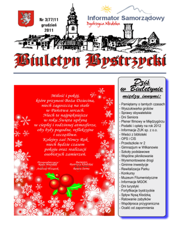 Nr 3/77/11 grudzień 2011 Dziœ w Biuletynie między innymi: - Pamiętamy o tamtych czasach - Wyszukiwarka grobów - Sprawy obywatelskie - Dni Seniora - Plener filmowy w Międzygórzu - Podatki i opłaty na rok 2012 - Informacje ZUK sp. z o.o. - Wieści z biblioteki - OPS i CIS - Przedszkole nr 2 - Gimnazjum w Wilkanowie - Szkoły podstawowe - Wspólne piknikowanie - Wyremontowane drogi - Gminne inwestycje - Rewitalizacja Parku - Konkursy - Muzeum Filumenistyczne - Informacje MGOK - Dni turystyki - Fortyfikacje bystrzyckie - Spływ Nysą Kłodzką - Ratowanie zabytków - Współpraca przygraniczna - Ocalić od zapomnienia 2 Biuletyn Bystrzycki 3/77/11 Przekazanie dróg do eksploatacji po remoncie Dnia 06.10.2011 r. dokonano kolejnych odbiorów zadań remontowanych dróg realizowanych w ramach usuwania skutków klęsk żywiołowych, finansowanych przez budżet państwa i gminę Bystrzyca Kłodzka w bieżącym roku: 4. Remont drogi wewnętrznej transportu rolnego dz. nr 610/1 w kierunku posesji nr 10 i 11 w Starej Łomnicy. Wartość zadania: 203.669,13 zł Dofinansowanie: 160.657,00 zł. opadów deszczu i powodzi. Wartość zadania: 59.009,79 zł Dofinansowanie: 47.207,00 zł. 6. Remont mostu w ciągu drogi gminnej dz. nr 582/2, 607 k/pos. Nr 52 w m. Pławnicy zniszczonego w wyniku nadmiernych opadów deszczu i powodzi. Wartość zadania: 65.177,64 zł Dofinansowanie: 42.136,00 zł. Ogólna wartość przyznanych przez promesy dotacji wynosi w 2011 roku 2.807.000,00 zł. Obecnie trwają jeszcze prace przy kolejnych 6-ciu zadaniach o których poinformuję Państwa w kolejnych edycjach biuletynu. Uroczysty odbiór ul. Górnej w Bystrzycy Kłodzkiej, po całkowitym remoncie 1. Remont drogi gminnej nr 119685D ul. Górna, położonej na dz. nr 1091, 23 od łącznika ul. Górnej do skrzyżowania z droga powiatową nr 3277D, wraz z zabezpieczeniem osuwającego się pobocza drogi k/pos. nr 6 w Bystrzycy Kłodzkiej - II etap. Wartość zadania: 743.894,04 zł Dofinansowanie z budżetu państwa: 583.189,00 zł. Julian Drożdż Kierownik Wydziału Gospodarki Komunalnej i Mieszkaniowej 5. Remont pobocza drogi gminnej dz. nr 417 przy ulicy 1-go Maja n/p pos. Nr 14 w Bystrzycy Kłodzkiej – II etap, zniszczonego w wyniku nadmiernych 2. Remont drogi wewnętrznej dz. nr 242/124, 879/85, 122/8, 129, 130 w m. Marianówka w kierunku Sanktuarium ,,Maria Śnieżna’’. Wartość zadania: 406.187,59 zł Dofinansowanie: 321.678,00 zł. 3. Remont drogi gminnej dz. nr 271 w ciągu ul. Zgody w m. Bystrzyca Kłodzka, zniszczonej w wyniku nadmiernych opadów deszczu i powodzi. Wartość zadania: 64.134,61 zł Dofinansowanie: 50.861,00 zł. Uroczyste przecięcie wstęgi - oddającej w użytkowanie drogę gminną w Marianówce 3/77/11 Biuletyn Bystrzycki 3 Inwestycje w Gminie 1. Zadanie pn. „Rewitalizacja ul. Rycerskiej, Placu Wolności i ul. Kościelnej – budowa, remont, modernizacja drobnej infrastruktury przestrzeni publicznej niezbędnej do prawidłowego funkcjonowania obszarów wsparcia” (termin realizacji zadania: październik 2010 r. – czerwiec 2012 r.). Trwają zaawansowane roboty związane z realizacją II Etapu zadania, tj. rewitalizacją Placu Wolności w Bystrzycy Kłodzkiej. W ramach II Etapu zadania wykonano w obrębie Placu Wolności: - sieć wodociągową, - sieć kanalizacji sanitarnej, - sieć kanalizacji deszczowej, - część nawierzchni jezdni i chodników z kostki kamiennej; - roboty konstrukcyjne galerii (tzw. „podwyższenia”); - roboty branży elektrycznej – ułożenie sieci energetycznej - oświetleniowej dla stylowego oświetlenia ulicznego Placu Wolności i oświetlenia iluminacyjnego; w drodze przetargu nieograniczonego, firma: Przedsiębiorstwo Robót Zmechanizowanych „BUDOSTAL-8” Spółka Akcyjna z Krakowa. Pozostałe roboty, zaplanowane do wykonania w obrębie Placu Wolności: - dokończenie robót nawierzchniowych Termin umowny zakończenia II Etapu zadania, tj. rewitalizacji Placu Wolności: 09.12.2011 r. 2. Zadanie pn. „Rewitalizacja ul. Rycerskiej, Placu Wolności i ul. Koś- fot. Realizacja robót na Placu Wolności cielnej – budowa i modernizacja drogi (jezdnia + chodnik) mająca na celu poprawę dostępności do miejsc atrakcyjnych turystycznie o zasięgu regionalnym lub ponadregionalnym wraz z budową infrastruktury towarzyszącej (kanalizacja deszczowa)" (termin realizacji zadania: październik 2010 r. – listopad 2012 r.). fot. Realizacja robót na Placu Wolności Obecnie wykonywane są roboty związane z ułożeniem kostki kamiennej na jezdni i chodnikach, a także roboty związane z wyposażeniem fontanny, która docelowo będzie podświetlona. Wykonywane są również prace związane z montażem elementów małej architektury i prace związane z nasadzeniem 8 szt. drzew – Klon pospolity (Acer platanoides) “Globusum” w obrębie Placu Wolności. Wykonawcą robót, związanych z rewitalizacją Pl. Wolności jest, wyłoniona jezdni i chodników z kostki kamiennej i płyt kamiennych, - przebudowana galerii (tzw. „podwyższenia”) - montaż stylowego oświetlenia ulicznego i iluminacyjnego wieży Ratusza i Figury Wotywnej Św. Trójcy, a także podświetlenie fontanny; - montaż elementów małej architektury (słupki ograniczające, maszty flagowe, ławki itp.). Rewitalizacja ul. Kościelnej będzie realizowana w 2012 r. Zadanie dofinansowane jest ze środków Unii Europejskiej w ramach Regionalnego Programu Operacyjnego Województwa Dolnośląskiego na lata 2007 – 2013, Priorytet nr 9 "Odnowa zdegradowanych obszarów miejskich na terenie Dolnego Śląska (Miasta)” Działania nr 9.1 "Odnowa zdegradowanych obszarów miejskich w miastach powyżej 10 tysięcy mieszkańców”. Kwota dofinansowania zadania ze środków Unii Europejskiej, wg umowy o dofinansowanie, wynosi: 1 021 924,87 PLN (Zadanie nr 1) + 3 998 821,79 PLN (Zadanie Nr 2) = 5 020 746,66 PLN. ciąg dalszy na stronie 4 4 Biuletyn Bystrzycki 3/77/11 Inwestycje w Gminie cd. 3. Zadanie 