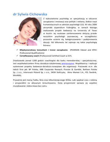 dr Sylwia Cichowska Z wykształcenia psycholog ze specjalizacją w obszarze zarządzania i innowacji oraz polityki i reklamy. Doktor nauk humanistycznych w zakresie psychologii (UJ). W roku 2006 otrzymała stypendium Fulbrighta, w ramach którego realizowała projekt badawczy na University of Texas w Austin. Jej naukowe zainteresowania dotyczą przede wszystkim psychologii poznawczej, w szczególności procesów uczenia się, kategoryzowania i podejmowania decyzji. Od kilkunastu lat zajmuje się także psychologią biznesu. Międzynarodowy konsultant i trener zarządzania (PEARSON Edexel and BTEC Professional Qualifications) Certyfikowany coach (Professional Certified Coach w ICF). Zrealizowała ponad 1200 godzin coachingów dla kadry menedżerskiej i specjalistycznej. Jest współwłaścicielem firmy doradczo-szkoleniowej prorozvoyovo. Współtworzy i realizuje systemowe projekty badawczo-doradczo-rozwojowe dla organizacji. Pracowała m.in. dla takich firm jak: BP Polska, ABB Corporate Reseach, Procter & Gamble, Bahlsen Polska Sp. z o.o., Intersnack Poland Sp. z o.o., SKOK Stefczyka, Alma Market S.A., PZL Świdnik, MiniMAL. Prywatnie jest mamą Tadka, Niny oraz kilkumiesięcznego Witka. Lubi spędzać czas z rodziną i przyjaciółmi na aktywnym leniuchowaniu. Dużą przyjemność sprawia jej wspólne muzykowanie i dobra kawa bez cukru.