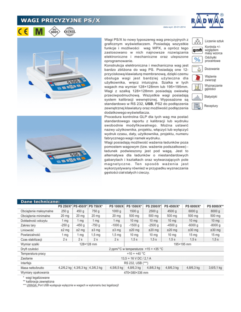 WAGI PRECYZYJNE PS/X data wyd. 20-01-2014 Wagi PS/X to nowy typoszereg wag precyzyjnych z graficznym wyświetlaczem. Posiadają wszystkie funkcje i możliwości wag WPX, a oprócz tego zastosowano w nich najnowsze rozwiązania elektroniczne i mechaniczne oraz ulepszone oprogramowanie. Konstrukcja elektroniczna i mechaniczna wag jest bardzo zbliżona do wag PS. Posiadają one 12przyciskową klawiaturę membranową, dzięki czemu obsługa wagi jest bardziej użyteczna dla użytkownika, wręcz intuicyjna. Szalka w tych wagach ma wymiar 128×128mm lub 195×195mm. Wagi z szalką 128×128mm posiadają owiewkę przeciwpodmuchową. Wszystkie wagi posiadają system kalibracji wewnętrznej. Wyposażone są standardowo w RS 232, USB, PS2 do podłączenia zewnętrznej klawiatury oraz możliwość podłączenia dodatkowego wyświetlacza. Procedura kontrolna GLP dla tych wag ma postać standardowego raportu z kalibracji lub wydruku swobodnie modyfikowalnego. Można ustawić nazwy użytkownika, projektu, włączyć lub wyłączyć wydruk czasu, daty, użytkownika, projektu, numeru fabrycznego wagi i ramek wydruku. Wagi posiadają możliwość ważenia ładunków poza pomostem wagowym (tzw. ważenie podszalkowe) ładunek podwieszony jest pod wagą. Jest to alternatywa dla ładunków o niestandardowych gabarytach i kształtach oraz wytwarzających pole m a g n e t y c z n e . Te n s p o s ó b w a ż e n i a j e s t wykorzystywany również w przypadku wyznaczania gęstości ciał stałych i cieczy. Liczenie sztuk Kontrola +/względem masy wzorca Odchyłki procentowe Dozowanie Ważenie zwierząt Wyznaczanie gęstości Statystyki Receptury Dane techniczne: Obciążenie maksymalne Obciążenie minimalne Dokładność odczytu Zakres tary Liniowość Powtarzalność Czas stabilizacji Wymiar szalki Dryft czułości Temperatura pracy Zasilanie Interfejs Masa netto/brutto Wymiary opakowania PS 250/X* PS 450/X* PS 750/X* 250 g 450 g 750 g 20 mg 20 mg 20 mg 1 mg 1 mg 1 mg -250 g -450 g -750 g ±2 mg ±2 mg ±3 mg 1 mg 1 mg 1,5 mg 2s 2s 2s 128×128 mm 4,2/6,2 kg 4,3/6,3 kg 4,3/6,3 kg PS 1000/X PS 1500/X* 1000 g 1500 g 20 mg 500 mg 1 mg 10 mg -1000 g -1500 g ±3 mg ±20 mg 1,5 mg 10 mg 2s 1,5 s PS 2500/X* PS 4500/X* PS 6000/X* 2500 g 4500 g 6000 g 500 mg 500 mg 500 mg 10 mg 10 mg 10 mg -2500 g -4500 g -6000 g ±20 mg ±20 mg ±30 mg 10 mg 10 mg 15 mg 1,5 s 1,5 s 1,5 s 195×195 mm 2 ppm/°C w temperaturze +15 ÷ +35 °C +10 ÷ +40 °C 13,5 ÷ 16 V DC / 2,1 A RS 232, USB (***) 4,5/6,5 kg 4,8/6,3 kg 4,8/6,3 kg 4,8/6,3 kg 4,8/6,3 kg 470×380×336 mm * wagi legalizowane ** kalibracja zewnętrzna *** UWAGA: Port USB występuje wyłącznie w wagach w wykonaniu bez legalizacji! PS 8000/X** 8000 g 500 mg 10 mg -8000 g ±30 mg 15 mg 1,5 s 3,6/5,1 kg 195 195 8 6 ,5 9 9,6 (13) Wymiary: 333 206 160 160 128 86,5 8 0 ,9 128 333 206 Wyposażenie dodatkowe: Stół antywibracyjny (malowany lub nierdzewny) Drukarka KAFKA 1, KAFKA 1/Z, KAFKA SQ Drukarka EPSON TM-U220D, TM-U220B, TM-U220A Drukarka etykiet “Citizen” Zestaw do wyznaczania gęstości ciał stałych i cieczy Klawiatura PC typu PS/2 Przycisk nożny dla funkcji TARE i PRINT Stelaż do ważenia ładunków pod wagą Dodatkowy wyświetlacz LCD Zewnętrzny zasilacz akumulatorowy z ładowarką Walizka do wagi Program komputerowy POMIAR-WIN, RAD-KEY RADWAG Wagi Elektroniczne · 26-600 Radom, ul. Bracka 28 · tel. +48 48 3848800 · fax. +48 48 3850010 · e-mail:[email protected] · www.radwag.com