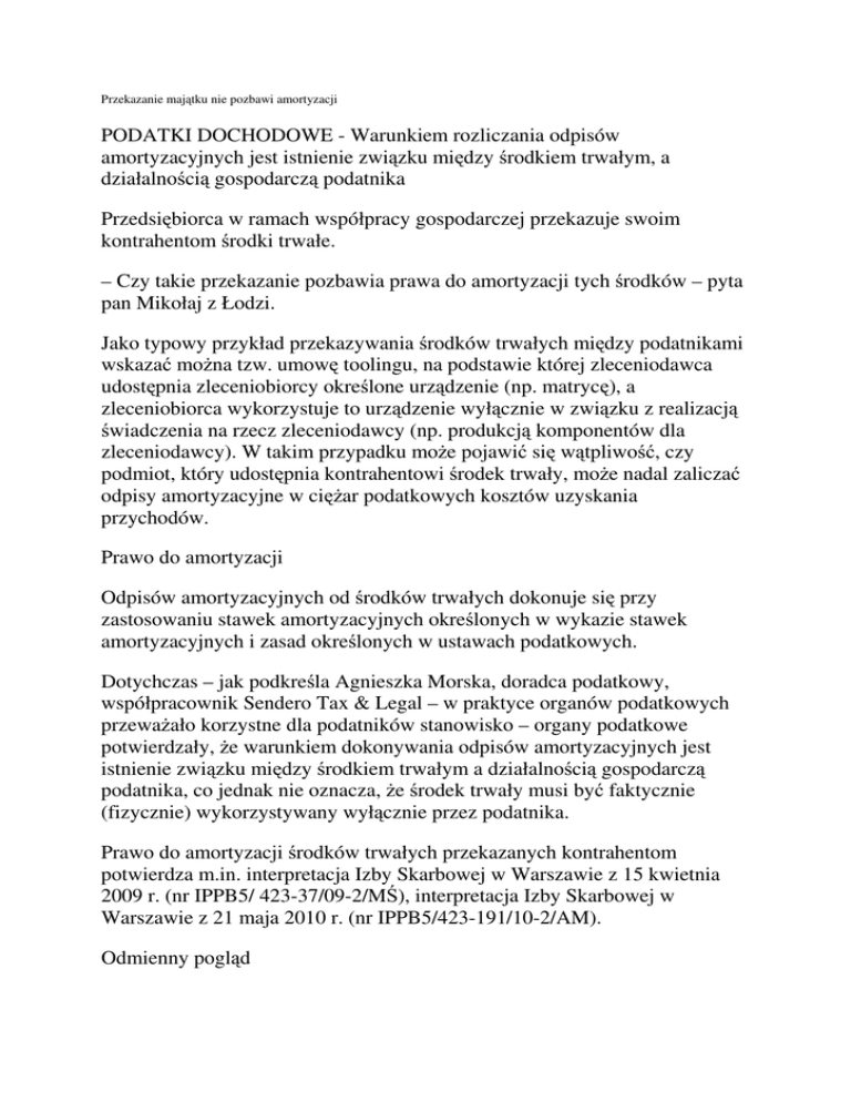 Przekazanie majątku nie pozbawi amortyzacji PODATKI DOCHODOWE - Warunkiem rozliczania odpisów amortyzacyjnych jest istnienie związku między środkiem trwałym, a działalnością gospodarczą podatnika Przedsiębiorca w ramach współpracy gospodarczej przekazuje swoim kontrahentom środki trwałe. – Czy takie przekazanie pozbawia prawa do amortyzacji tych środków – pyta pan Mikołaj z Łodzi. Jako typowy przykład przekazywania środków trwałych między podatnikami wskazać można tzw. umowę toolingu, na podstawie której zleceniodawca udostępnia zleceniobiorcy określone urządzenie (np. matrycę), a zleceniobiorca wykorzystuje to urządzenie wyłącznie w związku z realizacją świadczenia na rzecz zleceniodawcy (np. produkcją komponentów dla zleceniodawcy). W takim przypadku może pojawić się wątpliwość, czy podmiot, który udostępnia kontrahentowi środek trwały, może nadal zaliczać odpisy amortyzacyjne w ciężar podatkowych kosztów uzyskania przychodów. Prawo do amortyzacji Odpisów amortyzacyjnych od środków trwałych dokonuje się przy zastosowaniu stawek amortyzacyjnych określonych w wykazie stawek amortyzacyjnych i zasad określonych w ustawach podatkowych. Dotychczas – jak podkreśla Agnieszka Morska, doradca podatkowy, współpracownik Sendero Tax & Legal – w praktyce organów podatkowych przeważało korzystne dla podatników stanowisko – organy podatkowe potwierdzały, że warunkiem dokonywania odpisów amortyzacyjnych jest istnienie związku między środkiem trwałym a działalnością gospodarczą podatnika, co jednak nie oznacza, że środek trwały musi być faktycznie (fizycznie) wykorzystywany wyłącznie przez podatnika. Prawo do amortyzacji środków trwałych przekazanych kontrahentom potwierdza m.in. interpretacja Izby Skarbowej w Warszawie z 15 kwietnia 2009 r. (nr IPPB5/ 423-37/09-2/MŚ), interpretacja Izby Skarbowej w Warszawie z 21 maja 2010 r. (nr IPPB5/423-191/10-2/AM). Odmienny pogląd Pogląd odmienny, według którego amortyzacja nie może być dokonywana, wyraził Naczelny Sąd Administracyjny w orzeczeniu z 25 lutego 2010 r. (sygn. akt II FSK 1628/08). Agnieszka Morska wskazuje, że w ocenie sądu środek trwały podlega amortyzacji wyłącznie w przypadku, gdy: jest bezpośrednio (fizycznie) wykorzystywany przez podatnika na potrzeby związane z prowadzoną przez niego działalnością gospodarczą albo jest przedmiotem umowy najmu, dzierżawy lub leasingu. Amortyzacji nie podlegają natomiast środki trwałe, które faktycznie wykorzystywane są przez podmiot trzeci, nawet jeżeli wykorzystywanie środka trwałego przez ten podmiot pozostaje w bezpośrednim związku z działalnością gospodarczą podatnika (np. środek trwały służy podmiotowi trzeciemu wyłącznie do realizacji świadczenia na rzecz podatnika). W konsekwencji – jak dodaje ekspert – podmiot, który w ramach współpracy przekazuje kontrahentowi środek trwały – zdaniem składu orzekającego – nie jest uprawniony do zaliczenia odpisów amortyzacyjnych od tego środka trwałego w ciężar podatkowych kosztów uzyskania przychodów. – Brak prawa do amortyzacji nie oznacza jednak, że wydatek na składnik majątkowy przekazany kontrahentowi nie może być w ogóle uznany za koszt – uważa Agnieszka Morska. Można bowiem argumentować, że w takim przypadku wydatek na nabycie składnika majątkowego powinien być odniesiony bezpośrednio w koszty uzyskania przychodów. Ważne! Amortyzacji podlegają, stanowiące własność lub współwłasność podatnika, nabyte lub wytworzone we własnym zakresie, kompletne i zdatne do użytku w dniu przyjęcia do używania: budowle, budynki oraz lokale będące odrębną własnością, maszyny, urządzenia i środki transportu, inne przedmioty – o przewidywanym okresie używania dłuższym niż rok Ewa Matyszewska [email protected]