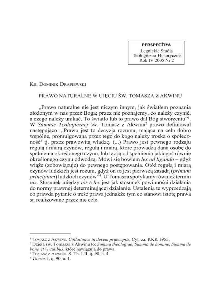 Prawo naturalne w ujęciu św. Tomasza z Akwinu 19 † PERSPECTIVA Legnickie Studia Teologiczno-Historyczne Rok IV 2005 Nr 2 KS. DOMINIK DRAPIEWSKI PRAWO NATURALNE W UJĘCIU ŚW. TOMASZA Z AKWINU „Prawo naturalne nie jest niczym innym, jak światłem poznania złożonym w nas przez Boga; przez nie poznajemy, co należy czynić, a czego należy unikać. To światło lub to prawo dał Bóg stworzeniu”1. W Summie Teologicznej św. Tomasz z Akwinu2 prawo definiował następująco: „Prawo jest to decyzja rozumu, mająca na celu dobro wspólne, promulgowana przez tego do kogo należy troska o społeczność3 tj. przez prawowitą władzę. (...) Prawo jest pewnego rodzaju regułą i miarą czynów, regułą i miarą, które prowadzą daną osobę do spełnienia określonego czynu, lub też ją od spełnienia jakiegoś równie określonego czynu odwodzą. Mówi się bowiem lex od ligando – gdyż wiąże (zobowiązuje) do pewnego postępowania. Otóż regułą i miarą czynów ludzkich jest rozum, gdyż on to jest pierwszą zasadą (primum principium) ludzkich czynów”4. U Tomasza spotykamy również termin ius. Stosunek między ius a lex jest jak stosunek powinności działania do normy prawnej determinującej działanie. Ustalenia te wyprzedzają co prawda pytanie o treść prawa jednakże tym co stanowi istotę prawa są realizowane przez nie cele. TOMASZ Z AKWINU. Collationes in decem praeceptis. Cyt. za: KKK 1955. Dzieła św. Tomasza z Akwinu to: Summa theologiae, Summa de homine, Summa de bono et virtutibus, które nawiązują do prawa. 3 TOMASZ Z AKWINU. S. Th. I-II, q. 90, a. 4. 4 Tamże. I, q. 90, a. 1. 1 2 20 KS. DOMINIK DRAPIEWSKI Mówiąc o prawie naturalnym w ujęciu Tomasza z Akwinu, należy zaznaczyć, że jest ono wplecione w kontekst prawa wiecznego i ludzkiego. Wydaje się więc zasadne zasygnalizowanie zagadnienia tych praw5. Prawo wieczne (lex aeterna) to zamysł Boga określający miejsce i cele poszczególnych rzeczy. Tylko to prawo istnieje samo przez się (per se), a pozostałe rodzaje prawa istnieją przez partycypację w prawie wiecznym. Stworzenia nierozumne uczestniczą w prawie wiecznym instynktownie. Ludzie zaś przy pomocy swojego rozumu6. Prawo natury7 (lex naturalis) jest odbiciem prawa wiecznego w umyśle i pośrednio przez wnioskowanie oddziałuje na świadomość i działania człowieka. Tomasz nazywa je „uczestnictwem prawa wiecznego w stworzeniu rozumnym”8. Oparte jest ono nie na konieczności fizycznej, lecz na głosie sumienia. Nie jest ideą czy postulatem, lecz empirycznie sprawdzalnym wnioskiem płynącym z możliwych do zaobserwowania dążeń i właściwości człowieka. Jest to prawo niepisane i nie wymaga potwierdzenia przez państwo. „Prawo stanowione tylko w takim stopniu jest autentycznym prawem, w jakim zakorzenione jest w prawie naturalnym; jeśli zaś w czymś kłóci się z prawem naturalnym, nie będzie już prawem, lecz niszczeniem prawa”9. 5 Zob. K. J. KOWALSKI. Nauka św. Tomasza o miłosierdziu chrześcijańskim. Lwów 1932 oraz TENŻE. System etyczny św. Tomasza z Akwinu a etyka współczesnego pozytywizmu. „Verbum” 1938 z. 3. s. 417-443. 6 R. TOKARCZYK. Filozofia prawa w retrospektywie prawa natury. Białystok 1996 s. 79. 7 Koncepcję prawa natury wypracowała już przedchrześcijańska starożytność. Głosili ją m.in. dramatopisarz Sofokles (496-406), lekarz Hipokrates (460-377), filozofowie: Platon (427-347), Arystoteles (384-322) i Cyceron (106-43). W obrębie tego ciągu myślenia o prawie różnice zachodziły nie tylko co do uzasadnienia tej koncepcji. Rozbieżności dotyczyły także odpowiedzi, co czynić w sytuacji kolizji między prawem stanowionym a tym co rozpoznane jako prawo naturalne. Sokrates jak wiadomo był zwolennikiem krytyki obowiązującego prawa jednocześnie przy bezwzględnym posłuszeństwie względem niego. Za ten element pozytywizmu prawnego zapłacił dzięki demokracji ateńskiej życiem. 8 S. Th. I-II, q. 90, a. 4. 9 Tamże. I-II, q. 95, a. 2. Np. Platon dozwalał na krytykę sakralizowanego podówczas prawa ze względu na dwa kryteria: sprawiedliwość i dobro wspólne. „Nie są prawdziwymi prawami – pisał Platon – prawa, które są ustanowione nie ze względu na dobro wszystkich w całym państwie”. Zdaniem Platona, „prawo naturalne obowiązuje właściwie tylko prawodawcę (...) na ewentualną niezgodność prawa pisanego z prawem naturalnym wolno wskazywać – z największą jednak dyskrecją – przedstawicielom elity społecznej. Natomiast przeciętnym obywatelom nie wolno jej nawet zauważać”. Arystoteles z kolei obok prawa pozytywnego wymieniał prawo naturalne. Prawo naturalne w ujęciu św. Tomasza z Akwinu 21 Ponieważ człowiek stworzony jest na podobieństwo Boga i całe stworzenie czerpie swe istnienie z uczestnictwa w wiecznych ideach Stwórcy, toteż sam człowiek jest w stanie stworzyć doczesne, czyli wypracowane przez siebie prawa harmonizujące z prawem wiecznym, a to dzięki wykorzystaniu wiecznego prawa wyrytego w umyśle człowieka. Prawo ludzkie (lex humana) rozumie Tomasz jako rozrządzenie rozumu dla dobra wspólnego przez prawowitą władzę wydane i ogłoszone. Na tym poziomie „jest to decyzja rozumu, mająca na celu dobro wspólne (bonum commune), promulgowana przez tego, do kogo należy troska o społeczność”100. Dobro wspólne jest tu podstawą obowiązywania prawa. „Każde prawo ukierunkowane jest ku dobru wspólnemu ludzi i stąd czerpie swoją moc oraz autentyczność jako prawo. W stopniu w jakim brak mu tego nie posiada mocy obowiązującej”11. Prawo ludzkie dzieli się na prawo państwowe i prawo kanoniczne12. Prawo naturalne nie jest w stanie dać ludziom wszystkich niezbędnych reguł postępowania. Prawo ludzkie uzupełnia ogólne zasady prawa naturalnego za pomocą wnioskowania (conclusio) i bliższego uszczegółowienia tych zasad (determinatio). Nie wszystko to, co jest przedmiotem powinności moralnej ma być re