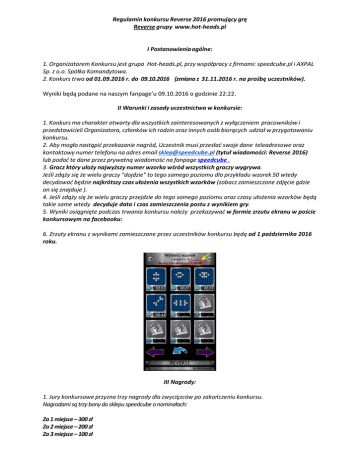 Regulamin konkursu Reverse 2016 promujący grę Reverse grupy www.hot-heads.pl I Postanowienia ogólne: 1. Organizatorem Konkursu jest grupa Hot-heads.pl, przy współpracy z firmami: speedcube.pl i AXPAL Sp. z o.o. Spółka Komandytowa. 2. Konkurs trwa od 01.09.2016 r. do 09.10.2016 (zmiana z 31.11.2016 r. na prośbę uczestników). Wyniki będą podane na naszym fanpage’u 09.10.2016 o godzinie 22:22. II Warunki i zasady uczestnictwa w konkursie: 1. Konkurs ma charakter otwarty dla wszystkich zainteresowanych z wyłączeniem pracowników i przedstawicieli Organizatora, członków ich rodzin oraz innych osób biorących udział w przygotowaniu konkursu. 2. Aby mogło nastąpić przekazanie nagród, Uczestnik musi przesłać swoje dane teleadresowe oraz kontaktowy numer telefonu na adres email [email protected] (tytuł wiadomości: Reverse 2016) lub podać te dane przez prywatną wiadomość na fanpage speedcube . 3. Gracz który ułoży najwyższy numer wzorka wśród wszystkich graczy wygrywa. Jeśli zdąży się że wielu graczy "dojdzie" to tego samego poziomu dla przykładu wzorek 50 wtedy decydować będzie najkrótszy czas ułożenia wszystkich wzorków (zobacz zamieszczone zdjęcie gdzie on się znajduje ). 4. Jeśli zdąży się że wielu graczy przejdzie do tego samego poziomu oraz czasy ułożenia wzorków będą takie same wtedy decyduje data i czas zamieszczenia postu z wynikiem gry. 5. Wyniki osiągnięte podczas trwania konkursu należy przekazywać w formie zrzutu ekranu w poście konkursowym na facebooku: 6. Zrzuty ekranu z wynikami zamieszczane przez uczestników konkursu będą od 1 października 2016 roku. III Nagrody: 1. Jury konkursowe przyzna trzy nagrody dla zwycięzców po zakończeniu konkursu. Nagrodami są trzy bony do sklepu speedcube o nominałach: Za 1 miejsce – 300 zł Za 2 miejsce – 200 zł Za 3 miejsce – 100 zł IV Prawa autorskie i dane osobowe: Dane osobowe przekazane Organizatorowi przez Uczestników konkursu będą przez niego przetwarzane zgodnie z przepisami ustawy z dnia 29 sierpnia 1997r. o ochronie danych osobowych, tylko i wyłącznie do celów niniejszego konkursu, na co Uczestnik konkursu wyraża zgodę poprzez przystąpienie do konkursu. V Postanowienia końcowe: 1. Treść Regulaminu dostępna jest na stronie internetowej Speedcube.pl. 2. Organizator zastrzega sobie prawo zmiany regulaminu, jeżeli nie wpłynie ona na pogorszenie warunków uczestnictwa w konkursie, 3. Zgłoszenie do udziału w konkursie jest równoznaczne z akceptacją niniejszego Regulaminu. 3. Organizator nie ponosi odpowiedzialności za szkody (zarówno majątkowe jak i niemajątkowe) poniesione przez Uczestnika Konkursu bądź przez osoby trzecie, w związku z uczestnictwem w Konkursie. 4. Do spraw nie ujętych w niniejszym regulaminie, stosuje się odpowiednio przepisy kodeksu cywilnego oraz ustawy o prawie autorskim i prawach pokrewnych.