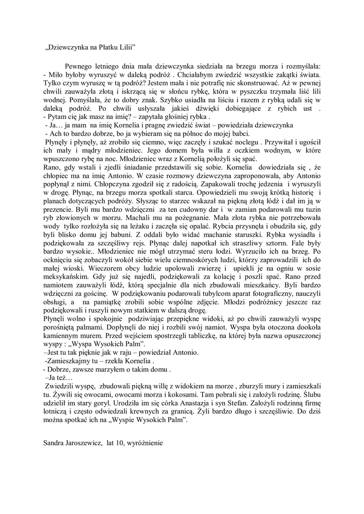 „Dziewczynka na Płatku Lilii” Pewnego letniego dnia mała dziewczynka siedziała na brzegu morza i rozmyślała: - Miło byłoby wyruszyć w daleką podróż . Chciałabym zwiedzić wszystkie zakątki świata. Tylko czym wyruszę w tą podróż? Jestem mała i nie potrafię nic skonstruować. Aż w pewnej chwili zauważyła złotą i iskrzącą się w słońcu rybkę, która w pyszczku trzymała liść lili wodnej. Pomyślała, że to dobry znak. Szybko usiadła na liściu i razem z rybką udali się w daleką podróż. Po chwili usłyszała jakieś dźwięki dobiegające z rybich ust . - Pytam cię jak masz na imię? – zapytała głośniej rybka . - Ja… ja mam na imię Kornelia i pragnę zwiedzić świat – powiedziała dziewczynka - Ach to bardzo dobrze, bo ja wybieram się na północ do mojej babci. Płynęły i płynęły, aż zrobiło się ciemno, więc zaczęły i szukać noclegu . Przywitał i ugościł ich mały i mądry młodzieniec. Jego domem była willa z oczkiem wodnym, w które wpuszczono rybę na noc. Młodzieniec wraz z Kornelią położyli się spać. Rano, gdy wstali i zjedli śniadanie przedstawili się sobie. Kornelia dowiedziała się , że chłopiec ma na imię Antonio. W czasie rozmowy dziewczyna zaproponowała, aby Antonio popłynął z nimi. Chłopczyna zgodził się z radością. Zapakowali trochę jedzenia i wyruszyli w drogę. Płynąc, na brzegu morza spotkali starca. Opowiedzieli mu swoją krótką historię i planach dotyczących podróży. Słysząc to starzec wskazał na piękną złotą łódź i dał im ją w prezencie. Byli mu bardzo wdzięczni za ten cudowny dar i w zamian podarowali mu tuzin ryb złowionych w morzu. Machali mu na pożegnanie. Mała złota rybka nie potrzebowała wody tylko rozłożyła się na leżaku i zaczęła się opalać. Rybcia przysnęła i obudziła się, gdy byli blisko domu jej babuni. Z oddali było widać machanie staruszki. Rybka wysiadła i podziękowała za szczęśliwy rejs. Płynąc dalej napotkał ich straszliwy sztorm. Fale były bardzo wysokie.. Młodzieniec nie mógł utrzymać steru łodzi. Wyrzuciło ich na brzeg. Po ocknięciu się zobaczyli wokół siebie wielu ciemnoskórych ludzi, którzy zaprowadzili ich do małej wioski. Wieczorem obcy ludzie upolowali zwierzę i upiekli je na ogniu w sosie meksykańskim. Gdy już się najedli, podziękowali za kolację i poszli spać. Rano przed namiotem zauważyli łódź, którą specjalnie dla nich zbudowali mieszkańcy. Byli bardzo wdzięczni za gościnę. W podziękowaniu podarowali tubylcom aparat fotograficzny, nauczyli obsługi, a na pamiątkę zrobili sobie wspólne zdjęcie. Młodzi podróżnicy jeszcze raz podziękowali i ruszyli nowym statkiem w dalszą drogę. Płynęli wolno i spokojnie podziwiając przepiękne widoki, aż po chwili zauważyli wyspę porośniętą palmami. Dopłynęli do niej i rozbili swój namiot. Wyspa była otoczona dookoła kamiennym murem. Przed wejściem spostrzegli tabliczkę, na której była nazwa opuszczonej wyspy : „Wyspa Wysokich Palm”. –Jest tu tak pięknie jak w raju – powiedział Antonio. -Zamieszkajmy tu – rzekła Kornelia . - Dobrze, zawsze marzyłem o takim domu . –Ja też… Zwiedzili wyspę, zbudowali piękną willę z widokiem na morze , zburzyli mury i zamieszkali tu. Żywili się owocami, owocami morza i kokosami. Tam pobrali się i założyli rodzinę. Ślubu udzielił im stary goryl. Urodziła im się córka Anastazja i syn Stefan. Założyli rodzinną firmę lotniczą i często odwiedzali krewnych za granicą. Żyli bardzo długo i szczęśliwie. Do dziś można spotkać ich na „Wyspie Wysokich Palm”. Sandra Jaroszewicz, lat 10, wyróżnienie