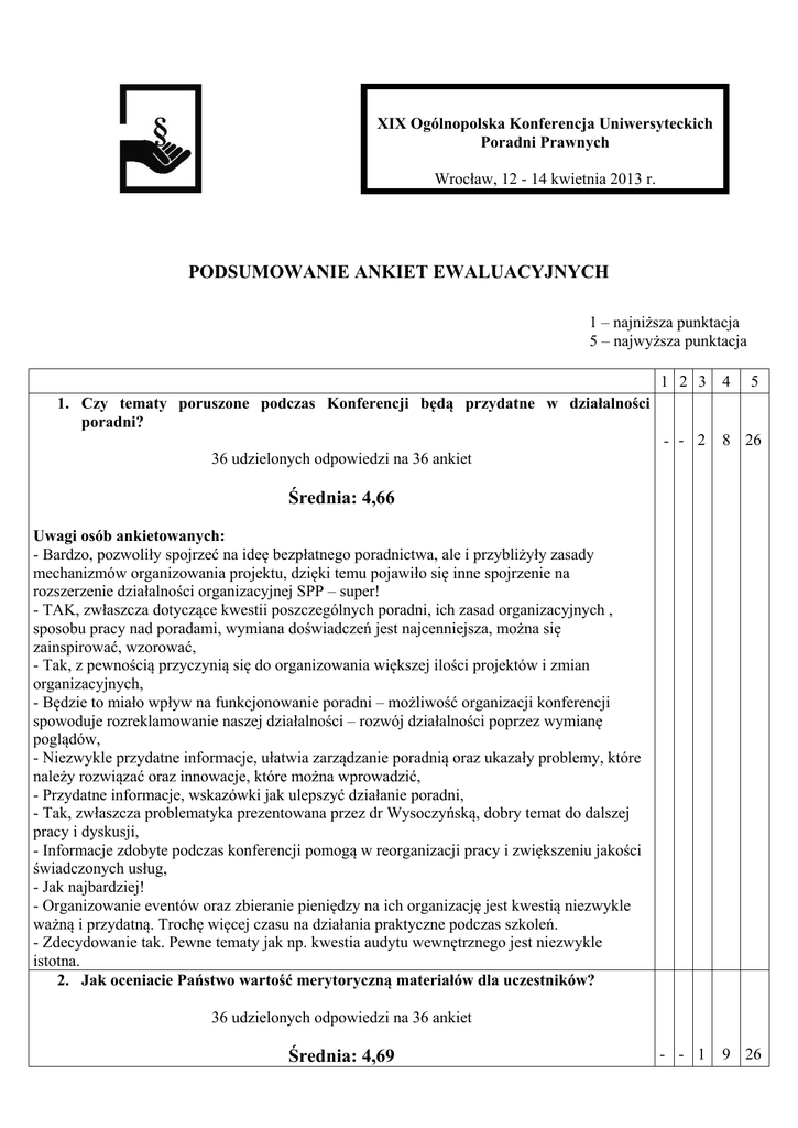 XIX Ogólnopolska Konferencja Uniwersyteckich Poradni Prawnych Wrocław, 12 - 14 kwietnia 2013 r. PODSUMOWANIE ANKIET EWALUACYJNYCH 1 – najniższa punktacja 5 – najwyższa punktacja 1 2 3 4 5 1. Czy tematy poruszone podczas Konferencji będą przydatne w działalności poradni? - - 2 8 26 - - 1 9 26 36 udzielonych odpowiedzi na 36 ankiet Średnia: 4,66 Uwagi osób ankietowanych: - Bardzo, pozwoliły spojrzeć na ideę bezpłatnego poradnictwa, ale i przybliżyły zasady mechanizmów organizowania projektu, dzięki temu pojawiło się inne spojrzenie na rozszerzenie działalności organizacyjnej SPP – super! - TAK, zwłaszcza dotyczące kwestii poszczególnych poradni, ich zasad organizacyjnych , sposobu pracy nad poradami, wymiana doświadczeń jest najcenniejsza, można się zainspirować, wzorować, - Tak, z pewnością przyczynią się do organizowania większej ilości projektów i zmian organizacyjnych, - Będzie to miało wpływ na funkcjonowanie poradni – możliwość organizacji konferencji spowoduje rozreklamowanie naszej działalności – rozwój działalności poprzez wymianę poglądów, - Niezwykle przydatne informacje, ułatwia zarządzanie poradnią oraz ukazały problemy, które należy rozwiązać oraz innowacje, które można wprowadzić, - Przydatne informacje, wskazówki jak ulepszyć działanie poradni, - Tak, zwłaszcza problematyka prezentowana przez dr Wysoczyńską, dobry temat do dalszej pracy i dyskusji, - Informacje zdobyte podczas konferencji pomogą w reorganizacji pracy i zwiększeniu jakości świadczonych usług, - Jak najbardziej! - Organizowanie eventów oraz zbieranie pieniędzy na ich organizację jest kwestią niezwykle ważną i przydatną. Trochę więcej czasu na działania praktyczne podczas szkoleń. - Zdecydowanie tak. Pewne tematy jak np. kwestia audytu wewnętrznego jest niezwykle istotna. 2. Jak oceniacie Państwo wartość merytoryczną materiałów dla uczestników? 36 udzielonych odpowiedzi na 36 ankiet Średnia: 4,69 Uwagi osób ankietowanych: - Bardzo wysoka. - Bardzo bogate pakiety uczestników, na szczęście brak nieprzydatnych materiałów reklamowych. 3. Jak oceniacie Państwo uroczystość otwarcia Konferencji ? 33 udzielonych odpowiedzi na 36 ankiet Średnia: 4,52 - - 3 10 20 Uwagi osób ankietowanych: - W większości powtórzenie informacji, które były już znane uczestnikom, - Powinny być punkty, według których prezentują się poradnie, - Wspomnienia bardzo dobre, ale dla podniesienia rangi klinik prawnych powinno się zaprosić np. środowiska samorządowe i prawnicze, - Trzeba w przyszłości przeznaczyć nieco więcej czasu, - Ładna sala, - Piękna sala, oprawa konferencji na bardzo wysokim poziomie. 4. Jak oceniacie Państwo warsztaty dr Maxima Tomoszka pt. „Legal Writing”? (pytanie skierowane do Opiekunów) 15 udzielonych odpowiedzi na 36 ankiet Średnia : 4,33 1 - 2 2 10 Uwagi osób ankietowanych: - Nie uczestniczyłam/em x6 - Bardzo przydatne, prowadzone świetnie - Super, niezmiernie przydatne, - Zajęcia ciekawe, ale nie powinny być pierwszymi zajęciami w danym dniu, najpierw należy przegadać inne problemy, - Niestety niezbyt dobrze, bo tylko zadawane były pytania, na które nie było żadnej odpowiedzi, ale prowadzący bardzo sympatyczny, - Była dyskusja, trudno nazwać warsztatem, - Raczej jest debata niż warsztatem, mało się nauczyłam, lecz dyskutowaliśmy. 5. Jak oceniacie Państwo warsztaty dr Małgorzaty Wysoczyńskiej pt. ”Wewnętrzna kontrola jakości porad prawnych”? (pytanie skierowane do opiekunów) 18 udzielonych odpowiedzi na 36 ankiet Średnia: 4,77 - - 2 - 16 Uwagi osób ankietowanych: - Nie uczestniczyłam/em x5 - Szkoda, że tak mało czasu na dyskusję, - Rewelacja, - Po raz pierwszy na konferencji został przedstawiony temat, z którym kliniki się borykają, ale nie miały możliwości podzielenia się swoimi doświadczeniami. 6. Jak oceniacie Państwo warsztaty Aleksandry Klich i Aliny Barkowej pt. ”Fundrising oraz organizacja konferencji”? (pytanie skierowane do studentów) - - 21 udzielonych odpowiedzi na 36 ankiet 2 19 Średnia: 4,90 Uwagi osób ankietowanych: - Nie uczestniczyłam/em x6, - Niezwykle przydatne zajęcia, wiele rad i wskazówek na pewno zostanie wykorzystanych w praktyce, - Bardzo profesjonalnie, ciekawie, pożytecznie, możliwość wykorzystania teorii w praktyce, - Warsztat prowadzony w sposób praktyczny, pozwalający na poznanie tematu od podszewki, - Jedyny problem to zbyt mała ilość czasu x 2, - Zajęcia były bardzo ciekawe i pouczające. 7. Jak oceniacie Państwo prezentację i dyskusję poprowadzoną przez dr Martę Skrodzką pt. „Dyskusja nad modelem poradnictwa prawnego i obywatelskiego w Polsce”? - - 2 4 29 35 udzielonych odpowiedzi na 36 ankiet Średnia: 4,77 Uwagi osób ankietowanych: - Bardzo potrzebna dyskusja, wyraźna potrzeba opracowania tego projektu, bardzo ważne społecznie, - Dużo argumentów, wiele spojrzeń na problem co pokazuje szczegółowe przemyślenie tematu, - Przydatny dla dalszego funkcjonowania poradni prawnych w Polsce, - Dyskusja była zachwycająca i skłaniająca do dalszych przemyśleń, - Bardzo profesjonalnie przygotowana – warto by po tylu latach kliniki znalazły swoje miejsce i były dofinansowane przez państwo, - Bardzo przejrzyste przedstawienie projektu. 8. Jak oceniacie Państwo dyskusję prowadzoną przez dr Magdalenę Olczyk pt. „Najczęstsze problemy działania Klinik”? - 2 4 8 16 30 udzielonych odpowiedzi na 36 ankiet Średnia: 4,26 Uwagi osób ankietowanych: - Bardzo mało czasu na omówienie wszystkich problemów i znalezienie rozwiązań x3, - Wskazanie punktów problemowych, faktycznych problemowych, dobrze, że inicjuje kroki celem ich rozwiązania, - Sprawy były bardzo ciekawe x2, - Nie wszystkie problemy są tymi, które spotykamy w naszej poradni, - Interesujący ale bardzo subiektywny, brak szerszego kontekstu i wyjścia poza własne doświadczenia, - Chaotyczne pr