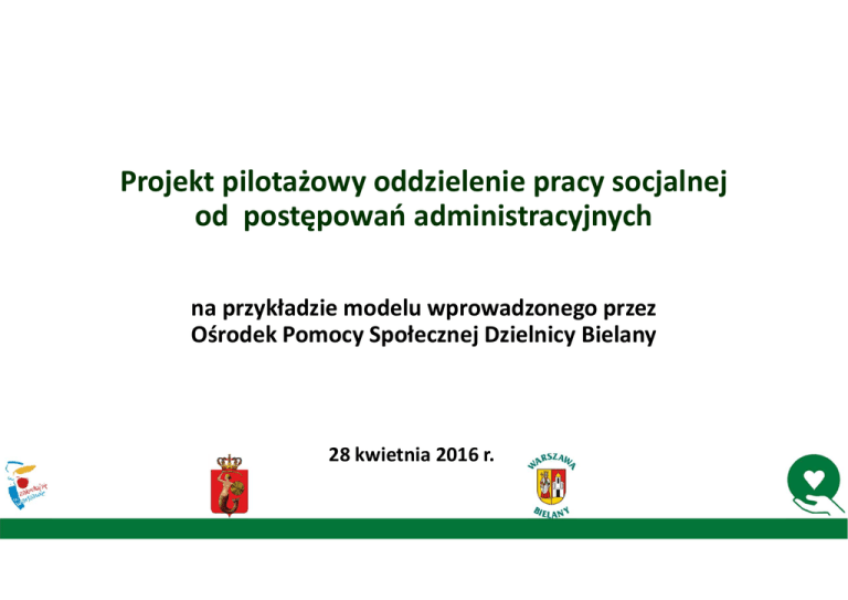 Projekt pilotażowy oddzielenie pracy socjalnej od postępowań administracyjnych na przykładzie modelu wprowadzonego przez Ośrodek Pomocy Społecznej Dzielnicy Bielany 28 kwietnia 2016 r. Ośrodek Pomocy Społecznej Dzielnicy Bielany jest jednym 18 OPS funkcjonujących na terenie Warszawy. Fakty Z pomocy OPS Dzielnicy Bielany skorzystało w 2015 r. 6 821 osób (3 878 gospodarstw domowych), tj. ok. 5,33% wszystkich mieszkańców Dzielnicy. W sprawach świadczeń pieniężnych realizowanych zgodnie z ustawą o pomocy społecznej w 2015 r. wydano 18 440 decyzji administracyjnych i postanowień. Z usługi pracy socjalnej skorzystało w tym czasie 1751 rodzin (3152 osób w rodzinach). W OPS jest zatrudnionych 117 pracowników, w tym 54 pracowników socjalnych. Badanie ex-ante 24 - 31 sierpnia 2015 r. • Badanie zostało przeprowadzone na terenie Ośrodka Pomocy Społecznej Dzielnicy Bielany m.st. Warszawy w terminie 24 - 31 sierpnia 2015 r. W badaniu wzięły udział 52 osoby, pracownicy OPS z różnych działów (nie tylko pracownicy socjalni). • Głównym narzędziem badawczym była ankieta złożona z 10 pytań, zarówno otwartych, jak i zamkniętych. Była wypełniana przez pracowników anonimowo, w swoich pokojach. • Badanie miało w głównej mierze charakter eksploracyjny (poznawczy) i jego zadaniem było zidentyfikowanie obaw pracowników związanych z wprowadzaniem zmian przepisów prawnych i zapowiadanym ustawowym oddzieleniu pracy socjalnej od działań administracyjnych związanych z udzielaniem świadczeń. Badanie miało także pokazać, na ile pracownicy ośrodka pomocy społecznej są wyposażeni w wiedzę na ten temat. • Ankietę wypełniło: 46 kobiet i 6 mężczyzn. OPINIE NA TEMAT ODDZIELENIA ZADAŃ ZWIĄZANYCH Z PROWADZANIEM POSTĘPOWANIA ADMINISTRACYJNEGO OD WYKONYWANIA PRACY SOCJALNEJ Czy jest Pani/Pan za oddzieleniem zadań związanych z prowadzeniem postępowania administracyjnego od wykonywania pracy socjalnej? OPINIE NA TEMAT ODDZIELENIA ZADAŃ ZWIĄZANYCH Z PROWADZANIEM POSTĘPOWANIA ADMINISTRACYJNEGO OD WYKONYWANIA PRACY SOCJALNEJ „Zbyt duża biurokracja ogranicza pomoc klientowi w postaci pracy socjalnej. Pracownicy socjalni skupiają się głównie na przyznawaniu pomocy materialnej klientowi, ponieważ z tego są rozliczani. Motywowanie klienta do pozytywnych działań schodzi na dalszy plan.” „Przyznawanie świadczeń materialnych, wydawanie decyzji administracyjnych wiąże się z presją czasu, co nie zawsze sprzyja efektywnej pracy socjalnej.” „W związku z prowadzeniem postepowania administracyjnego w wielu przypadkach praca socjalna jest pomijana. Pracownik socjalny często pełni funkcję osoby kontrolującej i nakazującej.” „Obecnie pracownik socjalny postrzegany jest jako urzędnik, który zajmuje się wypłatą zasiłków. Problem tkwi głównie w mentalności społecznej, którą ukształtował stary system i dotyczy to nie tylko klientów, ale również instytucji. Zmiana metody daje szansę na zmianę podejścia „klienta”, który stałby się partnerem naszych działań. Podstawowe cele naszej pracy są marginalizowane i schodzą na dalszy plan. Liczy się „papier”, bo z nich jesteśmy rozliczani. Czasu na właściwą pracę socjalną nie wystarcza w takim wymiarze jak tego wymaga sytuacja. Brakuje również właściwych narzędzi.” OPINIE NA TEMAT ODDZIELENIA ZADAŃ ZWIĄZANYCH Z PROWADZANIEM POSTĘPOWANIA ADMINISTRACYJNEGO OD WYKONYWANIA PRACY SOCJALNEJ „Widzę potrzebę bardziej twórczej i efektywnej pracy z klientem polegającej na towarzyszeniu mu i motywowaniu do wprowadzania zmian w życie i wyjście ze strefy bezradności (…). Pomoc opierana głównie na przyznawaniu pomocy finansowej (a tak to właśnie teraz wygląda) jest według mnie szkodliwa i nie przynosi długotrwałej zmiany, wręcz przeciwnie, uzależnia od instytucji pomocy społecznej. Moim zdaniem, mądra pomoc udzielana ludziom przeżywającym trudności powinna być przede wszystkim pracą „miękką”, wspieraną przez pomoc finansową (przyznawaną wedle obiektywnych kryteriów przez niezależną osobę tzn. niezaangażowaną w pracę socjalną). Osoba, która przyznaje pomoc finansową nie powinna być tą samą, która pracuje z klientem „na co dzień” (…).” „ (…) Pracownicy nie są rozliczani z efektywności swych działań w zakresie wsparcia rodzin w uniezależnianiu się od systemu pomocy społecznej, nie pracują na mocnych stronach klienta. Powyższa sytuacja wpływa na dorastaniu kolejnych pokoleń żerujących na systemie pomocy społecznej, co wpływa na budżet państwa.” OPINIE NA TEMAT ODDZIELENIA ZADAŃ ZWIĄZANYCH Z PROWADZANIEM POSTĘPOWANIA ADMINISTRACYJNEGO OD WYKONYWANIA PRACY SOCJALNEJ Odpowiedzi na nie: „Pomoc materialna jest zależna od wywiązywania się z ustaleń wypracowanych w pracy socjalnej.” „Uważam, że nie jest możliwe oddzielenie pracy socjalnej od postepowania administracyjnego. Przez lata pracownicy socjalni świadczyli kompleksową pomoc, odbywali odpowiednie szkolenia w tym kierunku. Uważam, że dla naszych klientów obciążająca będzie sytuacja, gdy w środowisko wchodzić będzie kilka osób. Dodatkowo może to prowadzić do sytuacji konfliktowych między pracownikami.” „Trudny do podziału zakres kompetencji i odpowiedzialności. Dwóch pracowników, jeden klient, różne pomysły rozwiązań. Obawiam się, że nie ma możliwości ścisłego podziału, kto co robi. Każdy ma inne wyobrażenie i wypracowane formy pracy (…).” „Praca socjalna to proces, który przywraca zdolność do prawidłowego funkcjonowania lub poprawę funkcjonowania. Diagnozując środowisko (problemy rodziny) wiem, czy ten proces zakończy się decyzją administracyjną (np. usługi opiekuńcze, pomoc materialna, pobyt w ośrodku wsparcia) czy będzie wymagał rozszerzonych działań oraz współpracy innych instytucji i osób ( np. problemy opiekuńczo- wychowawcze, przemoc, bezdomno