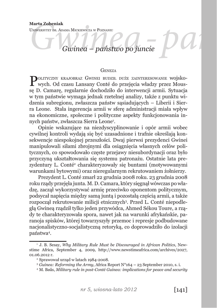 Gwinea - pań Marta Zobeniak Uniwersytet im. Adama Mickiewicza w Poznaniu Gwinea – państwo po juncie P Geneza Gwinei budził duże zainteresowanie wojskowych. Od czasu Lansany Conté do przejęcia władzy przez Moussę D. Camarę, regularnie dochodziło do interwencji armii. Sytuacja w tym państwie wymaga jednak rzetelnej analizy, także z punktu widzenia subregionu, zwłaszcza państw sąsiadujących – Liberii i Sierra Leone. Stała ingerencja armii w sferę administracji miała wpływ na ekonomiczne, społeczne i polityczne aspekty funkcjonowania innych państw, zwłaszcza Sierra Leone1. Opinie wskazujące na niezdyscyplinowanie i opór armii wobec cywilnej kontroli wydają się być uzasadnione i trafnie określają konsekwencje niespokojnej przeszłości. Dwaj pierwsi prezydenci Gwinei manipulowali siłami zbrojnymi dla osiągnięcia własnych celów politycznych, co spowodowało częste przejawy niesubordynacji oraz było przyczyną ukształtowania się systemu patronażu. Ostatnie lata prezydentury L. Conté2 charakteryzowały się buntami (motywowanymi warunkami bytowymi) oraz nieregularnym rekrutowaniem żołnierzy. Prezydent L. Conté zmarł 22 grudnia 2008 roku. 23 grudnia 2008 roku rządy przejęła junta. M. D. Camara, który sięgnął wówczas po władzę, zaczął wykorzystywać armię przeciwko oponentom politycznym, podsycał napięcia między samą juntą i pozostałą częścią armii, a także rozpoczął rekrutowanie milicji etnicznych3. Przed L. Conté niepodległą Gwineą rządził tylko jeden przywódca, Ahmed Sékou Toure, a rządy te charakteryzowała spora, nawet jak na warunki afrykańskie, paranoja spisków, której towarzyszyły przemoc i represje podbudowane nacjonalistyczno-socjalistyczną retoryką, co doprowadziło do izolacji państwa4. olityczny krajobraz 1 J. B. Sesay, Why Military Rule Must be Discouraged in African Politics, Newstime Africa, September 4, 2009, http://www.newstimeafrica.com/archives/2027, 01.06.2012 r. 2 Sprawował urząd w latach 1984-2008. 3 Guinea: Reforming the Army, Africa Report N°164 – 23 September 2010, s. i. 4 M. Bøås, Military rule in post-Conté Guinea: implications for peace and security nr 5, wiosna-lato 2012 [141] Marta Zobeniak W siłach zbrojnych zafunkcjonowały podziały etniczne i pokoleniowe. Wojskowi oskarżani byli o niesubordynację, przypadki naruszania praw człowieka i przestępstwa kryminalne. Sprzeciw budziło dostatnie życie wąskiej grupy wyższych oficerów. System finansowania pozostawał nieprzejrzysty i skażony korupcją. Instytucje nadzoru były słabe lub nie działały w ogóle. Jedynie zasadnicza reforma mogła przyczynić się do ukształtowania bezpiecznego środowiska dla rozwoju demokracji5. Od kiedy generał Sékouba Konaté objął stanowisko pełniącego obowiązki prezydenta (3 grudnia 2009), reforma sił zbrojnych nabrała nowego znaczenia. Poprawiła się dyscyplina, a władze tymczasowe z zadowoleniem przyjęły sporządzony w maju 2010 roku raport misji ds. reform w sektorze bezpieczeństwa wysłanej przez ECOWAS. Armia pozostawała neutralna wobec toczącego się procesu wyborczego. M. D. Camara, którego wpływy malały, przebywał nadal na wygnaniu w Burkina Faso. Trudno było przewidzieć, jaki zakres reform zaakceptują wyżsi oficerowie6. Nowy prezydent musiał stawić czoła presji pchającej go w przeciwnych kierunkach. Konieczne stało się najpierw zbudowanie konsensu w samej armii, co miało umożliwić zaakceptowanie reform przez wojskowych. Problem stanowiło pogodzenie oczekiwań wśród oficerów z rzeczywistymi potrzebami w zakresie obronności7. Nastroje panujące w samej armii również nie były jednoznaczne – chęć zaangażowania się w reformy mieszała się z obawami przed utratą stanowisk czy poniesieniem konsekwencji naruszeń prawa8. Istniało ryzyko, że wojskowi zrezygnują z władzy formalnej, ale będą dążyli do zachowania wpływów i ostatecznie odmówią poddania się cywilnej kontroli. Taka sytuacja miała miejsce w Gwinei Bissau, gdzie reformy prowadzone pod patronatem ONZ i Unii Europejskiej nie powiodły się, ponieważ przedstawiciele sił zbrojnych rozgrywali aktorów zewnętrznych przeciwko sobie. Właściwa koordynacja stała in the Mano River Basin, The Nordic Africa Institute, http://www.nai.uu.se/press/articles/military_rule/, 01.06.2012 r. 5 Guinea: Reforming…, op. cit., s. i. 6 Ibidem. 7 Celem projektowanej reformy było powołanie sił o wiele mniejszych, odpowiedzialnych przed cywilami, zdolnych do zaspokojenia potrzeb w zakresie bezpieczeństwa. Długoterminowe cele obejmować miały wzmocnienie cywilnej kontroli nad armią, cięcia w stanie liczebnym armii, jak również ustanowienia przejrzystości finansowania. 8 Guinea: Reforming…, op. cit., s. i. [142] refleksje Gwinea – państwo po juncie się koniecznością, pozwalała uniknąć tego samego scenariusza w przypadku Gwinei9. Wydarzenia z 28 września 2009 r. Wczesnym rankiem 28 września 2009 r. siły bezpieczeństwa otworzyły ogień do osób zgromadzonych na stadionie w Konakry. Demonstracja została zorganizowana przez ugrupowania opozycyjne w celu zaprotestowania przeciw coraz bardziej widocznej intencji M. D. Camary wzięcia udziału w zaplanowanych na 31 stycznia 2010 roku wyborach prezydenckich10. W momencie, gdy liderzy partii mieli przemówić do około pięćdziesięciu tysięcy osób, umundurowani mężczyźni wkroczyli na stadion, zamknęli bramki i otworzyli ogień11. Do zabójstw dochodziło zarówno na samym stadionie, jak i poza nim. Zabicie ponad 180 demonstrantów12 podczas manifestacji, gwałty dokonywane na ich uczestniczkach13, a także aresztowania liderów politycznych, pokazały, jakie niebezpieczeństwo niosą z sobą rządy wojskowych, a zwłaszcza we wrażliwych państwach, odbudowujących się po wojnach domowych. Junta, National Council for Democracy and Development (Conseil national pour la démocratie et le développement, CN