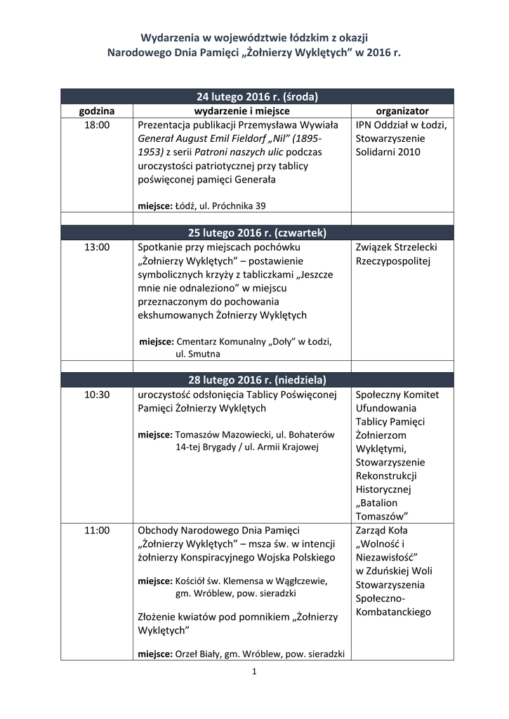 Wydarzenia w województwie łódzkim z okazji Narodowego Dnia Pamięci „Żołnierzy Wyklętych” w 2016 r. 24 lutego 2016 r. (środa) godzina 18:00 wydarzenie i miejsce Prezentacja publikacji Przemysława Wywiała Generał August Emil Fieldorf „Nil” (18951953) z serii Patroni naszych ulic podczas uroczystości patriotycznej przy tablicy poświęconej pamięci Generała organizator IPN Oddział w Łodzi, Stowarzyszenie Solidarni 2010 miejsce: Łódź, ul. Próchnika 39 25 lutego 2016 r. (czwartek) 13:00 Spotkanie przy miejscach pochówku „Żołnierzy Wyklętych” – postawienie symbolicznych krzyży z tabliczkami „Jeszcze mnie nie odnaleziono” w miejscu przeznaczonym do pochowania ekshumowanych Żołnierzy Wyklętych Związek Strzelecki Rzeczypospolitej miejsce: Cmentarz Komunalny „Doły” w Łodzi, ul. Smutna 28 lutego 2016 r. (niedziela) 10:30 uroczystość odsłonięcia Tablicy Poświęconej Pamięci Żołnierzy Wyklętych miejsce: Tomaszów Mazowiecki, ul. Bohaterów 14-tej Brygady / ul. Armii Krajowej 11:00 Obchody Narodowego Dnia Pamięci „Żołnierzy Wyklętych” – msza św. w intencji żołnierzy Konspiracyjnego Wojska Polskiego miejsce: Kościół św. Klemensa w Wągłczewie, gm. Wróblew, pow. sieradzki Złożenie kwiatów pod pomnikiem „Żołnierzy Wyklętych” miejsce: Orzeł Biały, gm. Wróblew, pow. sieradzki 1 Społeczny Komitet Ufundowania Tablicy Pamięci Żołnierzom Wyklętymi, Stowarzyszenie Rekonstrukcji Historycznej „Batalion Tomaszów” Zarząd Koła „Wolność i Niezawisłość” w Zduńskiej Woli Stowarzyszenia SpołecznoKombatanckiego Wydarzenia w województwie łódzkim z okazji Narodowego Dnia Pamięci „Żołnierzy Wyklętych” w 2016 r. 11:00 IV Bieg Tropem Wilczym Pamięci „Żołnierzy Wyklętych” miejsce: stadion ŁKS w Łodzi, al. Unii Lubelskiej 2 12:30 Prelekcja dr. Tomasza Toborka o „Żołnierzach Wyklętych” Stowarzyszenie Kibiców Łódzkiego Klubu Sportowego, Fundacja Wolność i Demokracja IPN Oddział w Łodzi, Związek Strzelecki Rzeczypospolitej miejsce: Kościół Wniebowzięcia NMP w Łodzi, Plac Kościelny 13:00 uroczysta msza św. w intencji „Żołnierzy Wyklętych” Związek Strzelecki Rzeczypospolitej miejsce: Kościół Wniebowzięcia NMP w Łodzi, Plac Kościelny 14:00 II Opoczyński Bieg Tropem Wilczym Pamięci „Żołnierzy Wyklętych” trasa biegu: wokół Zalewu Opoczyńskiego 14:15 Otwarcie wystawy o „Żołnierzach Wyklętych” oraz poświęcenie tablicy upamiętniającej „Żołnierzy Wyklętych” Poseł na Sejm RP Robert Telus, Fundacja Wolność i Demokracja Związek Strzelecki Rzeczypospolitej miejsce: Kościół Wniebowzięcia NMP w Łodzi, Plac Kościelny 14:00 – 15:00 Marsz Pamięci „Żołnierzy Wyklętych” Społeczny Komitet Organizacji Marszu trasa marszu: Łódź, Stary Rynek – ul. Nowomiejska – Plac Wolności – ul. Pomorska – ul. Anstadta 15:00 uroczystość przy pomniku Ofiar Komunizmu Społeczny Komitet Organizacji Marszu miejsce: Łódź, ul. Anstadta 29 lutego 2016 r. (poniedziałek) 11:00 Prelekcja i otwarta dyskusja dotycząca podziemia niepodległościowego i „Żołnierzy Wyklętych” miejsce: Gminny Ośrodek Kultury i Sportu w Zapolicach (pow. zduńskowolski), ul. Główna 14 2 Gminny Ośrodek Kultury i Sportu w Zapolicach Wydarzenia w województwie łódzkim z okazji Narodowego Dnia Pamięci „Żołnierzy Wyklętych” w 2016 r. 11:35 Trzy zajęcia warsztatowe pt. Patroni naszych ulic – gen. S. Sojczyński „Warszyc” – poprowadzą: dr Adam Sitarek i dr Krzysztof Latocha IPN Oddział w Łodzi miejsce: Publiczne Gimnazjum nr 14 w Łodzi, al. I Dywizji 16/18 12:00 Zajęcia warsztatowe pt. Patroni naszych ulic – gen. S. Sojczyński „Warszyc” – poprowadzą: Grzegorz Nawrot i Paweł Kowalski IPN Oddział w Łodzi miejsce: Liceum Ogólnokształcące nr XXIV w Łodzi, ul. Marysińska 61/67 17:00 Prezentacja broszurowej publikacji dr. Tomasza Toborka pt. Gen. Stanisław Sojczyński „Warszyc” z serii Patroni naszych ulic – spotkanie z młodzieżą i mieszkańcami ulicy Sojczyńskiego w Łodzi IPN Oddział w Łodzi miejsce: Miejska Biblioteka Publiczna Łódź-Bałuty Filia nr 6, ul. Marynarska 9 18:00 Spektakl pt. „Do winy się nie poczuwam” Wojewoda Łódzki w wykonaniu Stowarzyszenia Miejski Teatr „Źródło” w Radomsku – wstęp na zaproszenie miejsce: Teatr Powszechny w Łodzi, ul. Legionów 21 1 marca 2016 r. (wtorek) NARODOWY DZIEŃ PAMIĘCI „ŻOŁNIERZY WYKLĘTYCH” 9:00 Złożenie kwiatów pod symbolicznym Krzyżem z tablicą poświęconą pamięci żołnierzy konspiracji antykomunistycznej pochowanych potajemnie w bezimiennych mogiłach w latach 1946-1955 miejsce: Cmentarz Komunalny „Doły” w Łodzi, ul. Smutna 3 IPN Oddział w Łodzi Wydarzenia w województwie łódzkim z okazji Narodowego Dnia Pamięci „Żołnierzy Wyklętych” w 2016 r. Ponowna prezentacja wydruków wielkoformatowych wybranych „Żołnierzy Wyklętych” z Łódzkiego IPN Oddział w Łodzi miejsce: Cmentarz Rzymskokatolicki pw. Św. Wincentego w Łodzi, ul. Smutna 9 10:00-19:00 „Namioty Żołnierzy Wyklętych” – prezentacja multimedialna nt. „Żołnierzy Wyklętych”, materiały edukacyjne i prezentacja gier IPN miejsce: rynek Manufaktury w Łodzi 10:00 Msza św. W intencji „Żołnierzy Wyklętych” Studenci dla RP przy wsparciu Związku Strzeleckiego Rzeczypospolitej Urząd Miejski w Opocznie miejsce: Kolegiata św. Bartłomieja w Opocznie, ul. Kościelna 2 10:00 Akademia okolicznościowa Urząd Miasta Sieradza miejsce: sala C Starostwa Powiatowego w Sieradzu, pl. Wojewódzki 3 10:30 Otwarcie wystawy „»…Niech polska ziemia IPN Oddział w Łodzi utuli ich do spokojnego snu…« Ekshumacje i identyfikacje ofiar terroru komunistycznego” przygotowanej przez OBEP w IPN w Szczecinie miejsce: Łódź, ul. Piotrkowska 64-70 11:00 Złożenie kwiatów przy tablicy poświęconej „Żołnierzom Wyklętym” Urząd Miejski w O