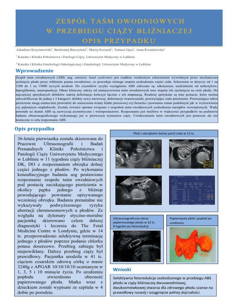 ZESPÓŁ TAŚM OWODNIOWYCH W PRZEBIEGU CIĄŻY BLIŹNIACZEJ OPIS PRZYPADKU Arkadiusz Krzyżanowski1, Bartłomiej Barczyński2, Maciej Kwiatek1, Tomasz Gęca1, Anna Kwaśniewska1 1 Katedra i Klinika Położnictwa i Patologii Ciąży, Uniwersytet Medyczny w Lublinie 2 Katedra i Klinika Ginekologii Onkologicznej i Ginekologii, Uniwersytet Medyczny w Lublinie Wprowadzenie Zespół taśm owodniowych (ABS, ang. amniotic band syndrome) jest rzadkim wrodzonym schorzeniem wywołanym przez mechaniczne uciśnięcie płodu przez włókniste pasma owodniowe, co powoduje różnego stopnia uszkodzenia części ciała. Schorzenie to dotyczy od 1 na 1200 do 1 na 15000 żywych urodzeń. Do czynników ryzyka wystąpienia ABS zaliczane są: nikotynizm, uzależnienie od narkotyków, hiperglikemia, amniopunkcja. Obraz kliniczny zależy od umiejscowienia taśm owodniowych oraz stopnia ich zaciśnięcia na ciele płodu. Do najczęściej spotykanych defektów należą deformacje kończyn łącznie z ich amputacją. Rzadziej spotykane są inne postacie, które można zakwalifikować do jednej z 3 kategorii: defekty cewy nerwowej, deformacje twarzoczaszki, przewężające ciało pierścienie. Przewężające tułów pierścienie mogą ostatecznie prowadzić do zniszczenia ściany klatki piersiowej czy brzucha i powstania zmian podobnych jak w wytrzewieniu czy pękniętym omphalocele. Zostały również opisane związane z zespołem taśm owodniowych uszkodzenia narządów wewnętrznych. Wady powstałe na skutek ABS są zazwyczaj asymetryczne i wielopostaciowe. Rozpoznanie jest możliwe w większości przypadków na podstawie badania ultrasonograficznego wykonanego już w pierwszym trymestrze ciąży. Uwidocznienie taśm owodniowych jest pomocne ale nie konieczne w celu rozpoznania ABS. Opis przypadku Płód z obrzękiem dolnej partii ciała w 12 tc. 36-letnia pierwiastka została skierowana do Pracowni Ultrasonografii i Badań Prenatalnych Kliniki Położnictwa i Patologii Ciąży Uniwersytetu Medycznego w Lublinie w 11 tygodniu ciąży bliźniaczej DK, DO z rozpoznaniem obrzęku dolnej części jednego z płodów. Po wykonaniu konsultacyjnego badania usg postawiono rozpoznanie zespołu taśm owodniowych pod postacią zaciskającego pierścienia w okolicy pępka jednego z bliźniąt powodującego powstanie opisywanego wcześniej obrzęku. Badania prenatalne nie wykazywały podwyższonego ryzyka aberracji chromosomowych u płodów. Ze względu na dylematy etyczno-moralne pacjentkę skierowano celem dalszej diagnostyki i leczenia do The Fetal Medicine Centre w Londynie, gdzie w 14 tc. przeprowadzono selektywną terminację jednego z płodów poprzez podanie chlorku potasu dosercowo. Przebieg zabiegu był niepowikłany. Dalszy przebieg ciąży był prawidłowy. Pacjentka urodziła w 41 tc. cięciem cesarskim zdrową córkę o masie 3240g z APGAR 10/10/10/10 ocenianym w 1, 3, 5 i 10 minucie życia. Po urodzeniu popłodu stwierdzono obecność papierowatego płodu. Matka wraz z dzieckiem zostali wypisani ze szpitala w 4 dobie po porodzie. Ultrasonograficzny obraz papierowatego płodu w 22 tc. 8 tygodni po fetoredukcji Papierowaty płód i popłód po urodzeniu Wnioski Selektywna fetoredukcja uszkodzonego w przebiegu ABS płodu w ciąży bliźniaczej dwuowodniowej, dwukosmówkowej stwarza dla zdrowego płodu szanse na prawidłowy rozwój i osiągnięcie pełnej dojrzałości.