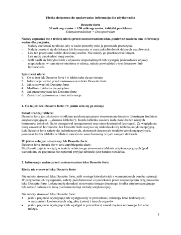 Ulotka dołączona do opakowania: informacja dla użytkownika Dessette forte 30 mikrogramów + 150 mikrogramów, tabletki powlekane Ethinylestradiolum + Desogestrelum Należy zapoznać się z treścią ulotki przed zastosowaniem leku, ponieważ zawiera ona informacje ważne dla pacjenta. Należy zachować tę ulotkę, aby w razie potrzeby móc ją ponownie przeczytać. Należy zwrócić się do lekarza lub farmaceuty w razie jakichkolwiek dalszych wątpliwości. Lek ten przepisano ściśle określonej osobie. Nie należy go przekazywać innym. Lek może zaszkodzić innej osobie. - Jeśli nasili się którykolwiek z objawów niepożądanych lub wystąpią jakiekolwiek objawy niepożądane, w tym niewymienione w ulotce, należy powiedzieć o tym lekarzowi lub farmaceucie. Spis treści ulotki 1. Co to jest lek Dessette forte i w jakim celu się go stosuje 2. Informacje ważne przed zastosowaniem leku Dessette forte 3. Jak stosować lek Dessette forte 4. Możliwe działania niepożądane 5. Jak przechowywać lek Dessette forte 6. Zawartość opakowania i inne informacje 1. Co to jest lek Dessette forte i w jakim celu się go stosuje Skład i rodzaj tabletki Dessette forte jest złożonym środkiem antykoncepcyjnym stosowanym doustnie (doustnym środkiem antykoncepcyjnym – „złożona tabletka”). Każda tabletka zawiera małą ilość dwóch różnych hormonów żeńskich. Są to dezogestrel (progesteron) oraz etynyloestradiol (estrogen). Ze względu na małą zawartość hormonów, lek Dessette forte nazywa się niskodawkową tabletką antykoncepcyjną. Lek Dessette forte należy do jednofazowych, złożonych doustnych środków antykoncepcyjnych, ponieważ każda tabletka w blistrze zawiera te same hormony w tych samych dawkach. W jakim celu jest stosowany lek Dessette forte Dessette forte stosuje się w celu zapobiegania ciąży. Możliwość zajścia w ciążę w trakcie właściwego stosowania tabletek antykoncepcyjnych (pod warunkiem, że pacjentka nie zapomni przyjąć tabletek) jest bardzo niewielka. 2. Informacje ważne przed zastosowaniem leku Dessette forte Kiedy nie stosować leku Dessette forte Nie należy stosować leku Dessette forte, jeśli wystąpi którakolwiek z wymienionych poniżej sytuacji. W przypadku ich wystąpienia, należy poinformować o tym lekarza przed rozpoczęciem przyjmowania leku Dessette forte. Lekarz może doradzić stosowanie innego doustnego środka antykoncepcyjnego lub zalecić całkowicie inną (niehormonalną) metodę antykoncepcji. Nie należy stosować leku Dessette forte: jeśli u pacjentki występują (lub występowały w przeszłości) zakrzepy krwi (zakrzepica) w naczyniach krwionośnych nóg, płuc (zator) i innych organów. jeśli u pacjentki występuje (lub wystąpił w przeszłości) zawał mięśnia sercowego lub udar mózgu. 1 jeśli u pacjentki występują (lub występowały w przeszłości) objawy mogące być pierwszymi oznakami zawału mięśnia sercowego (takie jak dusznica bolesna lub ból w klatce piersiowej) lub udaru mózgu (np. przejściowy atak niedokrwienny lub łagodny udar bez trwałych uszkodzeń). jeśli u pacjentki występuje zaburzenie wpływające na krzepnięcie krwi (takie jak niedobór białka C). jeśli u pacjentki występuje (lub występowała w przeszłości) migrena z towarzyszącymi np. zaburzeniami widzenia, zaburzeniami lub osłabieniem zdolności mówienia, uczuciem wyobcowania lub drętwieniem części ciała. jeśli u pacjentki występuje cukrzyca ze zmianami naczyniowymi. jeśli u pacjentki występuje poważny czynnik ryzyka lub klika czynników ryzyka rozwoju zakrzepicy (patrz również punkt „Lek Dessette forte a zakrzepica”). jeśli pacjentka ma depresję. jeśli u pacjentki występuje (lub występowało w przeszłości) zapalenie trzustki związane z dużym stężeniem tłuszczów we krwi. jeśli u pacjentki występuje żółtaczka (zażółcenie skóry) lub ciężka choroba wątroby i czynność wątroby nie powróciła do normy. jeśli u pacjentki występuje (lub występował w przeszłości) nowotwór, którego rozrost zależy od hormonów płciowych (np. rak piersi lub rak narządów rodnych). jeśli u pacjentki występuje (lub występował w przeszłości) nowotwór wątroby. jeśli u pacjentki wystąpiło krwawienie z pochwy o nieznanej przyczynie. jeśli u pacjentki występuje nieprawidłowy rozrost błony śluzowej macicy (rozrost endometrium). jeśli pacjentka ma uczulenie na etynyloestradiol, dezogestrel lub którykolwiek z pozostałych składników tego leku (wymienione w punkcie 6). Jeżeli którykolwiek z podanych powyżej stanów wystąpi po raz pierwszy w okresie stosowania doustnego środka antykoncepcyjnego, należy lek natychmiast odstawić i skonsultować się z lekarzem. Do czasu wyjaśnienia należy stosować niehormonalną metodę antykoncepcji (patrz również „Uwagi ogólne”). Ostrzeżenia i środki ostrożności Uwagi ogólne W ulotce opisano różne sytuacje, w których należy przerwać przyjmowanie leku, lub w których skuteczność leku może być zmniejszona. W sytuacjach tych należy powstrzymać się od stosunków płciowych lub zastosować dodatkowo niehormonalne metody antykoncepcji, np. prezerwatywę lub inną metodę barierową. Nie należy stosować metody kalendarzykowej lub polegającej na mierzeniu temperatury. Metody te mogą być nieskuteczne, ponieważ stosowanie doustnego środka antykoncepcyjnego wpływa na zmiany temperatury ciała i śluzu szyjkowego, które występują w czasie cyklu miesiączkowego. Lek Dessette forte, jak inne hormonalne środki antykoncepcyjne, nie zapobiega zakażeniu wirusem HIV (AIDS) ani innym chorobom przenoszonym drogą płciową. Lek Dessette forte jest przepisywany przez lekarza indywidualnie dla każdej pacjentki. Nie należy przekazywać leku innym osobom. Leku Dessette forte nie należy stosować w celu opóźnienia terminu rozpoczęcia krwawienia. W wyjątkowych sytuacjach, kiedy zachodzi potrzeba opóźnienia 