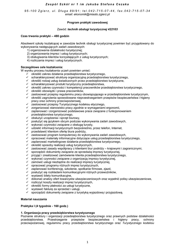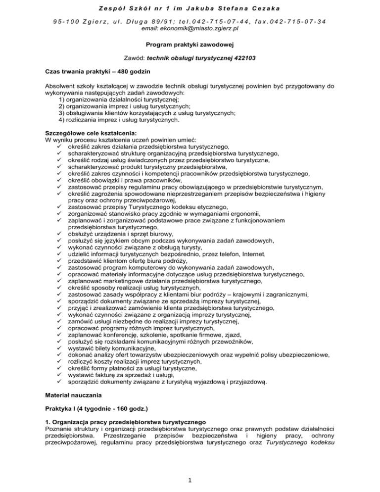 Zespół Szkół nr 1 im Jakuba Stefana Cezaka 95-100 Zgierz, ul. Długa 89/91; tel.042 -715-07-44, fax.042-715-07-34 email: [email protected] Program praktyki zawodowej Zawód: technik obsługi turystycznej 422103 Czas trwania praktyki – 480 godzin Absolwent szkoły kształcącej w zawodzie technik obsługi turystycznej powinien być przygotowany do wykonywania następujących zadań zawodowych: 1) organizowania działalności turystycznej; 2) organizowania imprez i usług turystycznych; 3) obsługiwania klientów korzystających z usług turystycznych; 4) rozliczania imprez i usług turystycznych. Szczegółowe cele kształcenia: W wyniku procesu kształcenia uczeń powinien umieć: określić zakres działania przedsiębiorstwa turystycznego, scharakteryzować strukturę organizacyjną przedsiębiorstwa turystycznego, określić rodzaj usług świadczonych przez przedsiębiorstwo turystyczne, scharakteryzować produkt turystyczny przedsiębiorstwa, określić zakres czynności i kompetencji pracowników przedsiębiorstwa turystycznego, określić obowiązki i prawa pracowników, zastosować przepisy regulaminu pracy obowiązującego w przedsiębiorstwie turystycznym, określić zagrożenia spowodowane nieprzestrzeganiem przepisów bezpieczeństwa i higieny pracy oraz ochrony przeciwpożarowej, zastosować przepisy Turystycznego kodeksu etycznego, zorganizować stanowisko pracy zgodnie w wymaganiami ergonomii, zaplanować i zorganizować podstawowe prace związane z funkcjonowaniem przedsiębiorstwa turystycznego, obsłużyć urządzenia i sprzęt biurowy, posłużyć się językiem obcym podczas wykonywania zadań zawodowych, wykonać czynności związane z obsługą turysty, udzielić informacji turystycznych bezpośrednio, przez telefon, Internet, przedstawić klientom ofertę biura podróży, zastosować program komputerowy do wykonywania zadań zawodowych, opracować materiały informacyjne dotyczące usług przedsiębiorstwa turystycznego, zaplanować marketingowe działania przedsiębiorstwa turystycznego, określić sposoby realizacji usług turystycznych, zastosować zasady współpracy z klientami biur podróży – krajowymi i zagranicznymi, sporządzić dokumenty związane ze sprzedażą imprezy turystycznej, przyjąć i zrealizować zamówienie klienta przedsiębiorstwa turystycznego, wykonać czynności związane z organizacją imprezy turystycznej, zamówić usługi niezbędne do realizacji imprezy turystycznej, opracować programy różnych imprez turystycznych, zaplanować konferencję, szkolenie, spotkanie firmowe, zjazd, posłużyć się rozkładami komunikacyjnymi różnych przewoźników, wystawić bilety komunikacyjne, dokonać analizy ofert towarzystw ubezpieczeniowych oraz wypełnić polisy ubezpieczeniowe, rozliczyć koszty realizacji imprez turystycznych, określić formy płatności za usługi turystyczne, wystawić fakturę za sprzedaż i usługi, sporządzić dokumenty związane z turystyką wyjazdową i przyjazdową. Materiał nauczania Praktyka I (4 tygodnie - 160 godz.) 1. Organizacja pracy przedsiębiorstwa turystycznego Poznanie struktury i organizacji przedsiębiorstwa turystycznego oraz prawnych podstaw działalności przedsiębiorstwa. Przestrzeganie przepisów bezpieczeństwa i higieny pracy, ochrony przeciwpożarowej, regulaminu pracy przedsiębiorstwa turystycznego oraz Turystycznego kodeksu 1 Zespół Szkół nr 1 im Jakuba Stefana Cezaka 95-100 Zgierz, ul. Długa 89/91; tel.042 -715-07-44, fax.042-715-07-34 email: [email protected] etycznego. Określanie rodzaju usług świadczonych przez przedsiębiorstwo turystyczne. Określanie zakresu czynności i kompetencji pracowników przedsiębiorstwa turystycznego oraz ich obowiązków i praw. Organizowanie stanowiska pracy. Stosowanie zasad współpracy w zespole. Obsługiwanie urządzeń i sprzętu znajdującego się w przedsiębiorstwie turystycznym. Analizowanie zakresu i charakteru działalności przedsiębiorstwa. Określanie obiegu dokumentów w przedsiębiorstwie. Określanie produktów turystycznych przedsiębiorstwa. Analizowanie działalności marketingowej. Gromadzenie informacji turystycznych. Analizowanie materiałów informacyjnych dotyczących usług przedsiębiorstwa turystycznego. Stosowanie zasad współpracy z kontrahentami. Zawieranie umów z klientami biur podróży. Oferowanie klientom usług turystycznych. Tworzenie wizerunku przedsiębiorstwa Praktyka II (2 tygodnie - 80 godzin) 2. Programowanie, kalkulacja kosztów, sprzedaż oraz realizacja imprez i usług turystycznych Przyjmowanie zamówień od klientów indywidualnych i grupowych. Programowanie imprez turystycznych z uwzględnieniem potrzeb, zainteresowań, wieku, rodzaju grup klientów. Planowanie imprez własnych oraz imprez zleconych w biurze podróży .Sporządzanie ofert dla zagranicznego biura podróży. Zamawianie usług niezbędnych do realizacji imprezy turystycznej. Współpraca z kontrahentami krajowymi i zagranicznymi. Kalkulowanie kosztów imprez turystycznych. Dokumentowanie imprezy (teczka imprezy). Przyjmowanie należności za usługi turystyczne z zastosowaniem różnych form płatności. Sporządzanie dokumentów potwierdzających płatność za usługi. Stosowanie zasad rozliczania kosztów realizacji imprezy turystycznej. Stosowanie zasad sporządzania umów w turystyce. Sporządzanie umów dotyczących sprzedaży usług i imprez turystycznych. Komunikowanie się w języku obcym z klientami i kontrahentami przedsiębiorstwa turystycznego. Rezerwowanie usług turystycznych on-line. Obsługiwanie konferencji, kongresów, targów i giełd turystycznych. Stosowanie metod przewodnictwa i pilotażu wycieczek. Praktyka II (2 tygodnie - 80 godzin) 3. Obiekty noclegowe Poznanie struktury, organizacji oraz prawnych podstaw działalności hotelu. Przestrzeganie przepisów bezpieczeństwa i higieny pracy, ochrony przeciwpożarowej oraz regulaminu pracy. Zapoznanie się ze stanowiskami pracy w hotelu zakresem czy
