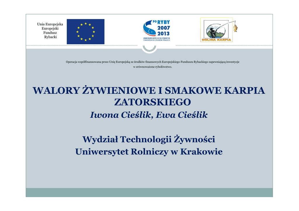 Unia Europejska Europejski Fundusz Rybacki Operacja współfinansowana przez Unię Europejską ze środków finansowych Europejskiego Funduszu Rybackiego zapewniającą inwestycje w zrównoważone rybołówstwo. WALORY ŻYWIENIOWE I SMAKOWE KARPIA ZATORSKIEGO Iwona Cieślik, Ewa Cieślik Wydział Technologii Żywności Uniwersytet Rolniczy w Krakowie Unia Europejska Europejski Fundusz Rybacki Operacja współfinansowana przez Unię Europejską ze środków finansowych Europejskiego Funduszu Rybackiego zapewniającą inwestycje w zrównoważone rybołówstwo. Karp (Cyprinus carpio L.) obok szczupaka, sandacza, płoci, lina i pstrąga należy do najpowszechniej dostępnych ryb słodkowodnych w Polsce. Unia Europejska Europejski Fundusz Rybacki Operacja współfinansowana przez Unię Europejską ze środków finansowych Europejskiego Funduszu Rybackiego zapewniającą inwestycje w zrównoważone rybołówstwo. Wartość odżywcza ryb Wartość odżywcza ryb zależy od gatunku, dojrzałości płciowej, okresu rozmnażania i rodzaju pożywienia występującego w zbiornikach wodnych. Wartość energetyczna ryb chudych jest niska i wynosi od 60 do 115 kcal/100 g, wyraźnie wyższa jest natomiast w przypadku ryb tłustych oraz wędzonych, solonych i marynowanych, a także przetworów rybnych w zalewach olejowych (do 400 kcal/100 g). Unia Europejska Europejski Fundusz Rybacki Operacja współfinansowana przez Unię Europejską ze środków finansowych Europejskiego Funduszu Rybackiego zapewniającą inwestycje w zrównoważone rybołówstwo. Wartość energetyczna mięsa ryb determinowana jest wzajemnym stosunkiem tłuszczu do wody. Niektóre ryby zawierają bardzo mało tłuszczu i ich wartość energetyczna odpowiada chudej cielęcinie. Ze względu na udział tłuszczu produkty tej grupy można podzielić na: ryby chude, np. flądra, dorsz i większość ryb słodkowodnych (np. karp), w których zawartość tłuszczu nie przekracza 5%. Unia Europejska Europejski Fundusz Rybacki Operacja współfinansowana przez Unię Europejską ze środków finansowych Europejskiego Funduszu Rybackiego zapewniającą inwestycje w zrównoważone rybołówstwo. Tabela 1. Skład chemiczny i wartość odżywcza ryb w 100 g części jadalnych (wg IŻŻ, Warszawa 2005) Składnik Dorsz świeży Karp świeży Szczupak Łosoś świeży Śledź świeży Węgorz Energia (kcal) 78,0 110 82,0 201 161 278 Woda (g) 80,4 . 76,6 79,8 65,5 70,9 59,6 Białko (g) 17,7 18,0 18,4 19,9 16,3 15,0 Tłuszcz (g) 0,7 4,2 0,8 13,6 10,7 24,5 Węglowodany (g) 0,0 0,0 0,0 0,0 0,0 0,0 Kwasy tłuszczowe nienasycone (g) 0,10 0,67 0,09 2,94 2,15 5,65 Kwasy tłuszczowe jednonienasycone (g) 0,11 1,49 0,18 5,52 5,37 11,53 Unia Europejska Europejski Fundusz Rybacki Składnik Kwasy tłuszczowe wielonienasycone (g) Równoważnik retinolu (µg) Równoważnik αtokoferolu (mg) Tiamina (mg) Dorsz świeży Karp świeży Szczupak Łosoś świeży Śledź świeży Węgorz 0,22 0,70 0,37 4,79 1,87 3,21 7,0 44,0 14,0 41,0 25,0 980 0,44 0,63 0,79 2,23 1,07 4,14 0,055 0;06S 0,085 0,23 0,02 0,18 0,046 0,050 0,070 0,17 0,13 0,32 Potas (mg) 356 387 304 371 239 217 Wapń (mg) 9,0 10,0 20,0 13,0 32,0 17,0 Fosfor (mg) 184 215 215 266 219 223 Magnez (mg) 25,0 12,0 27,0 29,0 24,0 21,0 Żelazo (mg) 0,4 0,7 0,6 1,0 0,9 0,6 Ryboflawina (mg) Unia Europejska Europejski Fundusz Rybacki Operacja współfinansowana przez Unię Europejską ze środków finansowych Europejskiego Funduszu Rybackiego zapewniającą inwestycje w zrównoważone rybołówstwo. Ryby i przetwory rybne są także źródłem dobrze przyswajalnego białka, którego zawartość w rybach kształtuje się na poziomie 16-20%. W skład białek mięsa ryb wchodzą zarówno albuminy, jak i globuliny, a w tkankach łącznych obecny jest kolagen, warunkujący galaretowanie wyciągów wodnych. Skład aminokwasowy tych białek jest zbliżony do składu białek mięsa. Unia Europejska Europejski Fundusz Rybacki Operacja współfinansowana przez Unię Europejską ze środków finansowych Europejskiego Funduszu Rybackiego zapewniającą inwestycje w zrównoważone rybołówstwo. Mięso ryb charakteryzuje wysoką zawartością składników mineralnych. W stosunkowo dużych ilościach występuje wapń, fosfor, sód i potas, a w mniejszych ilościach fluor, jod i miedź. Z witamin rozpuszczalnych w tłuszczach na uwagę zasługuje obecność witamin D i A. W tkankach ryb występują również niektóre witaminy z grupy B. Unia Europejska Europejski Fundusz Rybacki Operacja współfinansowana przez Unię Europejską ze środków finansowych Europejskiego Funduszu Rybackiego zapewniającą inwestycje w zrównoważone rybołówstwo. Ryby - definicja uwzględnia ryby żywe, śnięte, zabite, wykrwawione i wypatroszone, a także chłodzone i mrożone. Unia Europejska Europejski Fundusz Rybacki Operacja współfinansowana przez Unię Europejską ze środków finansowych Europejskiego Funduszu Rybackiego zapewniającą inwestycje w zrównoważone rybołówstwo. Ryby mogą być przechowywane w chłodziarce (+4°C) nie dłużej niż jeden dzień, a w zamrażarce (< — 18°C) przez kilka miesięcy. Ryby najlepiej rozmrażać szybko pod bieżącą wodą. Ryby solone i wędzone można przechowywać w chłodziarce przez kilka dni (chroniąc inne artykuły przed ich zapachem), natomiast przetwory rybne przez okres uwidoczniony na opakowaniu. Unia Europejska Europejski Fundusz Rybacki Operacja współfinansowana przez Unię Europejską ze środków finansowych Europejskiego Funduszu Rybackiego zapewniającą inwestycje w zrównoważone rybołówstwo. W obrocie spotykamy niezliczone ilości przeróżnych przetworów, do których zalicza się ryby solone i wędzone, a także marynaty, konserwy rybne. Nadzór sanitarno-higieniczny, obejmuje transport, magazynowanie, procesy technologiczne związane z przetwórstwem, przetwórnie i miejsca sprzedaży (obrót). Unia Europejska Europejski Fundusz Rybacki Operacja współfinansowana przez Uni