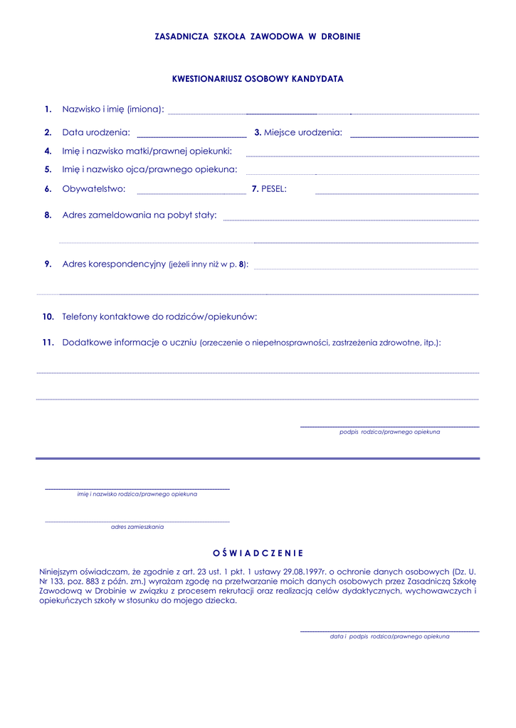 ZASADNICZA SZKOŁA ZAWODOWA W DROBINIE KWESTIONARIUSZ OSOBOWY KANDYDATA 1. Nazwisko i imię (imiona): 2. Data urodzenia: 4. Imię i nazwisko matki/prawnej opiekunki: 5. Imię i nazwisko ojca/prawnego opiekuna: 6. Obywatelstwo: 8. Adres zameldowania na pobyt stały: 9. Adres korespondencyjny (jeżeli inny niż w p. 8): 3. Miejsce urodzenia: 7. PESEL: 10. Telefony kontaktowe do rodziców/opiekunów: 11. Dodatkowe informacje o uczniu (orzeczenie o niepełnosprawności, zastrzeżenia zdrowotne, itp.): podpis rodzica/prawnego opiekuna imię i nazwisko rodzica/prawnego opiekuna adres zamieszkania OŚWIADCZENIE Niniejszym oświadczam, że zgodnie z art. 23 ust. 1 pkt. 1 ustawy 29.08.1997r. o ochronie danych osobowych (Dz. U. Nr 133, poz. 883 z późn. zm.) wyrażam zgodę na przetwarzanie moich danych osobowych przez Zasadniczą Szkołę Zawodową w Drobinie w związku z procesem rekrutacji oraz realizacją celów dydaktycznych, wychowawczych i opiekuńczych szkoły w stosunku do mojego dziecka. data i podpis rodzica/prawnego opiekuna