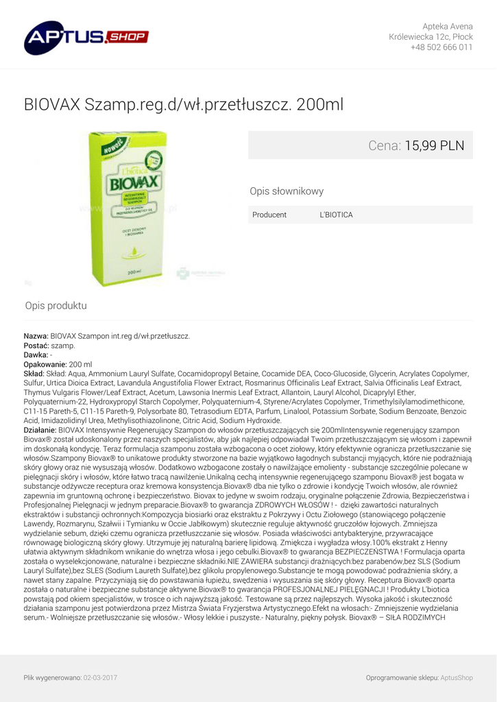 Apteka Avena Królewiecka 12c, Płock +48 502 666 011 BIOVAX Szamp.reg.d/wł.przetłuszcz. 200ml Cena: 15,99 PLN Opis słownikowy Producent L'BIOTICA Opis produktu Nazwa: BIOVAX Szampon int.reg d/wł.przetłuszcz. Postać: szamp. Dawka: Opakowanie: 200 ml Skład: Skład: Aqua, Ammonium Lauryl Sulfate, Cocamidopropyl Betaine, Cocamide DEA, Coco-Glucoside, Glycerin, Acrylates Copolymer, Sulfur, Urtica Dioica Extract, Lavandula Angustifolia Flower Extract, Rosmarinus Officinalis Leaf Extract, Salvia Officinalis Leaf Extract, Thymus Vulgaris Flower/Leaf Extract, Acetum, Lawsonia Inermis Leaf Extract, Allantoin, Lauryl Alcohol, Dicaprylyl Ether, Polyquaternium-22, Hydroxypropyl Starch Copolymer, Polyquaternium-4, Styrene/Acrylates Copolymer, Trimethylsilylamodimethicone, C11-15 Pareth-5, C11-15 Pareth-9, Polysorbate 80, Tetrasodium EDTA, Parfum, Linalool, Potassium Sorbate, Sodium Benzoate, Benzoic Acid, Imidazolidinyl Urea, Methylisothiazolinone, Citric Acid, Sodium Hydroxide. Działanie: BIOVAX Intensywnie Regenerujący Szampon do włosów przetłuszczających się 200mlIntensywnie regenerujący szampon Biovax® został udoskonalony przez naszych specjalistów, aby jak najlepiej odpowiadał Twoim przetłuszczającym się włosom i zapewnił im doskonałą kondycję. Teraz formulacja szamponu została wzbogacona o ocet ziołowy, który efektywnie ogranicza przetłuszczanie się włosów.Szampony Biovax® to unikatowe produkty stworzone na bazie wyjątkowo łagodnych substancji myjących, które nie podrażniają skóry głowy oraz nie wysuszają włosów. Dodatkowo wzbogacone zostały o nawilżające emolienty - substancje szczególnie polecane w pielęgnacji skóry i włosów, które łatwo tracą nawilżenie.Unikalną cechą intensywnie regenerującego szamponu Biovax® jest bogata w substancje odżywcze receptura oraz kremowa konsystencja.Biovax® dba nie tylko o zdrowie i kondycję Twoich włosów, ale również zapewnia im gruntowną ochronę i bezpieczeństwo. Biovax to jedyne w swoim rodzaju, oryginalne połączenie Zdrowia, Bezpieczeństwa i Profesjonalnej Pielęgnacji w jednym preparacie.Biovax® to gwarancja ZDROWYCH WŁOSÓW ! - dzięki zawartości naturalnych ekstraktów i substancji ochronnych:Kompozycja biosiarki oraz ekstraktu z Pokrzywy i Octu Ziołowego (stanowiącego połączenie Lawendy, Rozmarynu, Szałwii i Tymianku w Occie Jabłkowym) skutecznie reguluje aktywność gruczołów łojowych. Zmniejsza wydzielanie sebum, dzięki czemu ogranicza przetłuszczanie się włosów. Posiada właściwości antybakteryjne, przywracające równowagę biologiczną skóry głowy. Utrzymuje jej naturalną barierę lipidową. Zmiękcza i wygładza włosy.100% ekstrakt z Henny ułatwia aktywnym składnikom wnikanie do wnętrza włosa i jego cebulki.Biovax® to gwarancja BEZPIECZEŃSTWA ! Formulacja oparta została o wyselekcjonowane, naturalne i bezpieczne składniki.NIE ZAWIERA substancji drażniących:bez parabenów,bez SLS (Sodium Lauryl Sulfate),bez SLES (Sodium Laureth Sulfate),bez glikolu propylenowego.Substancje te mogą powodować podrażnienia skóry, a nawet stany zapalne. Przyczyniają się do powstawania łupieżu, swędzenia i wysuszania się skóry głowy. Receptura Biovax® oparta została o naturalne i bezpieczne substancje aktywne.Biovax® to gwarancja PROFESJONALNEJ PIELĘGNACJI ! Produkty L'biotica powstają pod okiem specjalistów, w trosce o ich najwyższą jakość. Testowane są przez najlepszych. Wysoka jakość i skuteczność działania szamponu jest potwierdzona przez Mistrza Świata Fryzjerstwa Artystycznego.Efekt na włosach:- Zmniejszenie wydzielania serum.- Wolniejsze przetłuszczanie się włosów.- Włosy lekkie i puszyste.- Naturalny, piękny połysk. Biovax® – SIŁA RODZIMYCH Plik wygenerowano: 02-03-2017 Oprogramowanie sklepu: AptusShop Apteka Avena Królewiecka 12c, Płock +48 502 666 011 KOSMETYKÓW !ZNAKOMITĄ JAKOŚĆ GWARANTUJE POLSKI PRODUCENT.PRODUKT PRZYJAZNY ALERGIKOM. Wskazania: Sposób użycia: Niewielką ilość szamponu nanieść na mokre włosy i skórę głowy, masować aż do uzyskania piany. Następnie dokładnie spłukać. W przypadku kontaktu z oczami przemyć je dużą ilością wody.Rada profesjonalisty:Myj włosy tak często, jak tego wymagają. Nadmiar sebum dodatkowo podrażnia skórę głowy i osłabia włosy.Spłukuj włosy chłodną wodą, która wspomaga odpowiednią pracę gruczołów łojowych.Grzebień i szczotkę myj po każdym użyciu – w ten sposób unikniesz dalszego rozprowadzania tłuszczu po włosach. Uwagi: Laboratorium L'biotica w oparciu o najnowszą wiedzę kosmetologiczną i biotechnologiczną ulepszyło receptury swoich kosmetyków, pozbywając się z preparatów drażniących skórę substancji. Oryginalna receptura serii BIOVAX to gwarancja BEZPIECZEŃSTWA! - nie zawiera substancji drażniących: bez PARABENÓW, bez SLS (SODIUM LAURETH SULFATE), bez GLICOLU PROPYLENOWEGO Produkty L'Biotica powstają pod okiem specjalistów, w trosce o ich najwyższą jakość. Testowane są przez najlepszych. Wszystkie produkty z serii BIOVAX dostały pozytywną opinię Mistrza Świata Fryzjerstwa Artystycznego. Plik wygenerowano: 02-03-2017 Powered by TCPDF (www.tcpdf.org) Oprogramowanie sklepu: AptusShop