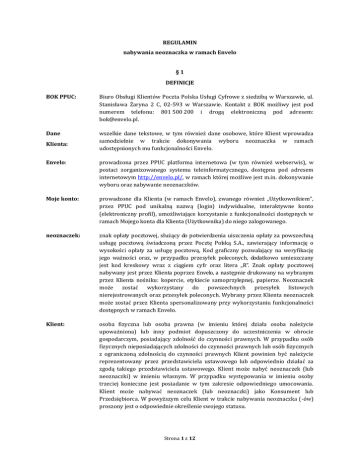 REGULAMIN nabywania neoznaczka w ramach Envelo §1 DEFINICJE BOK PPUC: Biuro Obsługi Klientów Poczta Polska Usługi Cyfrowe z siedzibą w Warszawie, ul. Stanisława Żaryna 2 C, 02-593 w Warszawie. Kontakt z BOK możliwy jest pod numerem telefonu: 801 500 200 i drogą elektroniczną pod adresem: [email protected]. Dane wszelkie dane tekstowe, w tym również dane osobowe, które Klient wprowadza samodzielnie w trakcie dokonywania wyboru neoznaczka w ramach udostępnionych mu funkcjonalności Envelo. Klienta: Envelo: prowadzona przez PPUC platforma internetowa (w tym również webserwis), w postaci zorganizowanego systemu teleinformatycznego, dostępna pod adresem internetowym http://envelo.pl/, w ramach której możliwe jest m.in. dokonywanie wyboru oraz nabywanie neoznaczków. Moje konto: prowadzone dla Klienta (w ramach Envelo), zwanego również „Użytkownikiem”, przez PPUC pod unikalną nazwą (login) indywidualne, interaktywne konto (elektroniczny profil), umożliwiające korzystanie z funkcjonalności dostępnych w ramach Mojego konta dla Klienta (Użytkownika) do niego zalogowanego. neoznaczek: znak opłaty pocztowej, służący do potwierdzenia uiszczenia opłaty za powszechną usługę pocztową świadczoną przez Pocztę Polską S.A., zawierający informację o wysokości opłaty za usługę pocztową, Kod graficzny pozwalający na weryfikację jego ważności oraz, w przypadku przesyłek poleconych, dodatkowo umieszczany jest kod kreskowy wraz z ciągiem cyfr oraz litera „R”. Znak opłaty pocztowej nabywany jest przez Klienta poprzez Envelo, a następnie drukowany na wybranym przez Klienta nośniku: kopercie, etykiecie samoprzylepnej, papierze. Neoznaczek może zostać wykorzystany do powszechnych przesyłek listowych nierejestrowanych oraz przesyłek poleconych. Wybrany przez Klienta neoznaczek może zostać przez Klienta spersonalizowany przy wykorzystaniu funkcjonalności dostępnych w ramach Envelo. Klient: osoba fizyczna lub osoba prawna (w imieniu której działa osoba należycie upoważniona) lub inny podmiot dopuszczony do uczestniczenia w obrocie gospodarczym, posiadający zdolność do czynności prawnych. W przypadku osób fizycznych nieposiadających zdolności do czynności prawnych lub osób fizycznych z ograniczoną zdolnością do czynności prawnych Klient powinien być należycie reprezentowany przez przedstawiciela ustawowego lub odpowiednio działać za zgodą takiego przedstawiciela ustawowego. Klient może nabyć neoznaczek (lub neoznaczki) w imieniu własnym. W przypadku występowania w imieniu osoby trzeciej konieczne jest posiadanie w tym zakresie odpowiedniego umocowania. Klient może nabywać neoznaczek (lub neoznaczki) jako Konsument lub Przedsiębiorca. W powyższym celu Klient w trakcie nabywania neoznaczka (-ów) proszony jest o odpowiednie określenie swojego statusu. Strona 1 z 12 Kod graficzny: kod graficzny („data matrix”) zdefiniowany zgodnie z warunkami kodowania przewidzianymi dla cyfrowego znaku opłaty pocztowej, zaszyfrowany i podpisany elektronicznie, identyfikujący neoznaczek poprzez zapisanie w nim podstawowych informacji obejmujących co najmniej: numer identyfikacyjny, nominał oraz datę jego ważności. Kod graficzny jest podstawowym elementem identyfikującym ważność danego neoznaczka. Kod kreskowy: Kod kreskowy wraz z ciągiem cyfr oraz umieszczoną literą „R” jest zdefiniowany zgodnie z warunkami kodowania przewidzianymi dla numeru nadania przesyłki poleconej. Kod kreskowy umożliwia identyfikację przesyłki poleconej przez skanery elektroniczne. Konsument: Klient będący konsumentem w rozumieniu art. 22 (1) Kodeksu cywilnego. Opłata: wartość nominalna wyrażona w sposób jawny na neoznaczku odpowiadająca cenie powszechnej usługi pocztowej świadczonej przez Pocztę Polską S.A. Operator Płatności Elektronicznych: podmiot dokonujący autoryzacji, czyli potwierdzenia, że osoba posługująca się daną kartą płatniczą lub kontem bankowym jest uprawniona do dokonania płatności (np. posiada wystarczające środki na koncie), a także rozliczania i przetwarzania transakcji, którym jest firma eCard S.A. z siedzibą w Gdańsku 80-387, przy ul. Arkońskiej 11, wpisana do rejestru przedsiębiorców prowadzonego przez Sąd Rejonowy Gdańsk-Północ w Gdańsku VII Wydział Gospodarczy KRS pod numerem 0000042304, kapitał zakładowy 16 840 000 zł (w całości wpłacony), NIP: 5213103040. PPUC: Poczta Polska Usługi Cyfrowe Sp. z o.o. z siedzibą w Warszawie, ul. Stanisława Żaryna 2 C, 02-593 Warszawa, wpisaną do Rejestru Przedsiębiorców prowadzonego przez Sąd Rejonowy dla m. st. Warszawy w Warszawie, XIII Wydział Gospodarczy Krajowego Rejestru Sądowego, pod numerem KRS: 0000425263, kapitał zakładowy 11 000 000,00 zł, NIP: 525-25-33-454. Poczta Poczta Polska Spółka Akcyjna z siedzibą w Warszawie (adres: ul. Stawki 2, 00-940 Warszawa) wpisana do Rejestru Przedsiębiorców prowadzonego przez Sąd Rejonowy dla m.st. Warszawy w Warszawie, XII Wydział Gospodarczy Krajowego Rejestru Sądowego, pod numerem KRS 0000334972, kapitał zakładowy 774 140 000 zł. (w całości wpłacony), NIP: 525-000-73-13 – przedsiębiorca uprawniony do wykonywania działalności pocztowej na podstawie wpisu do rejestru operatorów pocztowych, zgodnie z Ustawą z dnia 23 listopada 2012 r. Prawo pocztowe (Dz.U. z 2012 r. poz. 1529). Polska S.A.: Przedsiębiorca: Klient posiadający status przedsiębiorcy w rozumieniu właściwych przepisów obowiązującego prawa. Potwierdzenie nadania: Druk, na którym następuje potwierdzenie nadania przesyłki poleconej z neoznaczkiem, zawierający informacje tj. dane nadawcy, dane adresata oraz parametry przesyłki i kod kreskowy stanowiący numer nadania przesyłki poleconej. Oznaczenie Potwierdzenia nadania przesyłki poleconej jako nadanej następuje w placówce pocztowej Poczty Polskiej S.A. przyjmującej przesyłkę poleconą z neoznaczkiem do obrotu pocztowego. Regula