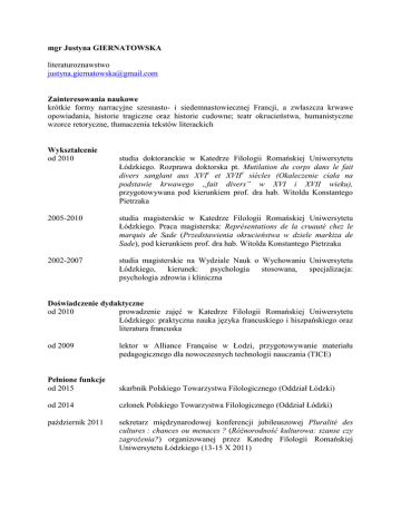 mgr Justyna GIERNATOWSKA literaturoznawstwo [email protected] Zainteresowania naukowe krótkie formy narracyjne szesnasto- i siedemnastowiecznej Francji, a zwłaszcza krwawe opowiadania, historie tragiczne oraz historie cudowne; teatr okrucieństwa, humanistyczne wzorce retoryczne, tłumaczenia tekstów literackich Wykształcenie od 2010 studia doktoranckie w Katedrze Filologii Romańskiej Uniwersytetu Łódzkiego. Rozprawa doktorska pt. Mutilation du corps dans le fait divers sanglant aux XVIe et XVIIe siècles (Okaleczenie ciała na podstawie krwawego „fait divers” w XVI i XVII wieku), przygotowywana pod kierunkiem prof. dra hab. Witolda Konstantego Pietrzaka 2005-2010 studia magisterskie w Katedrze Filologii Romańskiej Uniwersytetu Łódzkiego. Praca magisterska: Représentations de la cruauté chez le marquis de Sade (Przedstawienia okrucieństwa w dziele markiza de Sade), pod kierunkiem prof. dra hab. Witolda Konstantego Pietrzaka 2002-2007 studia magisterskie na Wydziale Nauk o Wychowaniu Uniwersytetu Łódzkiego, kierunek: psychologia stosowana, specjalizacja: psychologia zdrowia i kliniczna Doświadczenie dydaktyczne od 2010 prowadzenie zajęć w Katedrze Filologii Romańskiej Uniwersytetu Łódzkiego: praktyczna nauka języka francuskiego i hiszpańskiego oraz literatura francuska od 2009 lektor w Alliance Française w Łodzi, przygotowywanie materiału pedagogicznego dla nowoczesnych technologii nauczania (TICE) Pełnione funkcje od 2015 skarbnik Polskiego Towarzystwa Filologicznego (Oddział Łódzki) od 2014 członek Polskiego Towarzystwa Filologicznego (Oddział Łódzki) październik 2011 sekretarz międzynarodowej konferencji jubileuszowej Pluralité des cultures : chances ou menaces ? (Różnorodność kulturowa: szanse czy zagrożenia?) organizowanej przez Katedrę Filologii Romańskiej Uniwersytetu Łódzkiego (13-15 X 2011) od 2011 członek komisji egzaminacyjnej języka francuskiego DELF/DALF w Alliance Française w Łodzi (uprawnienia dla wszystkich poziomów: A1.1 – C2, nadane przez Centre International d’Études Pédagogiques) Stypendia i wyjazdy zagraniczne maj-czerwiec 2014 kwerenda w Lyonie, przeprowadzona w ramach bezpośredniej współpracy pomiędzy Uniwersytetem Łódzkim a Université Lumière Lyon 2 maj 2012 kwerenda w Lyonie (w ramach bezpośredniej współpracy pomiędzy Uniwersytetem Łódzkim a Université Lumière Lyon 2) Udział w projektach badawczych od 2010 członek zespołu naukowego przygotowującego antologię tekstów pt. Cuda i Potwory od starożytności do XX wieku (projekt powstały we współpracy między Katedrą Filologii Romańskiej UŁ a Katedrą Filologii Klasycznej UŁ) Ważniejsze publikacje „De la chronique à la politique. L’histoire du Maure cruel entre le Moyen Âge et le XVIIe siècle”, w: Pluralité des cultures : chances ou menaces?, Acta Universitatis Lodziensis, „Folia Litteraria Romanica”, nr 9, Wydawnictwo Uniwersytetu Łódzkiego, Łódź 2014 „Non omnis moriar: mowy pogrzebowe Arnaud Sorbina w świetle renesansowej tradycji retorycznej”, w: Pamięć i Zapomnienie, Acta Universitatis Lodziensis, „Folia Litteraria Romanica”, nr 8, Leksem, Łask 2013 Współredakcja tomów pokonferencyjnych Pietrzak Witold Konstanty, Giernatowska Justyna (red.), Pluralité des cultures: chances ou menaces?, Acta Universitatis Lodziensis, „Folia Litteraria Romanica”, nr 9, Wydawnictwo Uniwersytetu Łódzkiego, Łódź 2014 Udział w konferencjach międzynarodowych (jako prelegent) 12-13 X 2015 (Lyon) Colloque international Supplices et tortures à l’œuvre depuis l’Antiquité (littérature, théâtre, cinéma), organisé à l’Université Lumière Lyon 2. Tytuł referatu: „Les supplices dans les martyrologes protestant et catholique du XVIe siècle : mimèsis et symbolique” 17-19 III 2015 (Rouen) Colloque pluridisciplinaire Dramaturgies du conseil et de la délibération organisé à l’Université de Rouen par le CÉRÉdI avec la participation de l’ÉRIAC. Tytuł referatu: „Décision « désorientée » : délibération astucieuse dans les Épitomes de cent histoires tragiques d’Alexandre Van den Bussche” https://webtv.univ-rouen.fr/videos/jeu-giernatowska-diapo/ 12-13 II 2015 (Rouen) Colloque international La collection des Histoires tragiques 1559-1586, organisé à l’Université de Rouen par le CÉRÉdI. Tytuł referatu: „Le corps mutilé et les enjeux de ses représentations dans les histoires tragiques (1559-1586)” Udział w konferencjach krajowych (jako prelegent) 18-20 XI 2015 (Sosnowiec) XVIII Spotkania Specjalistów Dawnych Literatur Romańskich pt. Dualizm w dawnych literaturach romańskich, zorganizowane przez Instytut Języków Romańskich i Translatoryki Uniwersytetu Śląskiego w Sosnowcu. Tytuł referatu: „Dualizm etyczny w krwawym fait divers szesnastoi siedemnastowiecznej Francji” 24-25 X 2015 (Warszawa) Interdyscyplinarna Konferencja Naukowa Kobiety Europy epok dawnych – źródła i perspektywy organizowana przez Uniwersytet Warszawski. Tytuł referatu: „Sprawiedliwość czy transgresja? Kobiety niosące okrutną śmierć we francuskiej nowelistyce XVI i XVII wieku” 17 VI 2014 (Łódź) Sesja naukowa Zwierzęta w zwierciadle ludzkich wyobrażeń zorganizowana przez dr Martę Czapińską w Katedrze Filologii Klasycznej Uniwersytetu Łódzkiego, w ramach Koła Łódzkiego Polskiego Towarzystwa Filologicznego. Tytuł referatu: „Wybryk natury czy boska przestroga? Osobliwości zwierzęce we francuskiej kazuistyce przyrodniczej (1560-1624)” 5-7 XII 2012 (Poznań) XV Spotkania Specjalistów Dawnych Literatur Romańskich pt. Mistrz i uczeń, zorganizowane przez Uniwersytet im. Adama Mickiewicza w Poznaniu. Tytuł referatu: „Mistrz czy uczeń? Koncepcje filozoficzne w Dialogach Louisa Le Carona” 1 VI 2012 (Łódź) Konferencja naukowa Homo furens – między ascezą a rozkoszą zorganizowana przez Interdyscyplinarny Zespół NaukowoBadawczy Międzynarodowej 