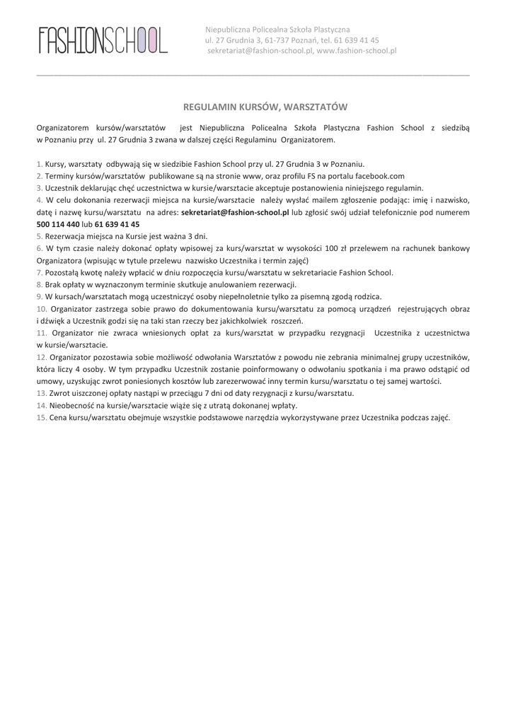 Niepubliczna Policealna Szkoła Plastyczna ul. 27 Grudnia 3, 61-737 Poznań, tel. 61 639 41 45 [email protected], www.fashion-school.pl _____________________________________________________________________________________________________ REGULAMIN KURSÓW, WARSZTATÓW Organizatorem kursów/warsztatów jest Niepubliczna Policealna Szkoła Plastyczna Fashion School z siedzibą w Poznaniu przy ul. 27 Grudnia 3 zwana w dalszej części Regulaminu Organizatorem. 1. Kursy, warsztaty odbywają się w siedzibie Fashion School przy ul. 27 Grudnia 3 w Poznaniu. 2. Terminy kursów/warsztatów publikowane są na stronie www, oraz profilu FS na portalu facebook.com 3. Uczestnik deklarując chęć uczestnictwa w kursie/warsztacie akceptuje postanowienia niniejszego regulamin. 4. W celu dokonania rezerwacji miejsca na kursie/warsztacie należy wysłać mailem zgłoszenie podając: imię i nazwisko, datę i nazwę kursu/warsztatu na adres: [email protected] lub zgłosić swój udział telefonicznie pod numerem 500 114 440 lub 61 639 41 45 5. Rezerwacja miejsca na Kursie jest ważna 3 dni. 6. W tym czasie należy dokonać opłaty wpisowej za kurs/warsztat w wysokości 100 zł przelewem na rachunek bankowy Organizatora (wpisując w tytule przelewu nazwisko Uczestnika i termin zajęć) 7. Pozostałą kwotę należy wpłacić w dniu rozpoczęcia kursu/warsztatu w sekretariacie Fashion School. 8. Brak opłaty w wyznaczonym terminie skutkuje anulowaniem rezerwacji. 9. W kursach/warsztatach mogą uczestniczyć osoby niepełnoletnie tylko za pisemną zgodą rodzica. 10. Organizator zastrzega sobie prawo do dokumentowania kursu/warsztatu za pomocą urządzeń rejestrujących obraz i dźwięk a Uczestnik godzi się na taki stan rzeczy bez jakichkolwiek roszczeń. 11. Organizator nie zwraca wniesionych opłat za kurs/warsztat w przypadku rezygnacji Uczestnika z uczestnictwa w kursie/warsztacie. 12. Organizator pozostawia sobie możliwość odwołania Warsztatów z powodu nie zebrania minimalnej grupy uczestników, która liczy 4 osoby. W tym przypadku Uczestnik zostanie poinformowany o odwołaniu spotkania i ma prawo odstąpić od umowy, uzyskując zwrot poniesionych kosztów lub zarezerwować inny termin kursu/warsztatu o tej samej wartości. 13. Zwrot uiszczonej opłaty nastąpi w przeciągu 7 dni od daty rezygnacji z kursu/warsztatu. 14. Nieobecność na kursie/warsztacie wiąże się z utratą dokonanej wpłaty. 15. Cena kursu/warsztatu obejmuje wszystkie podstawowe narzędzia wykorzystywane przez Uczestnika podczas zajęć.