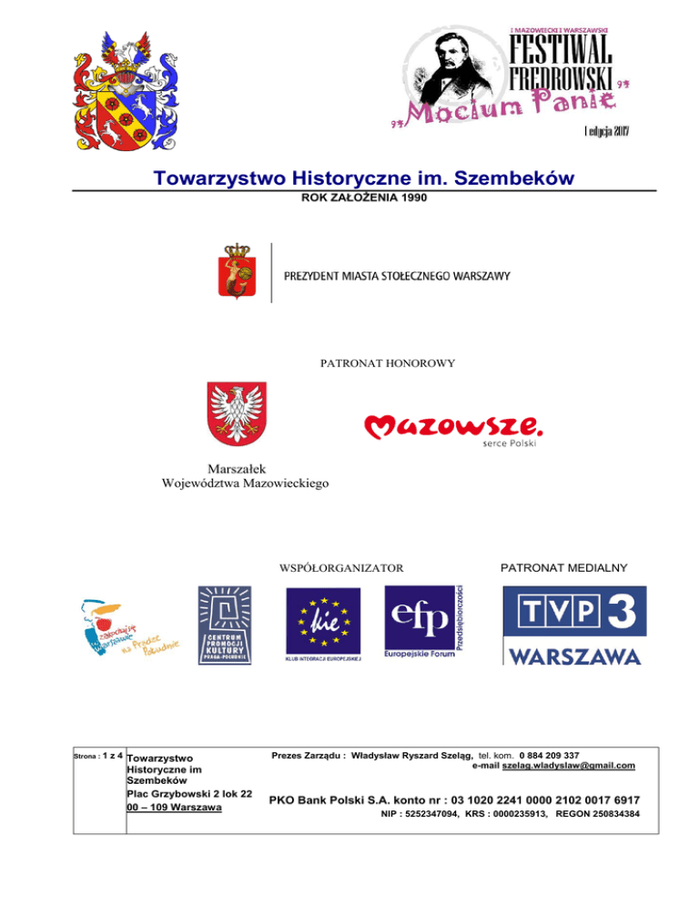 Towarzystwo Historyczne im. Szembeków ROK ZAŁOŻENIA 1990 PATRONAT HONOROWY Marszałek Województwa Mazowieckiego WSPÓŁORGANIZATOR Strona : 1 z 4 Towarzystwo Historyczne im Szembeków Plac Grzybowski 2 lok 22 00 – 109 Warszawa PATRONAT MEDIALNY Prezes Zarządu : Władysław Ryszard Szeląg, tel. kom. 0 884 209 337 e-mail [email protected] PKO Bank Polski S.A. konto nr : 03 1020 2241 0000 2102 0017 6917 NIP : 5252347094, KRS : 0000235913, REGON 250834384 Regulamin Festiwalu Fredrowskiego ,,Mocium Panie” poświęconego pamięci Andrzeja Łapickiego, organizowanego przez Towarzystwo Historyczne im. Szembeków w Warszawie pod hasłem „Warszawskie ślady Aleksandra hr. Fredry”. I. Organizatorzy 1. Organizatorem Festiwalu jest Towarzystwo Historyczne im. Szembeków w Warszawie. 2. Współorganizatorem Festiwalu jest Klub Integracji Europejskiej. II. Patroni Festiwalu 1. Patronat nad Festiwalem sprawują: Prezydent Miasta Stołecznego Warszawy Hanna Gronkiewicz-Waltz, Prezes Klubu Integracji Europejskiej Pani Barbara Jończyk, Samorząd Województwa Mazowieckiego, Marszałek Województwa Mazowieckiego Pan Adam Struzik, Przewodniczący Sejmiku Województwa Mazowieckiego Pan Ludwik Rakowski, Burmistrz Dzielnicy Praga-Południe Tomasz Kucharski. III. Dyrekcja 1. Dyrektorem Festiwalu jest Prezes Towarzystwa Historycznego im. Szembeków Pan Władysław Ryszard Szeląg. Dyrektorem Artystycznym jest Katarzyna Kobylarz. 1. 2. 3. 4. IV. Cele i zadania Festiwalu Głównym Celem Festiwalu jest inspirowanie młodych ludzi do twórczych poszukiwań, rozwijania swoich zainteresowań i talentów, wiedzy historycznej, doskonalenia umiejętności artystycznych, szerzenia kultury żywego słowa oraz zachęcenie młodzieży do spędzenia wolnego czasu, obcując z kulturą. Ukazanie postaci Aleksandra hr. Fredry od strony nie tylko artystycznej, ale od często zapomnianej strony historycznej. Przypomnienie wielkiego komediopisarza, żołnierza Księstwa Warszawskiego oraz wojen napoleońskich. Uświadomienie młodzieży historii lokalnej – Aleksander hr. Fredro brał udział w walkach o Księstwo Warszawskie w wojskach napoleońskich w 1807-1815 roku. Był członkiem Towarzystwa Przyjaciół Nauk w Warszawie. Celem dodatkowym Festiwalu jest aktywizacja młodzieżowych teatrów amatorskich i środowiska młodzieżowego oraz propagowanie piękna polskiego teatru i literatury Aleksandra hr. Fredry. V. Warunki uczestnictwa w Festiwalu 1. Warunkiem uczestnictwa jest zadeklarowanie udziału w Festiwalu Fredrowskim „Mocium Panie” do 31 marca 2017 r. Zgłoszenie będzie do pobrania na stronie internetowej http://www.festiwalmociumpanie.pl/ oraz fb https://www.facebook.com/KlubMalarzy im.Artysty Malarza Stanisława Feliksa Hrabiego Szembeka 2. Podmiotami uprawnionymi do zgłoszenia są szkoły podstawowe, gimnazja, szkoły ponadgimnazjalne oraz domy, centra kultury i szkoły artystyczne. Strona 2 z 4 TOWARZYSTWO HISTORYCZNE im. SZEMBEKÓW W WARSZAWIE 3. Festiwal przeznaczony jest dla młodzieży i dorosłych w wieku od 9 do 20 lat. W wyjątkowych, uzasadnionych przypadkach organizator zastrzega sobie prawo do dopuszczenia do udziału osób nie spełniających kryterium wieku. 4. Zespoły będą oceniane w trzech kategoriach wiekowych: 9-12 lat, 13-16 lat, 17-20 lat. W wyjątkowych, uzasadnionych przypadkach organizator zastrzega sobie możliwość dopuszczenia do udziału osób starszych lub młodszych od kryteriów w danej kategorii wiekowej – np. jeśli liczba starszych uczestników w danym zespole nie jest większa niż 30% całego zespołu. 5. Warunkiem uczestnictwa jest przygotowanie widowiska teatralnego inspirowanego twórczością Aleksandra hr. Fredry, nagranie występu i przesłanie organizatorem w dowolnej formie video. Organizator nie poddaje ocenie jakości video ani techniki, w jakiej video zostało wykonane. Ocenie podlegają elementy uwzględnione w pkt. 9. Regulaminu. 6. Czas trwania widowiska teatralnego nie może być krótszy niż 20 minut i dłuższy niż 30 minut. VI. Przebieg wyboru laureata Festiwalu Uczestnicy deklarują swój udział i dokonują zgłoszenia uczestnictwa do 31 marca 2017 roku na karcie zgłoszenia, opracowanej przez organizatorów Festiwalu. Jury dokona wyboru 12 laureatów (po 4 z każdej kategorii wiekowej) na podstawie przesłanych prezentacji w czasie Festiwalu Fredrowskiego „Mocium Panie” do 30 kwietnia 2017 roku. Laureaci zostaną zaproszeni na finał Festiwalu, który odbędzie się w maju 2017 roku. O terminie i miejscu Gali Finałowej Festiwalu zainteresowani zostaną poinformowani pisemnie. Spośród 12 laureatów zostanie wyłonionych 3 (z każdej kategorii wiekowej 1) podczas Gali Finałowej. Uczestnicy (laureaci Festiwalu) przyjeżdżają na koszt własny. Odpowiedzialność za nieletnich uczestników Festiwalu spoczywa na podmiotach zgłaszających ich udział. 1. 2. 3. 4. 5. 6. 7. 1. 2. 3. 4. Strona 3 z 4 VII. Jury Jury liczy 3 członków, osób posiadających dużą wiedzę i doświadczenie w dziedzinie przedstawień teatralnych. W skład Jury wchodzą zasłużeni ludzie kultury, sztuki w Polsce. W jury półfinału będzie uczestniczył: Prof. Lech Śliwonik, prof. Jarosław Gajewski i aktorka Laura Łącz. W jury Finału będzie uczestniczył: Prof. Lech Śliwonik, prof. Jarosław Gajewski oraz znana aktorka Anna Nechrebecka-Byczewska. Jury powołuje organizator Festiwalu. Obradom przewodniczy Przewodniczący Jury. Jury może wyznaczyć Zastępcę Przewodniczącego. Koszty związane z pracami Jury ponosi organizator. TOWARZYSTWO HISTORYCZNE im. SZEMBEKÓW W WARSZAWIE VIII. Wymagania formalne 1. Deklaracje uczestnictwa w Festiwalu należy [email protected] lub pocztą na adres: Towarzystwo Historyczne im. Szembeków Plac Grzybowski 2/22 00-109 Warszawa składać pod adresem IX. Gala finałowa i nagrody 1. Nagrodą główną w Festiwalu jest wystawienie przez 3 laureatów spektaklu na gali finałowej, która odbędzie się w maju 2017 roku w 