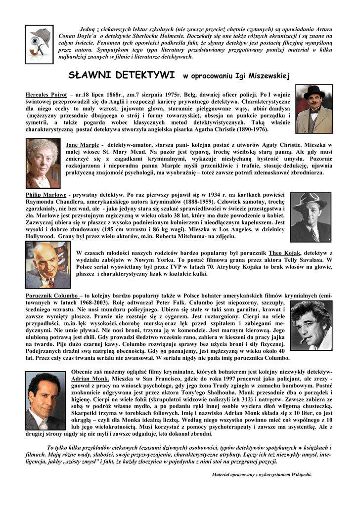 Jedną z ciekawszych lektur szkolnych (nie zawsze przecież chętnie czytanych) są opowiadania Artura Conan Doyle`a o detektywie Sherlocku Holmesie. Doczekały się one także różnych ekranizacji i są znane na całym świecie. Fenomen tych opowieści podkreśla fakt, że słynny detektyw jest postacią fikcyjną wymyśloną przez autora. Sympatykom tego typu literatury przedstawiamy przygotowany poniżej materiał o kilku najbardziej znanych w filmie i literaturze detektywach. SŁAWNI DETEKTYWI w opracowaniu Igi Miszewskiej Hercules Poirot – ur.18 lipca 1868r., zm.7 sierpnia 1975r. Belg, dawniej oficer policji. Po I wojnie światowej przeprowadził się do Anglii i rozpoczął karierę prywatnego detektywa. Charakterystyczne dla niego cechy to mały wzrost, jajowata głowa, starannie pielęgnowane wąsy, ubiór dandysa (mężczyzny przesadnie dbającego o strój i formy towarzyskie), obsesja na punkcie porządku i symetrii, a także pogarda wobec klasycznych metod detektywistycznych. Taką właśnie charakterystyczną postać detektywa stworzyła angielska pisarka Agatha Christie (1890-1976). Jane Marple - detektyw-amator, starsza pani- kolejna postać z utworów Agaty Christie. Mieszka w małej wiosce St. Mary Mead. Na pozór jest typową, trochę wścibską starą panną. Ale gdy musi zmierzyć się z zagadkami kryminalnymi, wykazuje niesłychaną bystrość umysłu. Pozornie rozkojarzona i nieporadna panna Marple myśli przenikliwie i trafnie, stosuje dedukcję, ujawnia praktyczną znajomość psychologii, ma wyobraźnię – toteż zawsze potrafi zdemaskować zbrodniarza. Philip Marlowe - prywatny detektyw. Po raz pierwszy pojawił się w 1934 r. na kartkach powieści Raymonda Chandlera, amerykańskiego autora kryminałów (1888-1959). Człowiek samotny, trochę zgorzkniały, nie bez wad, ale - jako jedyny stara się szukać sprawiedliwości w świecie przestępstwa i zła. Marlowe jest przystojnym mężczyzną w wieku około 38 lat, który ma duże powodzenie u kobiet. Zazwyczaj ubiera się w płaszcz z wysoko podniesionym kołnierzem i nieodłącznym kapeluszem. Jest wysoki i dobrze zbudowany (185 cm wzrostu i 86 kg wagi). Mieszka w Los Angeles, w dzielnicy Hollywood. Grany był przez wielu aktorów, m.in. Roberta Mitchuma- na zdjęciu. W czasach młodości naszych rodziców bardzo popularny był porucznik Theo Kojak, detektyw z wydziału zabójstw w Nowym Yorku. To postać filmowa grana przez aktora Telly Savalasa. W Polsce serial wyświetlany był przez TVP w latach 70. Atrybuty Kojaka to brak włosów na głowie, płaszcz i charakterystyczny lizak w kształcie kulki. Porucznik Columbo – to kolejny bardzo popularny także w Polsce bohater amerykańskich filmów krymialnych (emitowanych w latach 1968-2003). Rolę odtwarzał Peter Falk. Columbo jest niepozorny, szczupły, średniego wzrostu. Nie nosi munduru policyjnego. Ubiera się stale w taki sam garnitur, krawat i zawsze wymięty płaszcz. Prawie nie rozstaje się z cygarem. Jest roztargniony. Cierpi na wiele przypadłości, m.in. lęk wysokości, chorobę morską oraz lęk przed szpitalem i zabiegami medycznymi. Nie umie pływać. Nie nosi broni, trzyma ją w komendzie. Jest marnym kierowcą. Jego ulubioną potrawą jest chili. Gdy prowadzi śledztwo wcześnie rano, zabiera w kieszeni do pracy jajka na twardo. Pije dużo czarnej kawy. Columbo rozwiązuje sprawy bez użycia broni i siły fizycznej. Podejrzanych drażni swą natrętną obecnością. Gdy go poznajemy, jest mężczyzną w wieku około 40 lat. Przez cały czas trwania serialu nie awansował. W serialu nigdy nie pada imię porucznika Columbo. Obecnie zaś możemy oglądać filmy kryminalne, których bohaterem jest kolejny niezwykły detektywAdrian Monk. Mieszka w San Francisco, gdzie do roku 1997 pracował jako policjant, ale zrezy gnował z pracy na wniosek psychologa, gdy jego żona Trudy zginęła w zamachu bombowym. Postać znakomicie odgrywana jest przez aktora Tony'ego Shalhouba. Monk przesadnie dba o porządek i higienę. Cierpi na wiele fobii (skrupulatni widzowie naliczyli ich 312) i natręctw. Zawsze zabiera ze sobą w podróż własne mydło, a po podaniu ręki innej osobie wyciera dłoń wilgotną chusteczką. Skarpetki trzyma w torebkach foliowych. Imię i nazwisko Adrian Monk składa się z 10 liter, co jest okrągłą – czyli dla Monka idealną liczbą. Według niego wszystko powinno mieć coś wspólnego z 10 lub jego wielokrotnością. Musi korzystać z pomocy psychoterapeuty i zawsze ma asystentkę. Ale z drugiej strony nigdy się nie myli i zawsze odgaduje, kto dokonał zbrodni. To tylko kilka przykładów ciekawych (czasami dziwnych) osobowości, typów detektywów spotykanych w książkach i filmach. Mają różne wady, słabości, swoje przyzwyczajenia, charakterystyczne atrybuty. Łączy ich też niezwykły umysł, inteligencja, jakby „szósty zmysł” i fakt, że każdy złoczyńca w pojedynku z nimi stoi na przegranej pozycji. Materiał opracowany z wykorzystaniem Wikipedii.
