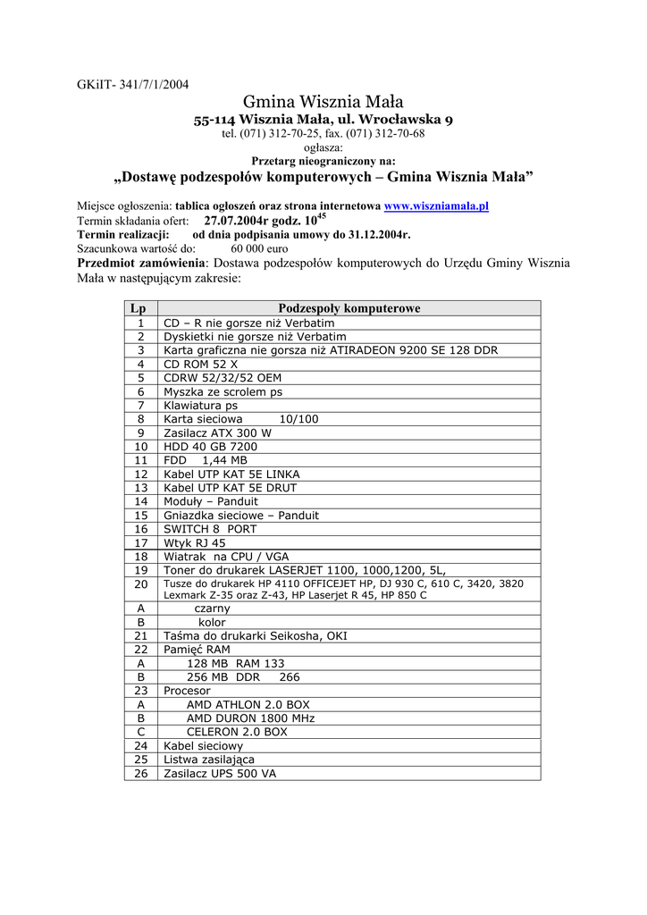 GKiIT- 341/7/1/2004 Gmina Wisznia Mała 55-114 Wisznia Mała, ul. Wrocławska 9 tel. (071) 312-70-25, fax. (071) 312-70-68 ogłasza: Przetarg nieograniczony na: „Dostawę podzespołów komputerowych – Gmina Wisznia Mała” Miejsce ogłoszenia: tablica ogłoszeń oraz strona internetowa www.wiszniamala.pl 45 Termin składania ofert: 27.07.2004r godz. 10 Termin realizacji: od dnia podpisania umowy do 31.12.2004r. Szacunkowa wartość do: 60 000 euro Przedmiot zamówienia: Dostawa podzespołów komputerowych do Urzędu Gminy Wisznia Mała w następującym zakresie: Lp 1 2 3 4 5 6 7 8 9 10 11 12 13 14 15 16 17 18 19 20 A B 21 22 A B 23 A B C 24 25 26 Podzespoły komputerowe CD – R nie gorsze niż Verbatim Dyskietki nie gorsze niż Verbatim Karta graficzna nie gorsza niż ATIRADEON 9200 SE 128 DDR CD ROM 52 X CDRW 52/32/52 OEM Myszka ze scrolem ps Klawiatura ps Karta sieciowa 10/100 Zasilacz ATX 300 W HDD 40 GB 7200 FDD 1,44 MB Kabel UTP KAT 5E LINKA Kabel UTP KAT 5E DRUT Moduły – Panduit Gniazdka sieciowe – Panduit SWITCH 8 PORT Wtyk RJ 45 Wiatrak na CPU / VGA Toner do drukarek LASERJET 1100, 1000,1200, 5L, Tusze do drukarek HP 4110 OFFICEJET HP, DJ 930 C, 610 C, 3420, 3820 Lexmark Z-35 oraz Z-43, HP Laserjet R 45, HP 850 C czarny kolor Taśma do drukarki Seikosha, OKI Pamięć RAM 128 MB RAM 133 256 MB DDR 266 Procesor AMD ATHLON 2.0 BOX AMD DURON 1800 MHz CELERON 2.0 BOX Kabel sieciowy Listwa zasilająca Zasilacz UPS 500 VA Nie dopuszcza się możliwości złożenia oferty wariantowej. Nie dopuszcza się możliwości składania ofert częściowych. Kryteria wyboru ofert i ich znaczenie: cena - 100% Specyfikację istotnych warunków zamówienia (cena: 10 zł) można odebrać w siedzibie Zamawiającego, pok.: 3 lub za zaliczeniem pocztowym. Uprawnieni do kontaktów w oferentami w godz. 09:00 14:30 są: Joanna Ilków [email protected] tel.: 0-71 312-70-25 wew. 46 Dariusz Kubacki [email protected] tel.: 0-71 312-70-25 wew. 44 Oferty należy składać w siedzibie Zamawiającego – Urząd Gminy Wisznia Mała ul. Wrocławska 9 w pok. nr 3 (na parterze). Koperta powinna być oznaczona: OFERTA PRZETARGOWA „Dostawę podzespołów komputerowych – Gmina Wisznia Mała” UWAGA : NIE OTWIERAĆ PRZED DNIEM 27.07.2004r godz. 11 00 Termin otwarcia ofert 27.07.2004 rok godz.1100 w sali narad Urzędu Gminy. Każdy uczestnik przetargu pozostaje związany ofertą przez okres 30 dni. Bieg terminu związania ofertą rozpoczyna się wraz z upływem terminu składania ofert. Wadium nie jest wymagane. W przetargu mogą wziąć udział oferenci: - niewykluczeni na podstawie art. 24 ust.1 i 2 ustawy z dnia 29.01.2004r.Prawo zamówień publicznych (Dz. U. z 2004r. Nr 19, poz. 177) - spełniają wymagania art. 22 ust. 1 ww. ustawy - spełniają wymogi określone w SIWZ. Wisznia Mała, 06.07.2004r