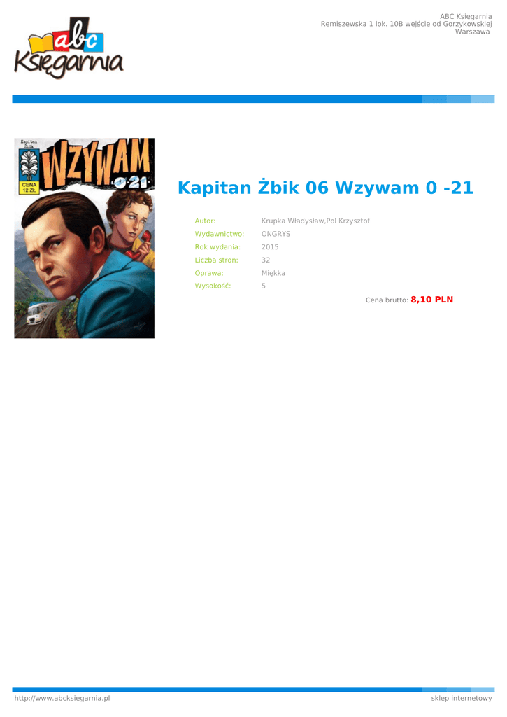 ABC Księgarnia Remiszewska 1 lok. 10B wejście od Gorzykowskiej Warszawa Kapitan Żbik 06 Wzywam 0 -21 Autor: Krupka Władysław,Pol Krzysztof Wydawnictwo: ONGRYS Rok wydania: 2015 Liczba stron: 32 Oprawa: Miękka Wysokość: 5 Cena brutto: http://www.abcksiegarnia.pl 8,10 PLN sklep internetowy