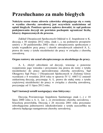 Przesłuchano za mało biegłych Należyta ocena stanu zdrowia człowieka ubiegającego się o rentę w wyniku choroby zawodowej jest oczywiście uzależniona od opinii biegłych. Poniższa sprawa sądowa dowodzi, że sąd podczas podejmowania decyzji nie powinien pochopnie ograniczać liczbę lekarzy dopuszczonych do procesu. Zakład Ubezpieczeń Społecznych Oddział w Z. Inspektorat w K. decyzją z 30 sierpnia 2012 roku, znak (...), na podstawie przepisów ustawy z 30 października 2002 roku o ubezpieczeniu społecznym z tytułu wypadków przy pracy i chorób zawodowych odmówił A. Ł. prawa do renty z tytułu niezdolności do pracy w związku z chorobą zawodową. Organ rentowy nie uznał ubezpieczonego za niezdolnego do pracy. A. Ł. złożył odwołanie od decyzji, wnosząc o ponowne rozpatrzenie jego wniosku i przyznanie mu prawa do renty z tytułu niezdolności do pracy spowodowanej chorobą zawodową. Sąd Okręgowy Sąd Pracy i Ubezpieczeń Społecznych w Zielonej Górze wyrokiem z 8 września 2014 roku w sprawie IV U. 4487/12 zmienił zaskarżoną decyzję, przyznając A. Ł. prawo do stałej renty z tytułu częściowej niezdolności do pracy w związku z chorobą zawodową, poczynając od 11 lipca 2012 roku. Sąd I instancji ustalił następujący stan faktyczny: Decyzją Powiatowego Inspektora Sanitarnego znak (...) z 10 lipca 2000 roku u A. Ł. (ur. (...)) stwierdzono chorobę zawodową brucelozę przewlekłą. Decyzją z 26 stycznia 2001 roku przyznano odwołującemu jednorazowe odszkodowanie z tytułu uszczerbku na zdrowiu będącego następstwem choroby zawodowej. Lekarz orzecznik ZUS uznał odwołującego za osobę zdolną do pracy. Komisja Lekarska ZUS podtrzymała stanowisko lekarza orzecznika ZUS. 30 sierpnia 2012 roku organ rentowy wydał decyzję o odmowie prawa do renty w związku z chorobą zawodową. W postępowaniu sądowym została sporządzona opinia lekarska w której biegły lekarz stwierdził nietypowy przebieg choroby zawodowej (bruceloza przewlekła, przebiegająca w sposób sinusoidalny). Po za tym, lekarz nie stwierdził u odwołującego objęcia stanem chorobowym szeregu narządów - co jest charakterystyczne dla tej choroby. Za najbardziej prawdopodobną przyczynę złego stanu zdrowia uznał zmiany zwyrodnieniowe, połączone w obrębie kręgosłupa z dyskopatią. Biegły stwierdził, że zmiany chorobowe nie wynikają z brucelozy przewlekłej i że w związku z chorobą zawodową odwołujący jest zdolny do pracy. W opinii lekarskiej z 15 kwietnia 2013 roku inny biegły sądowy, powołany w związku z zastrzeżeniami zgłoszonymi przez odwołującego, stwierdził, że rozpoznana bruceloza wskazuje na przewlekły charakter procesu. Biegły stwierdza, iż można u odwołującego uznać niezdolność do pracy, gdyż większość dolegliwości chorobowych jest związana z przedmiotową chorobą. Sąd dokonując analizy materiału dowodowego zebranego w przedmiotowej sprawie, podczas wydawania orzeczenia, nie przychylił się do opinii biegłego lekarza sądowego P. B. uznając ją za niejasną w dostatecznym stopniu. Przyczyną takiego stanowiska Sądu był fakt potwierdzenia chorobowego stanu odwołującego mającego bezpośredni związek z chorobą zawodową wynikający zarówno z licznego materiału dowodowego w postaci badań medycznych zgromadzonych w sprawie ale przede wszystkim opierając się na opiniach odmiennych od w/w aż dwóch biegłych sądowych (z P. i z W.), których ze względu na zawiłości i specjalistyczną wiedzę medyczną Sąd uznał za koniecznych do powołania w niniejszej sprawie. Sąd Okręgowy wyjaśnił także, że oddalił wniosek organu rentowego o przeprowadzenie kolejnych opinii biegłych, z uwagi na wystarczające wyjaśnienie spornych kwestii. Sąd oparł swe orzeczenie na dwóch zbieżnych, logicznych i szczegółowych opiniach biegłych lekarzy specjalistów chorób zakaźnych uznając, że opinia biegłego dr Piotra Bogusławskiego, specjalisty chorób zakaźnych nie zasługuje na uwzględnienie. Organ rentowy zaskarżył wyrok w całości składając apelację wnosząc o uchylenie zaskarżonego wyroku i przekazanie sprawy Sądowi I instancji do ponownego rozpatrzenia. Sąd Apelacyjny ustalił ,że apelacja okazała się zasadna. Odwołujący domagał się przyznania prawa do renty z tytułu niezdolności do pracy w związku z chorobą zawodową. Prawo to zostało przewidziane w ustawie z 30 października 2002 roku o ubezpieczeniu społecznym z tytułu wypadków przy pracy i chorób zawodowych. (...) Uzasadniając sformułowane w apelacji zarzuty, organ rentowy podniósł, że w piśmie procesowym zawarł wniosek o dopuszczenie dowodu z opinii biegłych lekarzy ortopedy, neurologa, laryngologa i psychiatry, jako że biegła w opinii uzupełniającej jasno wskazała, iż nie jest właściwa do określenia stopnia uszkodzenia układu ruchu, układu nerwowego, narządu słuchu, czy też zaburzeń psychicznych u odwołującego. Apelujący zaznaczył, że w przypadku odwołującego niezdolność do pracy w związku z chorobą zawodową musi być jednoznacznie określona, w sytuacji występowania u niego powikłań z innych powodów. Sąd I instancji oddalając wniosek pozwanego o opinię biegłych lekarzy ortopedy, neurologa, laryngologa i psychiatry uniemożliwił wyjaśnienie wszystkich istotnych okoliczności. W sprawie zdaniem skarżącego, nie dokonano pełnego ustalenia stopnia ograniczenia sprawności organizmu w przebiegu choroby zawodowej i jednoznacznego wskazania przeważającego tła dolegliwości. (...) Sąd Apelacyjny w wyniku kontroli instancyjnej orzeczenia uznał, że argumentacja organu rentowego jest w znacznej części uzasadniona. Występowanie u odwołującego samej choroby zawodowej nie było przedmiotem sporu. Przypomnieć trzeba, że ZUS przyznał odwołującemu jednorazowe odszkodowanie z tytułu uszczerbku na zdrowiu będącego następstwem choroby zawodowej.(...) Słusznie ZUS podniósł,