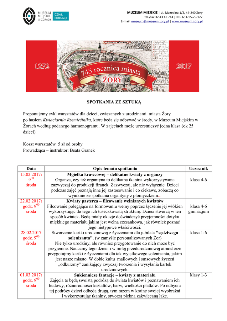 MUZEUM MIEJSKIE | ul. Muzealna 1/2, 44-240 Żory tel./fax 32 43 43 714 | NIP 651-15-79-122 E-mail: [email protected] | www.muzeum.zory.pl SPOTKANIA ZE SZTUKĄ Proponujemy cykl warsztatów dla dzieci, związanych z urodzinami miasta Żory po hasłem Kwiaciarnia Rzemieślnika, które będą się odbywać w środy, w Muzeum Miejskim w Żorach według podanego harmonogramu. W zajęciach może uczestniczyć jedna klasa (ok 25 dzieci). Koszt warsztatów 5 zł od osoby Prowadząca – instruktor: Beata Granek Data 15.02.2017r 900 środa 22.02.2017r godz. 900 środa 28.02.2017 godz. 900 środa 01.03.2017r godz. 900 środa Opis tematu spotkania Mgiełka krawcowej – delikatne kwiaty z organzy Organza, czy też organtyna to delikatna tkanina wykorzystywana zazwyczaj do produkcji firanek. Zazwyczaj, ale nie wyłącznie. Dzieci podczas zajęć poznają inne jej zastosowanie i co ciekawe, zobaczą co wyniknie ze spotkania organtyny z płomyczkiem... Kwiaty pasterza – filcowanie wełnianych kwiatów Filcowanie polegające na formowaniu wełny poprzez łączenie jej włókien wykorzystując do tego ich łuseczkowatą strukturę. Dzieci stworzą w ten sposób kwiatek. Będą miały okazję doświadczyć przyjemności dotyku miękkiego materiału jakim jest wełna czesankowa, jak również poznać jego nietypowe właściwości. Stworzenie kartki urodzinowej z życzeniami dla jubilata "sędziwego solenizanta". (w zamyśle personalizowanych Żor) Nie tylko urodziny, ale również przygotowanie do nich może być przyjemne. Nauczmy tego dzieci i w miłej przedurodzinowej atmosferze przygotujmy kartki z życzeniami dla tak wyjątkowego solenizanta, jakim jest nasze miasto. W dobie kultu mailowych i smsowych życzeń „odkurzmy” zanikający zwyczaj tworzenia i wysyłania kartek urodzinowych. Sukiennicze fantazje – kwiaty z materiału Zajęcia te będą swoistą podróżą do świata kwiatów i poznawaniem ich budowy, różnorodności kształtów, barw, wielkości płatków. Po odbyciu tej podróży dzieci odbędą drugą, tym razem w krainę swojej wyobraźni i wykorzystując tkaniny, stworzą piękną zakwiecaną łąkę. Uczestnik klasa 4-6 klasa 4-6 gimnazjum klasa 1-6 klasy 1-3 08.03.2017r godz. 900 środa 22.03.2017r godz. 900 środa klasa 1-3 Kwiaty japońskiej fryzjerki –kanzashi Czy kwiaty, czy też ich płatki można zrobić jedynie poprzez wycinanie, czy tez rzeźbienie odpowiednich materiałów? A gdyby tak poskładać coś… wstążki, tkaniny. Czy uda się„ poskładać” płatek? Spróbujmy … i zapraszamy na zajęcia. przedszkole Bukiet rzeźbiarza – kwiaty z modeliny Ach, któż nie zna modeliny? Ale czy znamy ją naprawdę, czy jest to tylko klasa 1-3 znajomość powierzchowna? Odpowiedź na te pytania poznamy podczas zajęć. Dowiemy się, co tak naprawdę modelina potrafi i przy okazji stworzymy piękne kwiaty. Zgłoszenia: Muzeum Miejskiego w Żorach tel. 32 43 43 714 wew. 201 Jadwiga Tabor kierownik Działu Edukacji Muzeum Miejskiego w Żorach i doradca metodyczny Urszula Niechoj doradca metodyczny