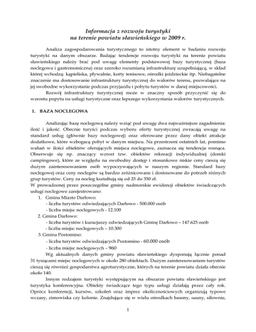 Informacja z rozwoju turystyki na terenie powiatu sławieńskiego w 2009 r. Analiza zagospodarowania turystycznego to istotny element w badaniu rozwoju turystyki na danym obszarze. Badając tendencje rozwoju turystyki na terenie powiatu sławieńskiego naleŜy brać pod uwagę elementy podstawowej bazy turystycznej (baza noclegowa i gastronomiczna) oraz szeroko rozumianą infrastrukturę uzupełniającą, w skład której wchodzą: kąpieliska, pływalnie, korty tenisowe, ośrodki jeździeckie itp. Niebagatelne znaczenie ma dostosowanie infrastruktury turystycznej do walorów terenu, pozwalające na jej swobodne wykorzystanie podczas przyjazdu i pobytu turystów w danej miejscowości. Rozwój infrastruktury turystycznej moŜe w znaczny sposób przyczynić się do wzrostu popytu na usługi turystyczne oraz lepszego wykorzystania walorów turystycznych. 1. BAZA NOCLEGOWA Analizując bazę noclegową naleŜy wziąć pod uwagę dwa najwaŜniejsze zagadnienia: ilość i jakość. Obecnie turyści podczas wyboru oferty turystycznej zwracają uwagę na standard usług (głównie bazy noclegowej) oraz oferowane przez dany obiekt atrakcje dodatkowe, które wzbogacą pobyt w danym miejscu. Na przestrzeni ostatnich lat, pomimo wahań w ilości obiektów oferujących miejsca noclegowe, zaznacza się tendencja rosnąca. Obserwuje się np. znaczący wzrost tzw. obiektów rekreacji indywidualnej (domki campingowe), które ze względu na swobodny dostęp i stosunkowe niskie ceny cieszą się duŜym zainteresowaniem osób wypoczywających w naszym regionie. Standard bazy noclegowej oraz ceny noclegów są bardzo zróŜnicowane i dostosowane do potrzeb róŜnych grup turystów. Ceny za nocleg kształtują się od 25 do 350 zł. W prowadzonej przez poszczególne gminy nadmorskie ewidencji obiektów świadczących usługi noclegowe zarejestrowano: 1. Gmina Miasto Darłowo: - liczba turystów odwiedzających Darłowo - 500.000 osób - liczba miejsc noclegowych - 12.100 2. Gmina Darłowo: - liczba turystów i kuracjuszy odwiedzających Gminę Darłowo – 147.625 osób - liczba miejsc noclegowych – 10.300 3. Gmina Postomino: - liczba turystów odwiedzających Postomino - 60.000 osób - liczba miejsc noclegowych – 960 Wg aktualnych danych gminy powiatu sławieńskiego dysponują łącznie ponad 31 tysiącami miejsc noclegowych w około 280 obiektach. DuŜym zainteresowaniem turystów cieszą się równieŜ gospodarstwa agroturystyczne, których na terenie powiatu działa obecnie około 140. Innym rodzajem turystyki występującym na obszarze powiatu sławieńskiego jest turystyka konferencyjna. Obiekty świadczące tego typu usługi działają przez cały rok. Oprócz konferencji, kursów, szkoleń oraz imprez okolicznościowych organizują typowe wczasy, zimowiska czy kolonie. Znajdujące się w wielu ośrodkach baseny, sauny, siłownie, 1 boiska do gier zespołowych czy korty tenisowe pozwalają aktywnie spędzić czas między wykładami. Wśród szerokiej gamy ośrodków moŜemy wyróŜnić równieŜ ośrodki o profilu zdrowotno-rehabilitacyjnym, które prowadzą działalność sanatoryjną (masaŜe, bicze wodne, kriokomory, gimnastyka usprawniająca, odnowa biologiczna, itp.). W większości ośrodki te są przystosowane do potrzeb osób niepełnosprawnych. (np. Sanatorium „Panorama Morska” w Jarosławcu, OW „Geovita” w Dąbkach czy Hotel „Lidia” w Darłówku). Warto wspomnieć równieŜ o pozostałych pensjonatach i obiektach agroturystycznych, które są nastawione i przygotowane do obsługi turystów aktywnych (wędkarstwo, grzybobranie, turystyka kwalifikowana - quady, samochody terenowe, turystyka militarna, spływy kajakowe, turystyka konna i rowerowa). NaleŜy podkreślić, Ŝe rozwój turystyki zorganizowanej: zielone szkoły, obozy sportowe, turnusy rehabilitacyjne, szkolenia, konferencje oraz imprezy integracyjne dla firm są czynnikiem przyczyniającym się do wydłuŜenia sezonu turystycznego na terenie powiatu. Liczba miejsc noclegowych jest jednym z istotniejszych mierników potencjału turystycznego. Decyduje o chłonności turystycznej i determinuje wielkość ruchu turystycznego. 2. BAZA GASTRONOMICZNA Baza gastronomiczna jest drugim, obok bazy noclegowej, podstawowym elementem zagospodarowania turystycznego. Nie ma tak duŜego znaczenia jak baza noclegowa - nie jest główną determinantą wielkości ruchu, jednak moŜe wpływać na jego intensyfikację. Na terenie powiatu sławieńskiego funkcjonują całoroczne, samodzielne obiekty gastronomiczne. Poza sezonem letnim turyści mają szanse skorzystać z oferty gastronomicznej w niektórych obiektach hotelarskich i barach. Mocną stroną istniejących lokali jest fakt wykorzystywania morskich elementów w wystroju lokalu oraz nawiązywanie do tej kultury poprzez odpowiednie menu np. świeŜa kuchnia morska w sezonie zimowym. WaŜnym elementem działalności dla firm prowadzących lokale gastronomiczne są usługi cateringowe. 3. OBSŁUGA TURYSTÓW – SYSTEM INFORMACJI TURYSTYCZNEJ Powiatowy system informacji turystycznej opiera się na 3 gminnych punktach informacji turystycznej: Centrum IT w Urzędzie Miejskim w Darłowie, IT w Gminnym Ośrodku Sportu i Rekreacji w Dąbkach oraz IT przy ul. Nadmorskiej w Jarosławcu. Z danych uzyskanych z poszczególnych urzędów gmin, liczba turystów korzystających z usług punktów IT w 2009 r. przedstawiała się następująco: • Darłowo - ok. 12.000 osób • Jarosławiec – ok. 7.000 osób • Dąbki – ok. 2.500 osób 2 Na stronach internetowych poszczególnych gmin powiatu sławieńskiego znajdują się odniesienia do linków, umoŜliwiające zapoznanie się z waŜnymi i ciekawymi informacjami dla potencjalnych turystów, w tym: – bieŜącej informacji dla osób przyjezdnych na temat walorów turystycznych, bazy noclegowej i moŜliwości recepcyjnych na terenie powiatu, – aktualnym stanem bazy turystycznej, noclegowej i gastronomicznej, – planowanych na terenie powia