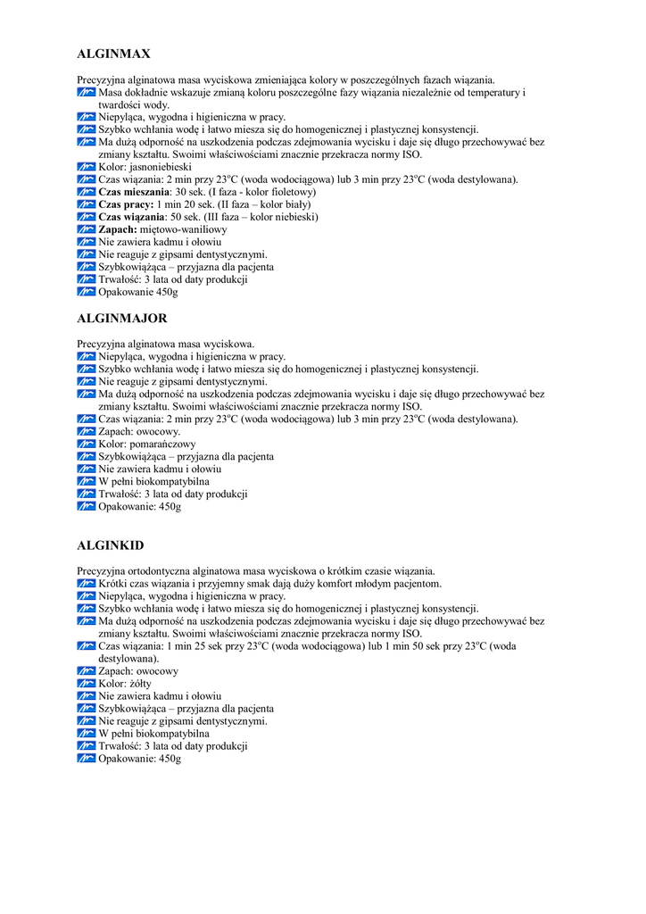 ALGINMAX Precyzyjna alginatowa masa wyciskowa zmieniająca kolory w poszczególnych fazach wiązania. Masa dokładnie wskazuje zmianą koloru poszczególne fazy wiązania niezależnie od temperatury i twardości wody. Niepyląca, wygodna i higieniczna w pracy. Szybko wchłania wodę i łatwo miesza się do homogenicznej i plastycznej konsystencji. Ma dużą odporność na uszkodzenia podczas zdejmowania wycisku i daje się długo przechowywać bez zmiany kształtu. Swoimi właściwościami znacznie przekracza normy ISO. Kolor: jasnoniebieski Czas wiązania: 2 min przy 23oC (woda wodociągowa) lub 3 min przy 23oC (woda destylowana). Czas mieszania: 30 sek. (I faza - kolor fioletowy) Czas pracy: 1 min 20 sek. (II faza – kolor biały) Czas wiązania: 50 sek. (III faza – kolor niebieski) Zapach: miętowo-waniliowy Nie zawiera kadmu i ołowiu Nie reaguje z gipsami dentystycznymi. Szybkowiążąca – przyjazna dla pacjenta Trwałość: 3 lata od daty produkcji Opakowanie 450g ALGINMAJOR Precyzyjna alginatowa masa wyciskowa. Niepyląca, wygodna i higieniczna w pracy. Szybko wchłania wodę i łatwo miesza się do homogenicznej i plastycznej konsystencji. Nie reaguje z gipsami dentystycznymi. Ma dużą odporność na uszkodzenia podczas zdejmowania wycisku i daje się długo przechowywać bez zmiany kształtu. Swoimi właściwościami znacznie przekracza normy ISO. Czas wiązania: 2 min przy 23oC (woda wodociągowa) lub 3 min przy 23oC (woda destylowana). Zapach: owocowy. Kolor: pomarańczowy Szybkowiążąca – przyjazna dla pacjenta Nie zawiera kadmu i ołowiu W pełni biokompatybilna Trwałość: 3 lata od daty produkcji Opakowanie: 450g ALGINKID Precyzyjna ortodontyczna alginatowa masa wyciskowa o krótkim czasie wiązania. Krótki czas wiązania i przyjemny smak dają duży komfort młodym pacjentom. Niepyląca, wygodna i higieniczna w pracy. Szybko wchłania wodę i łatwo miesza się do homogenicznej i plastycznej konsystencji. Ma dużą odporność na uszkodzenia podczas zdejmowania wycisku i daje się długo przechowywać bez zmiany kształtu. Swoimi właściwościami znacznie przekracza normy ISO. Czas wiązania: 1 min 25 sek przy 23oC (woda wodociągowa) lub 1 min 50 sek przy 23oC (woda destylowana). Zapach: owocowy Kolor: żółty Nie zawiera kadmu i ołowiu Szybkowiążąca – przyjazna dla pacjenta Nie reaguje z gipsami dentystycznymi. W pełni biokompatybilna Trwałość: 3 lata od daty produkcji Opakowanie: 450g ALGINPLUS FAST Bardzo precyzyjna alginatowa masa wyciskowa zmieniająca kolory w poszczególnych fazach wiązania. Niezwykle drobna struktura. Ułatwienie i dokładność pracy dzięki zmieniającym się kolorom w poszczególnych fazach wiązania, bez względu na temperaturę i twardość wody. Niepyląca, wygodna i higieniczna w pracy. Szybko wchłania wodę i łatwo miesza się do homogenicznej i plastycznej konsystencji. Nie reaguje z gipsami dentystycznymi. Ma dużą odporność na uszkodzenia podczas zdejmowania wycisku i daje się długo przechowywać bez zmiany kształtu. Swoimi właściwościami znacznie przekracza normy ISO. Czas wiązania: Czas wiązania: 2’00’’ w 23°C Smak: owoców tropikalnych Kolor: żółty Nie zawiera kadmu i ołowiu Szybkowiążąca – przyjazna dla pacjenta Nie reaguje z gipsami dentystycznymi. W pełni biokompatybilna Duża plastycznośc i łatwość mieszania Trwałość: 6 lat od daty produkcji Opakowanie: 450g ALGENIUX Najwyższej jakości precyzyjna alginatowa masa wyciskowa, pozwalająca osiągnąć maksymalne odwzorowanie szczegółów, optymalną elastyczność i odporność na uszkodzenia podczas zdejmowania wycisku. Dzięki zastosowaniu technologii MAP (Modified Atmosphere Packaging) trwałość produktu to 6 lat od daty produkcji. Niepyląca, wygodna i higieniczna w pracy. Szybko wchłania wodę i łatwo miesza się do homogenicznej i plastycznej konsystencji. Nie reaguje z gipsami dentystycznymi. Doskonałą elastyczność i odporność na uszkodzenia podczas zdejmowania wycisku Daje się długo przechowywać bez zmiany kształtu. Swoimi właściwościami znacznie przekracza normy ISO. Czas mieszania: 35” przy 23ºC Czas pracy: 1’ 40” przy 23ºC Czas wiązania: 3’ 00” przy 23oC (woda wodociągowa). Zapach: miętowy Kolor: różowy Szybkowiążąca – przyjazna dla pacjenta Nie zawiera kadmu i ołowiu W pełni biokompatybilna Trwałość: 6 lat od daty produkcji Opakowanie: 453g