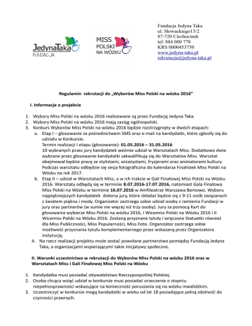 Fundacja Jedyna Taka ul. Słowackiego15/2 87-720 Ciechocinek tel: 884 000 778 KRS 0000453750 www.jedyna-taka.pl [email protected] Regulamin rekrutacji do „Wyborów Miss Polski na wózku 2016” I. Informacje o projekcie 1. Wybory Miss Polski na wózku 2016 realizowane są przez Fundację Jedyna Taka. 2. Wybory Miss Polski na wózku 2016 mają zasięg ogólnopolski. 3. Konkurs Wyborów Miss Polski na wózku 2016 będzie rozstrzygnięty w dwóch etapach: a. Etap I – głosowanie za pośrednictwem SMS oraz e-mail na kandydatki, które zgłosiły się do udziału w Konkursie. Termin realizacji I etapu (głosowanie): 01.05.2016 – 31.05.2016 10 wybranych przez jury kandydatek weźmie udział w Warsztatach Miss. Dodatkowo dwie wybrane przez głosowanie kandydatki zakwalifikują się do Warsztatów Miss. Warsztat obejmował będzie pracę ze stylistami, wizażystami, fryzjerami oraz animatorami kultury. Podczas warsztatu odbędzie się sesja fotograficzna do kalendarza Finalistek Miss Polski na Wózku na rok 2017. b. Etap II – udział w Warsztatach Miss, a w ich trakcie w Gali Finałowej Miss Polski na Wózku 2016. Warsztaty odbędą się w terminie 8.07.2016-17.07.2016, natomiast Gala Finałowa Miss Polski na Wózku w terminie 16.07.2016 w Amfiteatrze Warszawa Bemowo. Wyboru najpiękniejszych kandydatek dokona jury, które składać będzie się z 9-11 osób związanych z światem piękna i mody. Organizator zastrzega sobie udział osoby z ramienia Fundacji w jury oraz partnerów (w sumie nie więcej niż trzy osoby). Jury za pomocą Kart do głosowania wybierze Miss Polski na wózku 2016, I Wicemiss Polski na Wózku 2016 i II Wicemiss Polski na Wózku 2016. Zostaną przyznane tytuły i wręczone Statuetki również dla Miss Publiczności, Miss Popularności, Miss Foto. Organizator zastrzega sobie możliwość przyznania tytułu komplementarnego przez wskazaną przez Organizatora instytucję. 4. Na rzecz realizacji projektu może zostać powołane partnerstwo pomiędzy Fundacją Jedyna Taka, a organizacjami wspierającymi takie inicjatywy społeczne. II. Warunki uczestnictwa w rekrutacji do Wyborów Miss Polski na wózku 2016 oraz w Warsztatach Miss i Gali Finałowej Miss Polski na Wózku 1. Kandydatka musi posiadać obywatelstwo Rzeczypospolitej Polskiej. 2. Osoba chcąca wziąć udział w konkursie musi posiadać orzeczenie o stopniu niepełnosprawności wskazujące na konieczność poruszania się na wózku inwalidzkim. 3. Uczestniczyć w konkursie mogą kandydatki w wieku od lat 18 posiadające pełną zdolność do czynności prawnych. 4. Zgłoszenia do konkursu wraz ze skanami odręcznie podpisanych dokumentów i pozostałymi załącznikami należy przesyłać drogą mailową na adres: [email protected] oraz w formie papierowej na adres siedziby Fundacji Jedyna Taka: 87-720 Ciechocinek ul. Słowackiego 15/2 w terminie nieprzekraczającym 24.04.2016. Mail z nadesłanym zgłoszeniem automatycznie dodawany jest do bazy osób newsletter Fundacji Jedyna Taka 5. Zgłoszenia muszą zawierać: formularz zgłoszeniowy, oświadczenie o prawdziwości danych osobowych, zgodę na publikację fotografii i zdjęć filmowych, akceptację regulaminu konkursu, ksero orzeczenia o stopniu niepełnosprawności, 2 zdjęcia wysyłane tylko w formie elektronicznej (twarzy oraz całej sylwetki na wózku; w formacie nie mniejszym niż 800 pikseli na dłuższym boku, które zostanie użyte w I etapie konkursu wyborów Miss Polski na wózku). Zdjęcia nie mogą posiadać podpisów promujących inne działania społeczne lub zarobkowe, minimum dwuminutowe i maksimum pięciominutowe nagranie wideo w formacie avi lub mp4 lub mpg lub wmv, na którym kandydatka odpowiada na pytania: a) b) c) Nagranie nie będzie nigdzie udostępniane i pozostanie wyłącznie do wglądu Fundacji Jedyna Taka, w związku z wyborem przez jury finałowej dziesiątki. 6. Warunkiem uczestnictwa w II etapie konkursu jest podpisanie przez Finalistkę Umowy z Organizatorem konkursu, wysłanej do niej po zakończeniu etapu I. 7. Fundacja nie zapewnia transportu na warsztat oraz na Galę Finałową uczestniczkom, które przejdą do II etapu konkursu. 8. Do obowiązków Fundacji należy zapewnienie Asystentów uczestniczkom wymagającym wsparcia podczas realizacji warsztatów oraz Gali Finałowej konkursu. 9. Uczestniczki Konkursu zobowiązane są w każdych okolicznościach do godnego reprezentowania Polski, dbałości o dobre imię własne, dobre imię Organizatora i Współorganizatorów Konkursu. 10. Finalistki Miss Polski na wózku mogą brać udział w konkursie tylko raz. 11. Uczestniczki które w ubiegłorocznej edycji nie przeszły do Finału mogą brać udział w Wyborach Miss Polski na wózku 2016. III. Nagrody w Konkursie 1. Nagrodami w Konkursie są tytuły Miss określone w Regulaminie, a także nagrody rzeczowe lub pieniężne przyznane przez Organizatora, Współorganizatorów lub sponsorów Konkursu lub poszczególnych Etapów Konkursu. 2. Nagrody rzeczowe, w stosunku do których przepisy prawa przewidują powstanie obowiązku podatkowego, przyznawane są wraz z dodatkową nagrodą pieniężną w wysokości odpowiadającej równowartości 11, 11% wartości danej Nagrody. Dodatkowa nagroda pieniężna zostanie w całości przeznaczona na pokrycie należnego 10% zryczałtowanego podatku dochodowego, ustalonego od łącznej wartości nagrody rzeczowej i dodatkowej nagrody pieniężnej. 3. Nagrody nie podlegają wymianie na gotówkę ani na inne nagrody rzeczowe. 4. Od Nagród wręczonych w Konkursie, Organizator lub sponsor, jako płatnik potrąci 10% 5. 6. 7. 8. zryczałtowanego podatku dochodowego i pobrany podatek przekaże na rachunek bankowy właściwego urzędu skarbowego zgodnie z przepisami art. 30 ust. 1 pkt. 2 ustawy z dnia 26 lipca 1991 roku o podatku dochodowym od osób fizycznych (Dz.U.2012.361). Podatek od nagród rzeczowych zostanie pobrany przez Organizatora lub sponsora z dodatkowej części pieniężnej nagród.