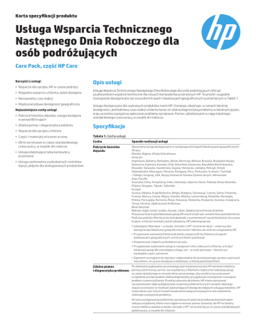 Karta specyfikacji produktu Usługa Wsparcia Technicznego Następnego Dnia Roboczego dla osób podróżujących Care Pack, część HP Care Korzyści z usługi • Wsparcie dla sprzętu HP w czasie podróży • Wygodne wsparcie u Klienta, jeżeli dostępne • Niezawodny czas reakcji • Międzynarodowa dostępność geograficzna Najważniejsze cechy usługi • Pokrycie kosztów dojazdu: usługa dostępna w ponad 80 krajach • Zdalna pomoc i diagnostyka problemu • Wsparcie dla sprzętu u Klienta Opis usługi Usługa Wsparcia Technicznego Następnego Dnia Roboczego dla osób podróżujących oferuje użytkownikom wsparcie techniczne dla nowych komputerów przenośnych HP. To proste i wygodne rozwiązanie dostępne jest we wszystkich krajach i lokalizacjach geograficznych wymienionych w Tabeli 1. Usługa dostępna jest dla wybranych produktów marki HP i Compaq i obejmuje, w ramach lokalnej dostępności, jednodniowy czas reakcji u klienta (wraz ze zdalną diagnostyką problemu w lokalnym języku kraju uczestniczącego) na zgłoszone problemy sprzętowe. Pomoc udzielana jest w ciągu lokalnego, standardowego czasu pracy, w zwykłe dni robocze. Specyfikacje • Części i materiały wliczone w cenę Tabela 1. Cechy usługi • Okno serwisowe w czasie standardowego czasu pracy, w zwykłe dni robocze Cecha Sposób realizacji usługi Pokrycie kosztów dojazdu Opisywana usługa dostępna jest w następujących krajach/lokalizacjach geograficznych: Afryka: Maroko, Nigeria, Afryka Południowa Ameryki: Argentyna, Bahamy, Barbados, Belize, Bermudy, Boliwia, Brazylia, Brytyjskie Wyspy Dziewicze, Kajmany, Kanada, Chile, Kolumbia, Kostaryka, Republika Dominikańska, Ekwador, Salwador, Gwatemala, Gujana, Honduras, Jamajka, Meksyk, Antyle Holenderskie, Nikaragua, Panama, Paragwaj, Peru, Portoryko, Surinam, Trynidad i Tobago, Urugwaj, USA, Wyspy Dziewicze Stanów Zjednoczonych, Wenezuela Azja, Pacyfik: Australia, Chiny, Hong Kong, Indie, Indonezja, Japonia, Korea, Malezja, Nowa Zelandia, Filipiny, Singapur, Tajwan, Tajlandia Europa: Austria, Albania, Kraje Bałtyckie, Belgia, Bułgaria, Chorwacja, Czechy, Dania, Finlandia, Francja, Niemcy, Grecja, Węgry, Irlandia, Włochy, Luksemburg, Holandia, Norwegia, Polska, Portugalia, Rumunia, Rosja, Słowacja, Słowenia, Hiszpania, Szwecja, Szwajcaria, Turcja, Ukraina, Zjednoczone Królestwo Bliski Wschód: Bahrajn, Egipt, Izrael, Jordan, Kuwejt, Liban, Zjednoczone Emiraty Arabskie Powyższa lista krajów/lokalizacji geograficznych może ulec zmianie bez powiadomienia. Podczas podróży Klienta przez którąkolwiek z wymienionych wyżej lokalizacji, lecz poza krajem, w którym produkt został zakupiony, HP zobowiązuje się: • Usługa obejmująca tylko komputery przenośne • Usługa zachowania uszkodzonych nośników (opcja, jedynie dla obsługiwanych produktów) •Udostępnić Klientowi – w dziale „Kontakt z HP” na stronie hp.pl – właściwy dla danego kraju/lokalizacji geograficznej numer telefonu do centrum reagowania HP. •Przyjmować wezwania Klienta lub działu wsparcia firmy Klienta w krajach/ lokalizacjach geograficznych, w których Klient podróżuje •Diagnozować stopień uszkodzenia sprzętu •Przygotować wykonanie usługi w następnym dniu roboczym u Klienta, w kraju/ lokalizacji geograficznej objętej usługą, lub – w razie potrzeby – dostarczyć niezbędne części zamienne •Zapewnić wymagane do naprawy i odpowiednie do serwisowanego sprzętu części pod warunkiem, że są one dostępne w lokalizacji, w której podróżuje Klient Po dokonaniu zgłoszenia serwisowego pod wskazanym przez HP numerem telefonu Zdalna pomoc i diagnostyka problemu pomocy technicznej, serwis, we współpracy z Klientem,rozpocznie realizację usługi, w czasie określonego w umowie okna serwisowego, aby ustalić przyczynę awarii urządzenia, przeprowadzić zdalną diagnostykę, przygotować rozwiązanie i rozwiązać problem z pomocą Klienta. Przed przybyciem do klienta, HP może zainicjować i przeprowadzić zdalną diagnostykę za pomocą elektronicznych narzędzi zdalnego wsparcia (o ile jest to możliwe) zapewniających dostęp do objętych usługą produktów. HP może także użyć innych metod świadczenia usług serwisowych w celu ułatwienia zdalnego rozwiązania problemu. W razie występowania problemów sprzętowych podczas przebywania poza krajem zakupu urządzenia, Klient musi najpierw wezwać pomoc dzwoniąc do HP na lokalny numer telefonu podany w dziale „Kontakt z HP” na stronie hp.pl, w czasie standardowych godzin pracy, w zwykłe dni robocze. Karta charakterystyki | Wsparcie dla sprzętu w miejscu instalacji Cecha Sposób realizacji usługi Wsparcie dla sprzętu u Klienta W przypadku problemów sprzętowych, które, zgodnie z oceną HP, nie mogą być rozwiązane zdalnie, autoryzowany przedstawiciel HP przyjedzie do Klienta i zapewni obsługę serwisową urządzenia objętego umową, w celu przywrócenia go do prawidłowej pracy. HP może, zgodnie z własną decyzją, zdecydować się na wymianę produktu zamiast jego naprawy. Wymienione produkty są nowe lub równoważne nowym pod względem wydajności. Wymieniony produkt staje się własnością HP. Dodatkowo, HP może zainstalować dostępne ulepszenia, aby ułatwić klientowi zapewnienie poprawnego działania sprzętu i zachowania niezbędnej zgodności z wymienionym sprzętem. HP zastrzega sobie prawo do instalacji aktualizacji firmware, które w opinii HP są wymagane do przywrócenia właściwej pracy urządzenia oraz możliwości wsparcia przez HP. Części i materiały HP dostarcza wspierane przez siebie części i materiały niezbędne do konserwacji sprzętu objętego umową i zapewnienia jego właściwej pracy, w tym części i materiały związane z dostępnymi i zalecanymi ulepszeniami. Wymienione części są nowe lub równoważne nowym pod względem wydajności. Wymienione części stają się własnością HP. Okno serwisowe Okno serwisowe oznacza przed
